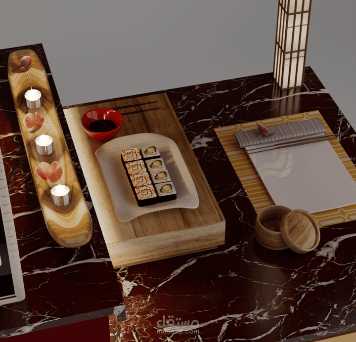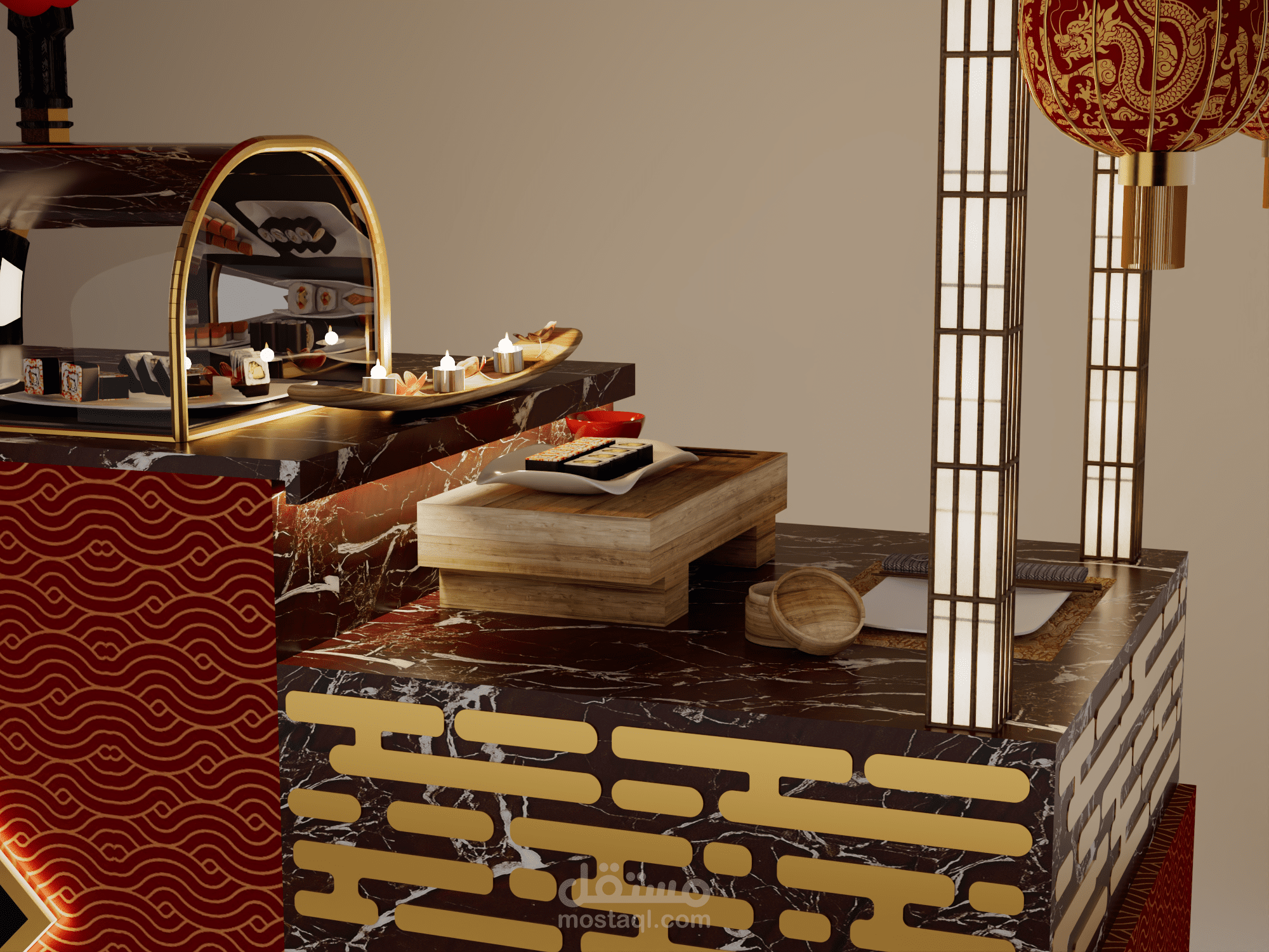 Classic Marble: A touch of historical luxury in the preparation area, suggesting cleanliness and food quality (luxury sushi).