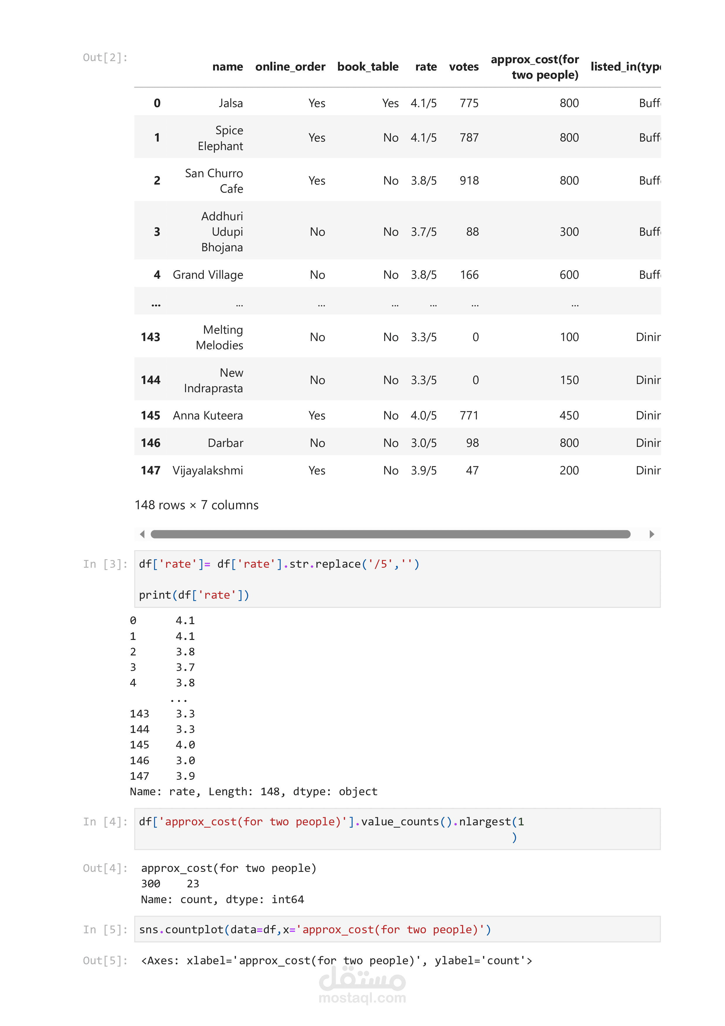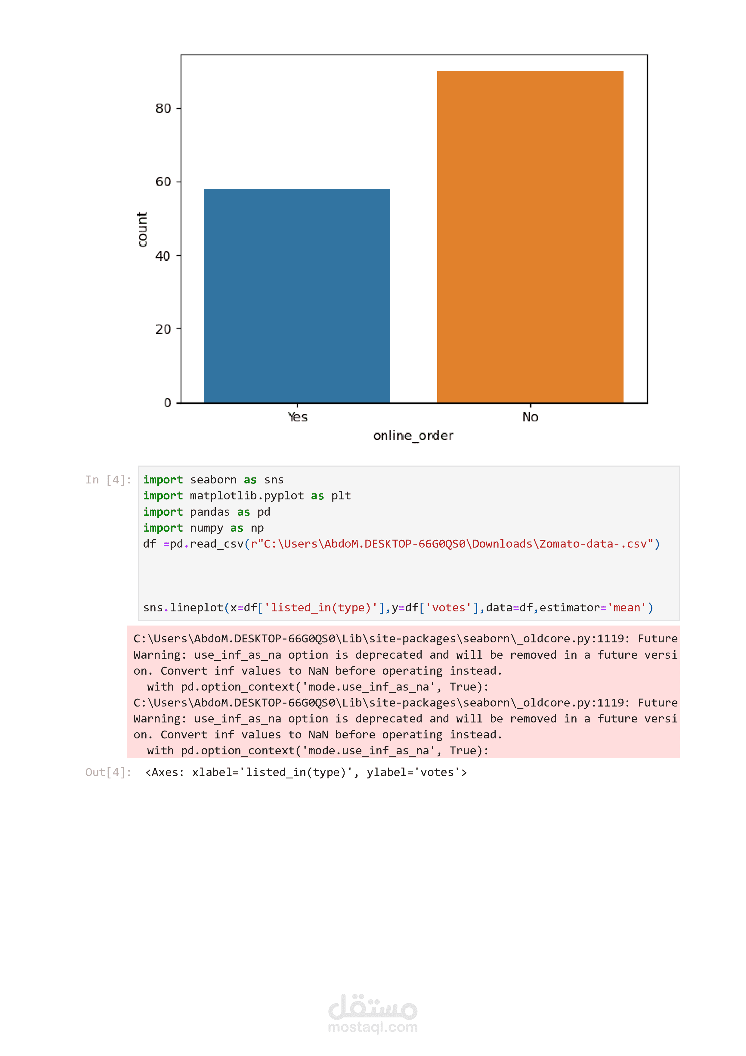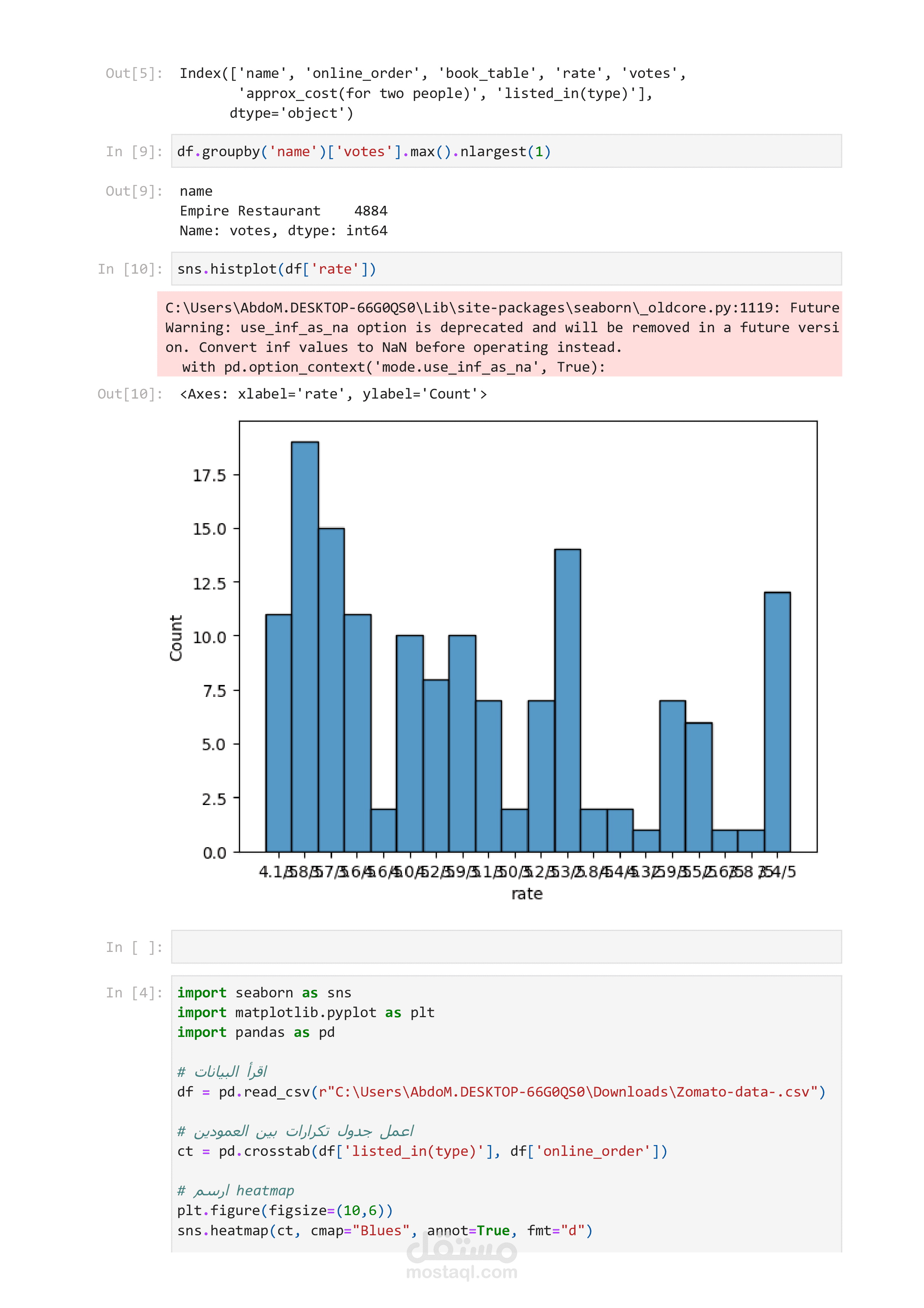 Zomato هى مجوعة مطاعم فى الهند تشمل انواع مختلفه وقد قمت بتحميل البيانات من احد المواقع الموثوقة csv ثم انتقلت لتحليلها باستخدام python-pandas-seaborn . f بدات باستكشاف البيانات باستخدامpandas.head(),pa.info(),,وباستخدام sns ثم قمت بتنظيف البيانات باستخدام df['rate']= df['rate'].str.replace('/5','') حتى تصبح الارقام كلها float من نفس النوع وقد تم استخدام sns ,pandasفى استكشاف وتحليل البيانات مثلا value_counts لاظهار عددonline_orderسواء yes or no,وكذلك استخدام cross-tabلاظهار العدد السابق ولكن لكل نوع من المطاعم على حده with order online yes or no ,وكذلك اسم المطعم الذى حصل على اعلى تصويت باستخدام df.groupby('name')['votes'].max().nlargest(1),وغيرها الكثير واضح تماما فى المرفقات ولايحتاج شرح لاننى لااجيد ذلك الامر .