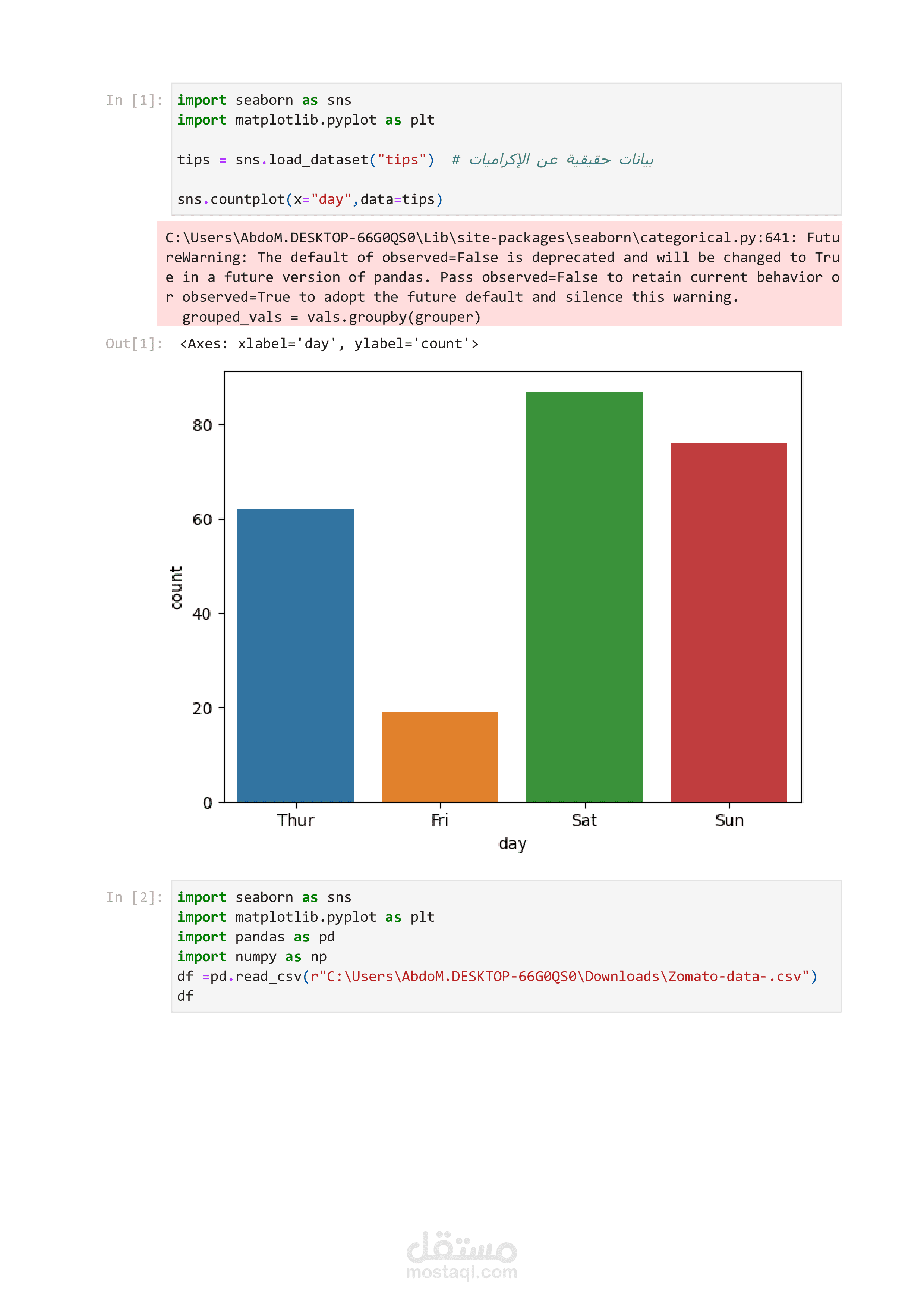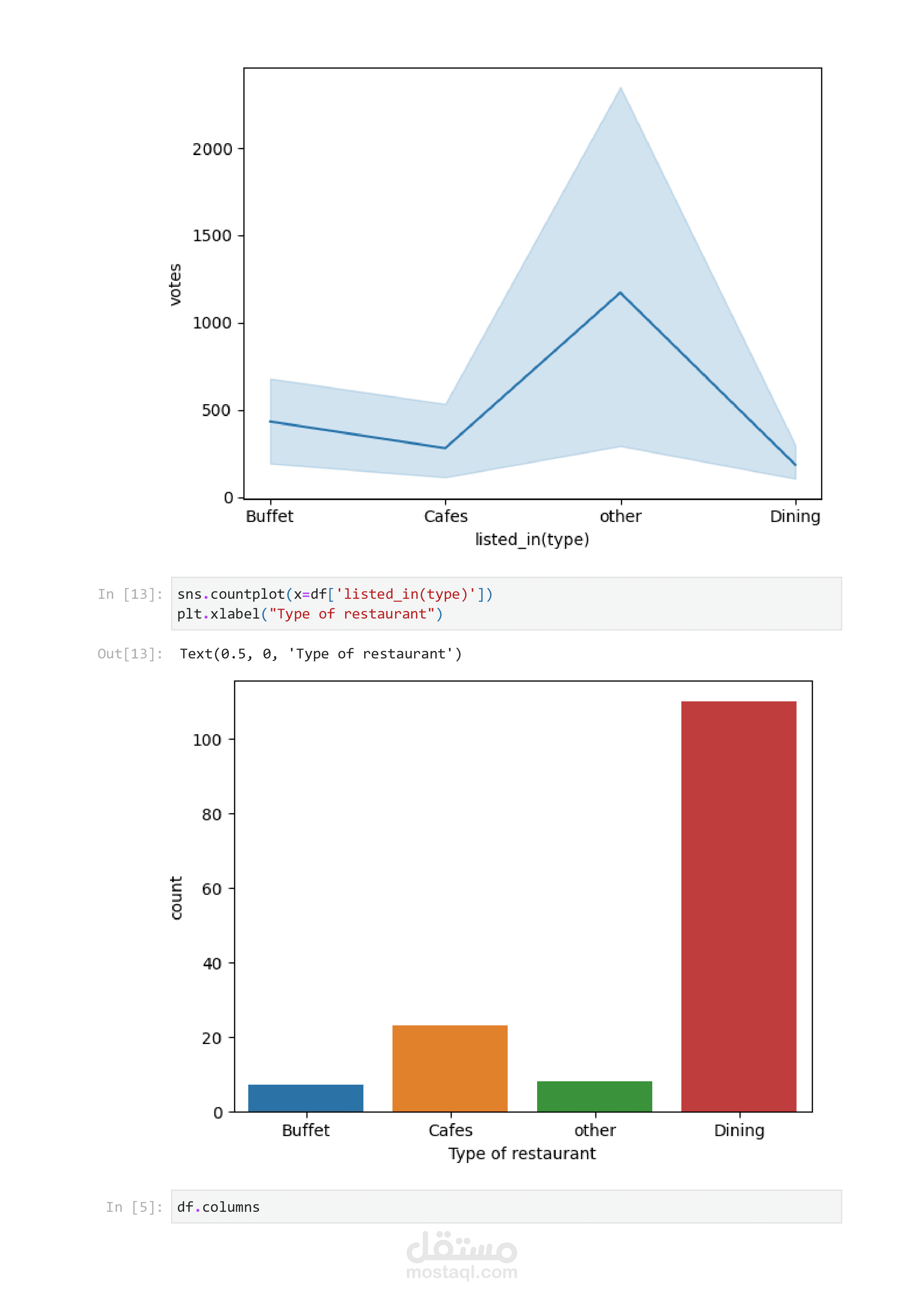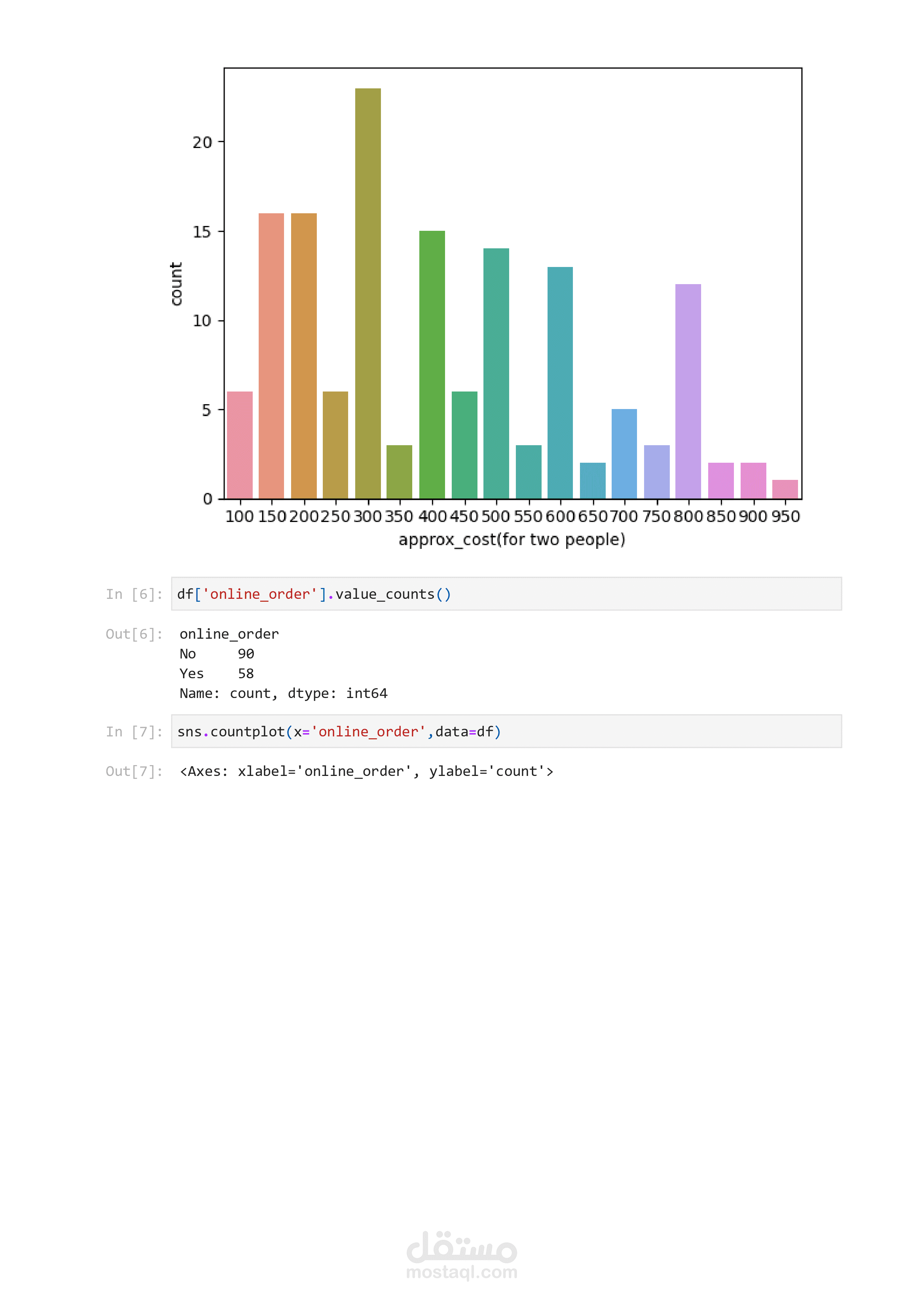 Zomato هى مجوعة مطاعم فى الهند تشمل انواع مختلفه وقد قمت بتحميل البيانات من احد المواقع الموثوقة csv ثم انتقلت لتحليلها باستخدام python-pandas-seaborn . f بدات باستكشاف البيانات باستخدامpandas.head(),pa.info(),,وباستخدام sns ثم قمت بتنظيف البيانات باستخدام df['rate']= df['rate'].str.replace('/5','') حتى تصبح الارقام كلها float من نفس النوع وقد تم استخدام sns ,pandasفى استكشاف وتحليل البيانات مثلا value_counts لاظهار عددonline_orderسواء yes or no,وكذلك استخدام cross-tabلاظهار العدد السابق ولكن لكل نوع من المطاعم على حده with order online yes or no ,وكذلك اسم المطعم الذى حصل على اعلى تصويت باستخدام df.groupby('name')['votes'].max().nlargest(1),وغيرها الكثير واضح تماما فى المرفقات ولايحتاج شرح لاننى لااجيد ذلك الامر .