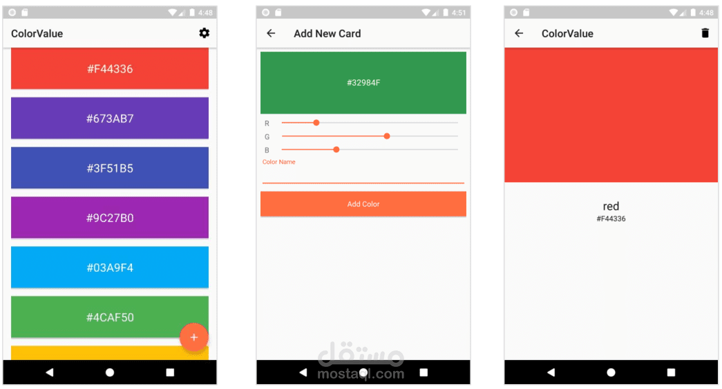 ColorValue is an Android application designed to help users create, store, and manage a personalized library of colors. The app allows users to visually generate colors using RGB sliders and persist them locally for future reference.