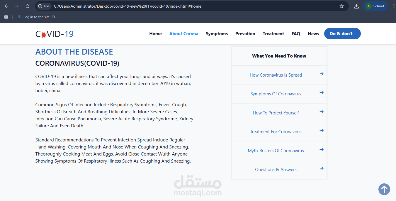 قمت بتصميم وتطوير موقع ويب توعوي حول فيروس كورونا باستخدام تقنيات HTML, CSS, وBootstrap، بهدف تقديم معلومات مبسطة وسهلة الاستخدام للمستخدمين.