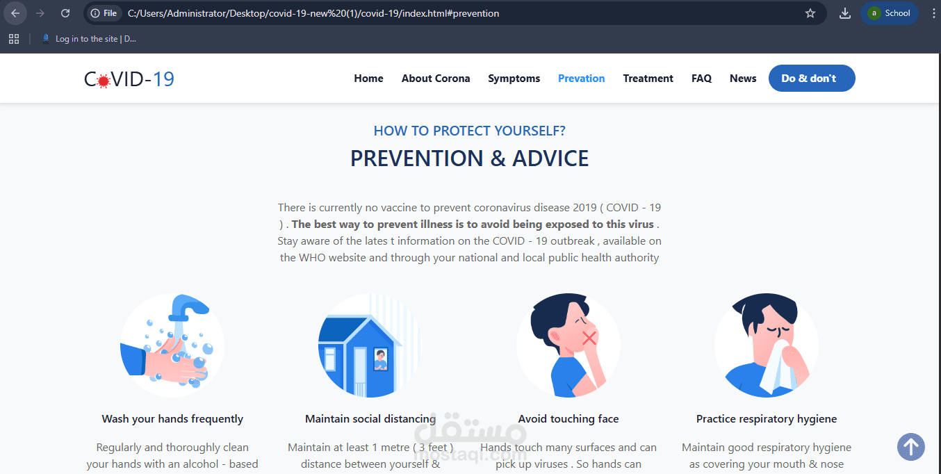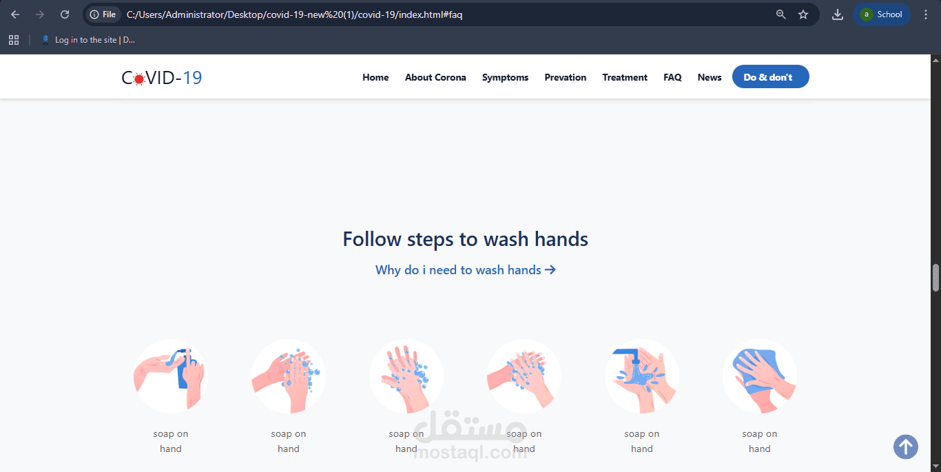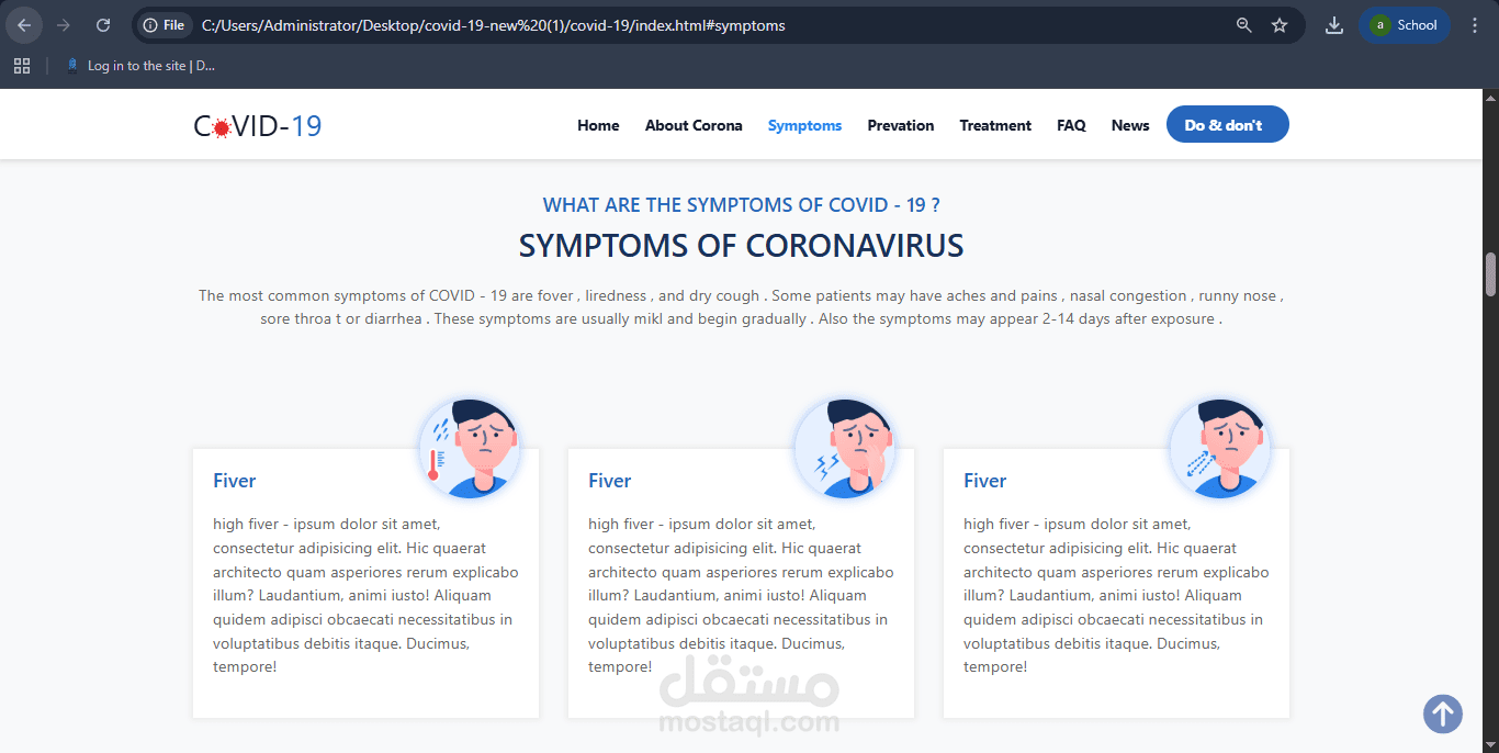 I designed and developed a responsive awareness website about COVID-19 using HTML, CSS, and Bootstrap, aiming to present clear and user-friendly information.
