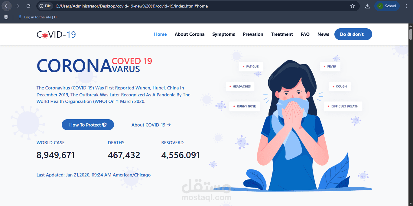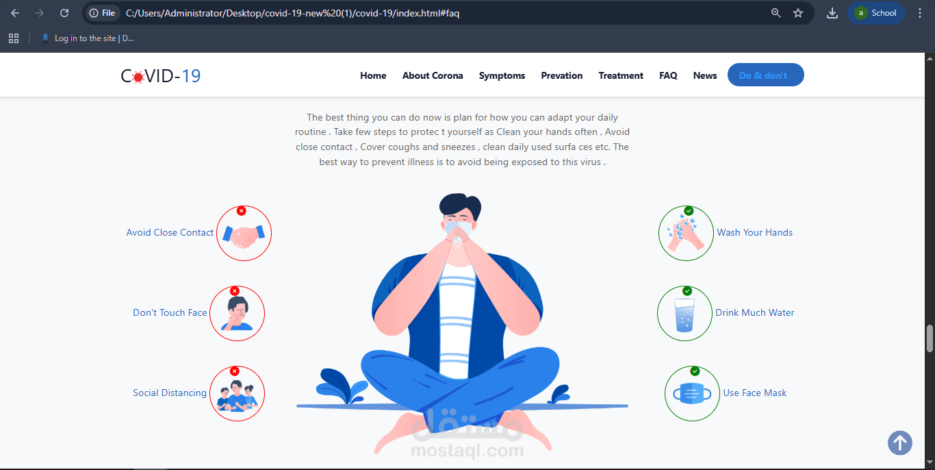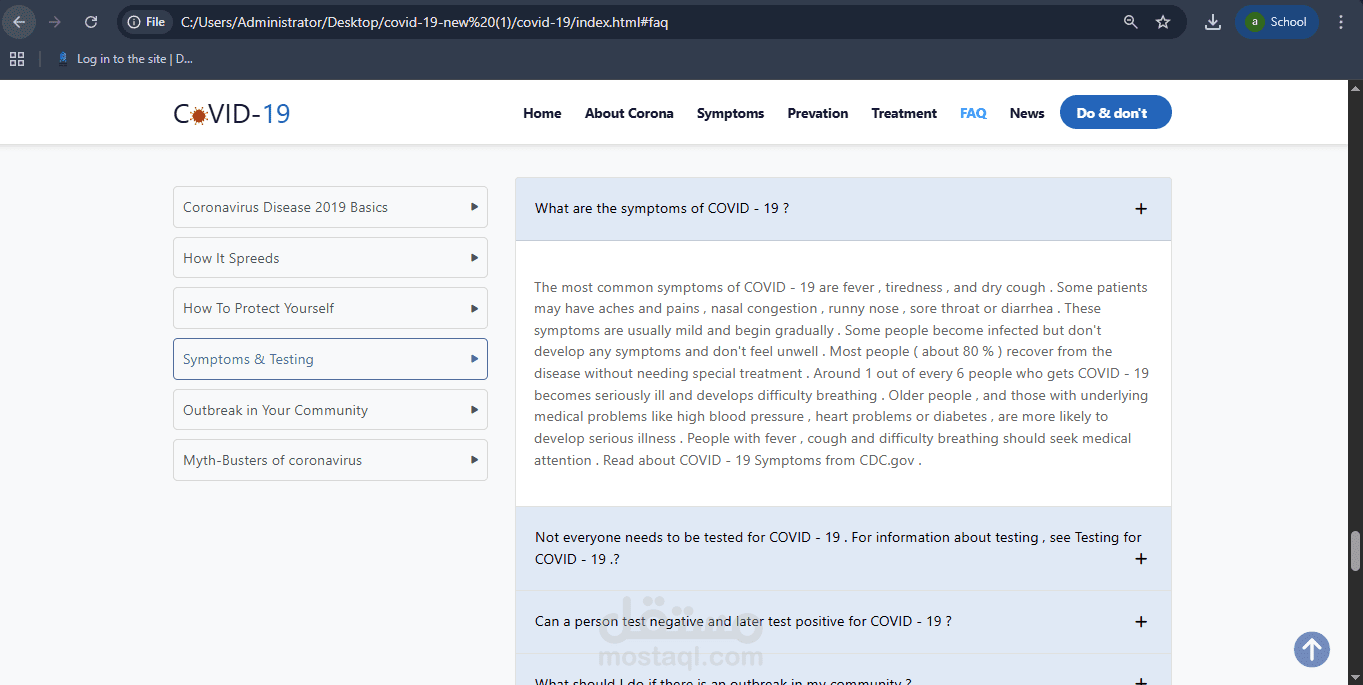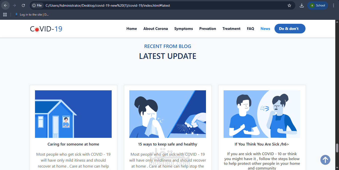 I designed and developed a responsive awareness website about COVID-19 using HTML, CSS, and Bootstrap, aiming to present clear and user-friendly information.