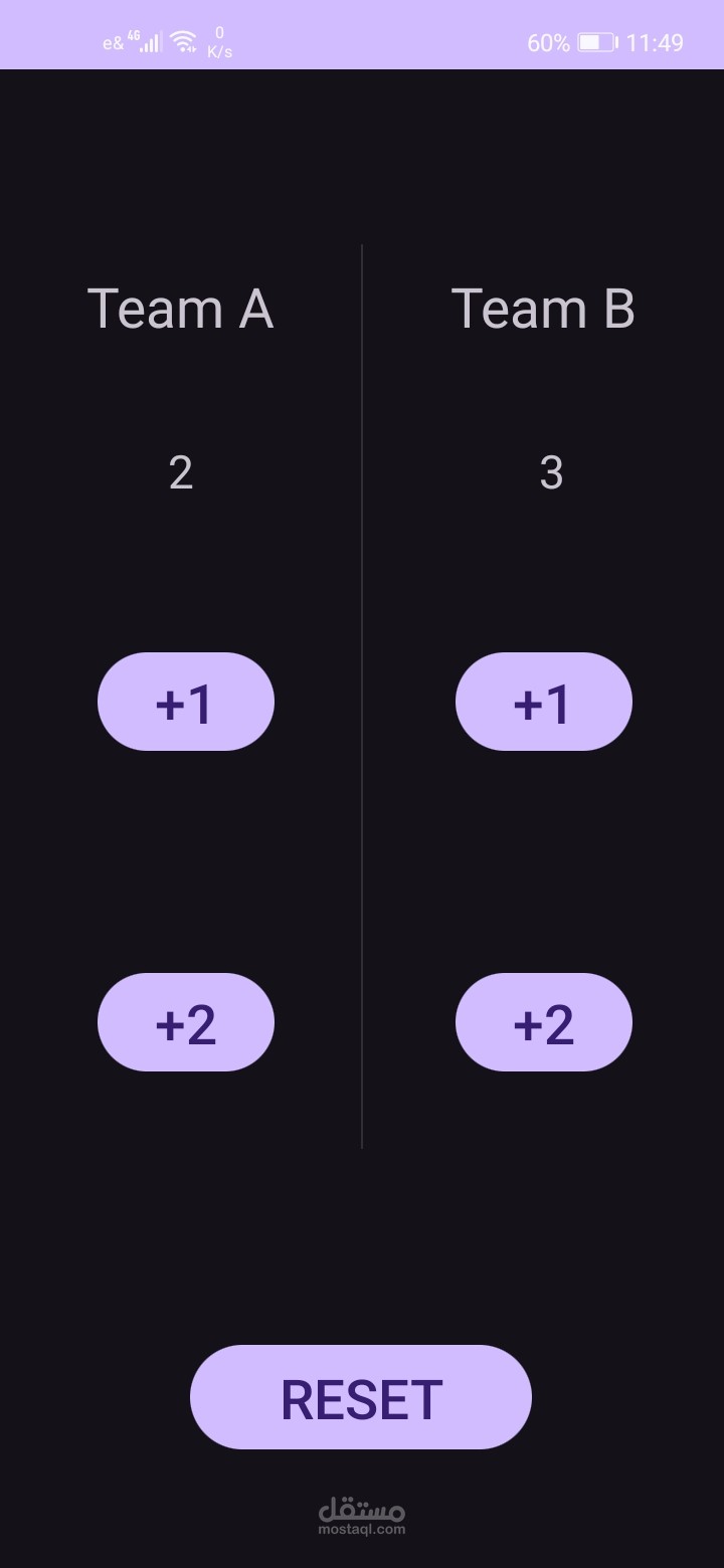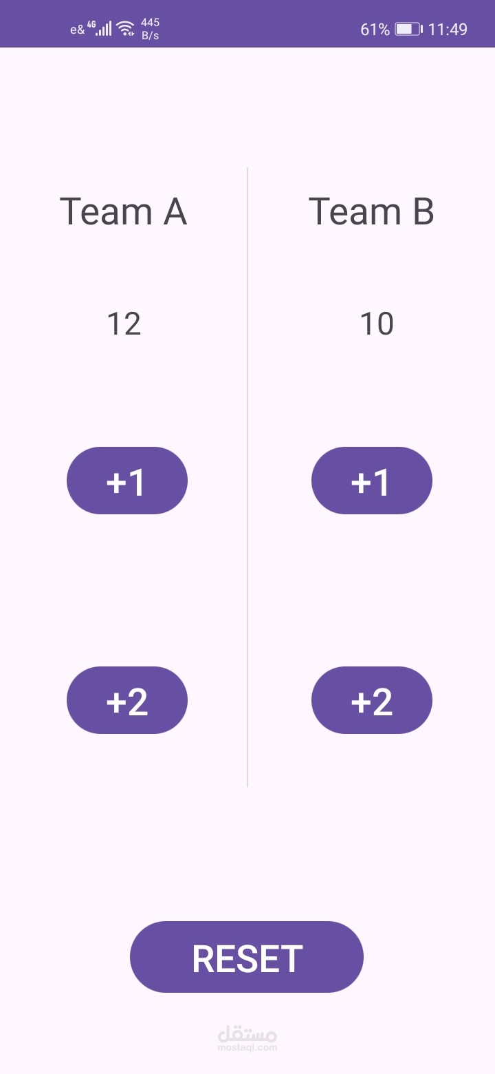 يعرض التطبيق فريقين (الفريق A والفريق B) جنبًا إلى جنب لسهولة المقارنة. يحتوي كل فريق على أزرار مخصصة لإضافة النقاط (+1 و +2)، مما يتيح تحديث النتيجة بشكل فوري أثناء اللعب. يتم عرض النتيجة الحالية بشكل واضح في المنتصف.