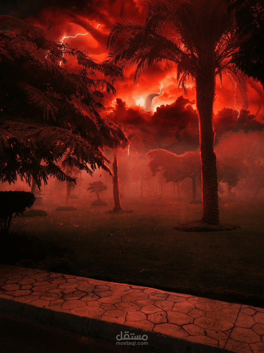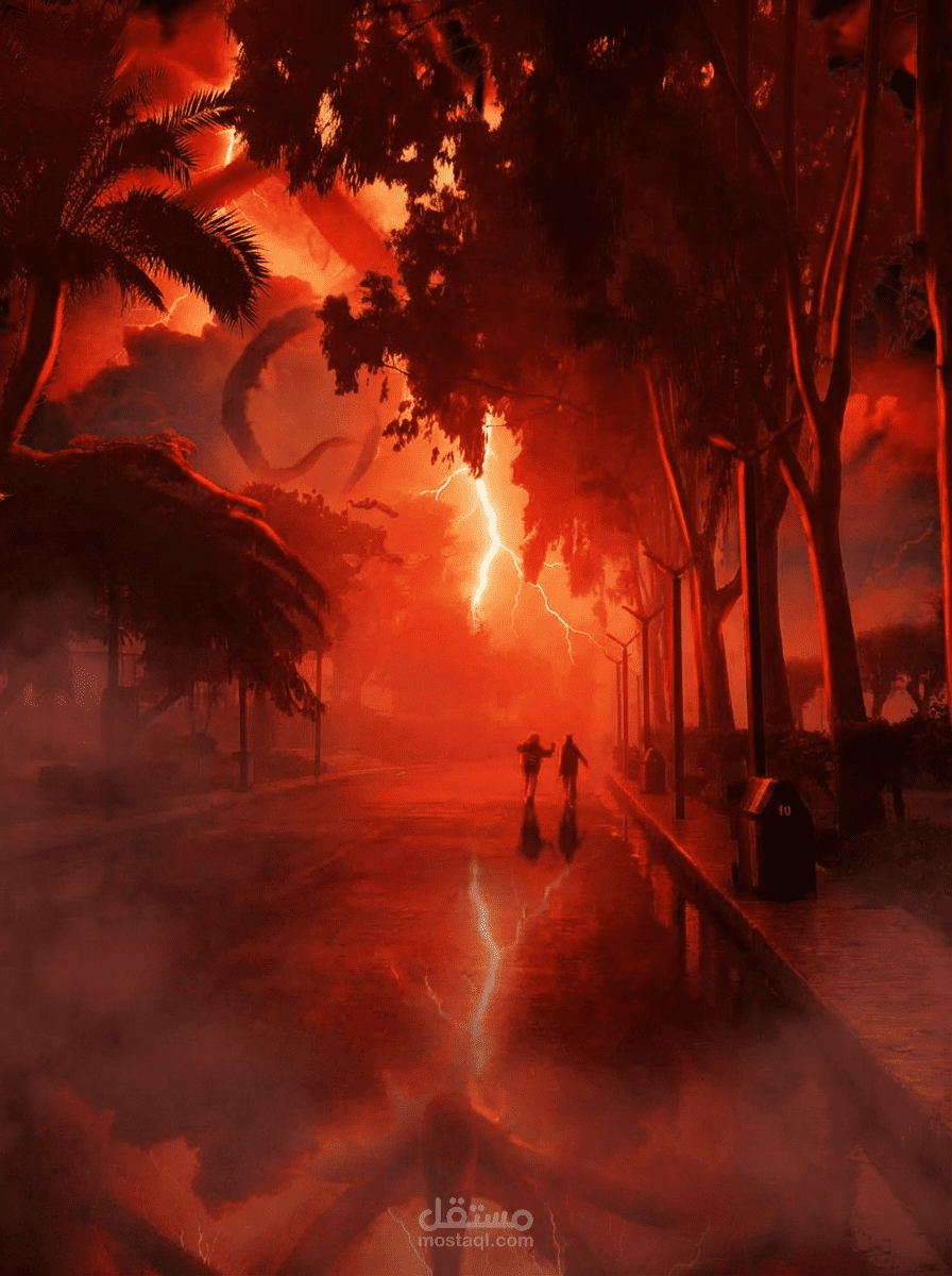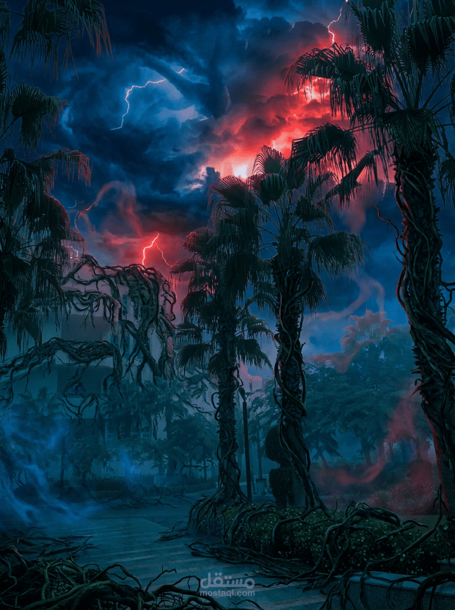 استخدمت تقنيات الـ Photo Manipulation لإعادة تشكيل البيئة، من خلال تعديل الإضاءة، الألوان، وإضافة التأثيرات البصرية مثل الضباب والتوهج، لخلق إحساس "العالم الموازي" (Upside Down) داخل أماكن واقعية.