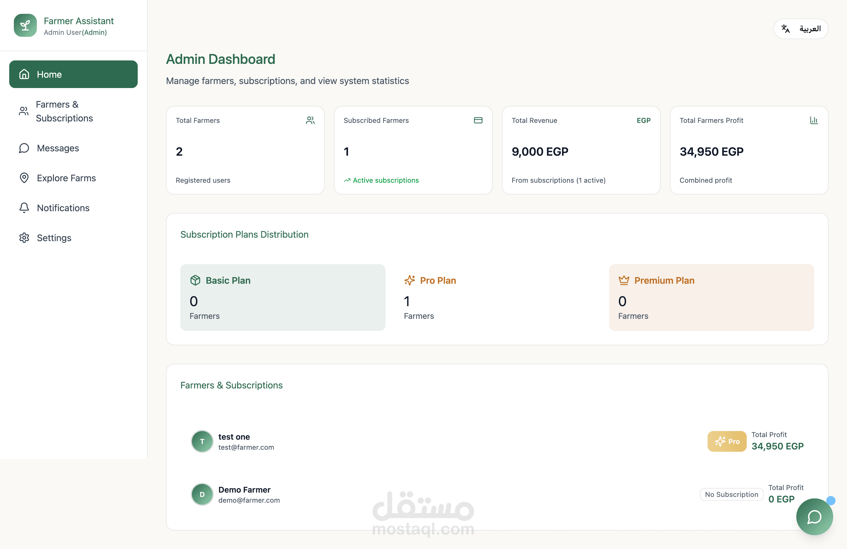 • نظام اشتراكات متكامل (Basic / Pro / Premium) مع إدارة الفواتير وتحليل الأرباح