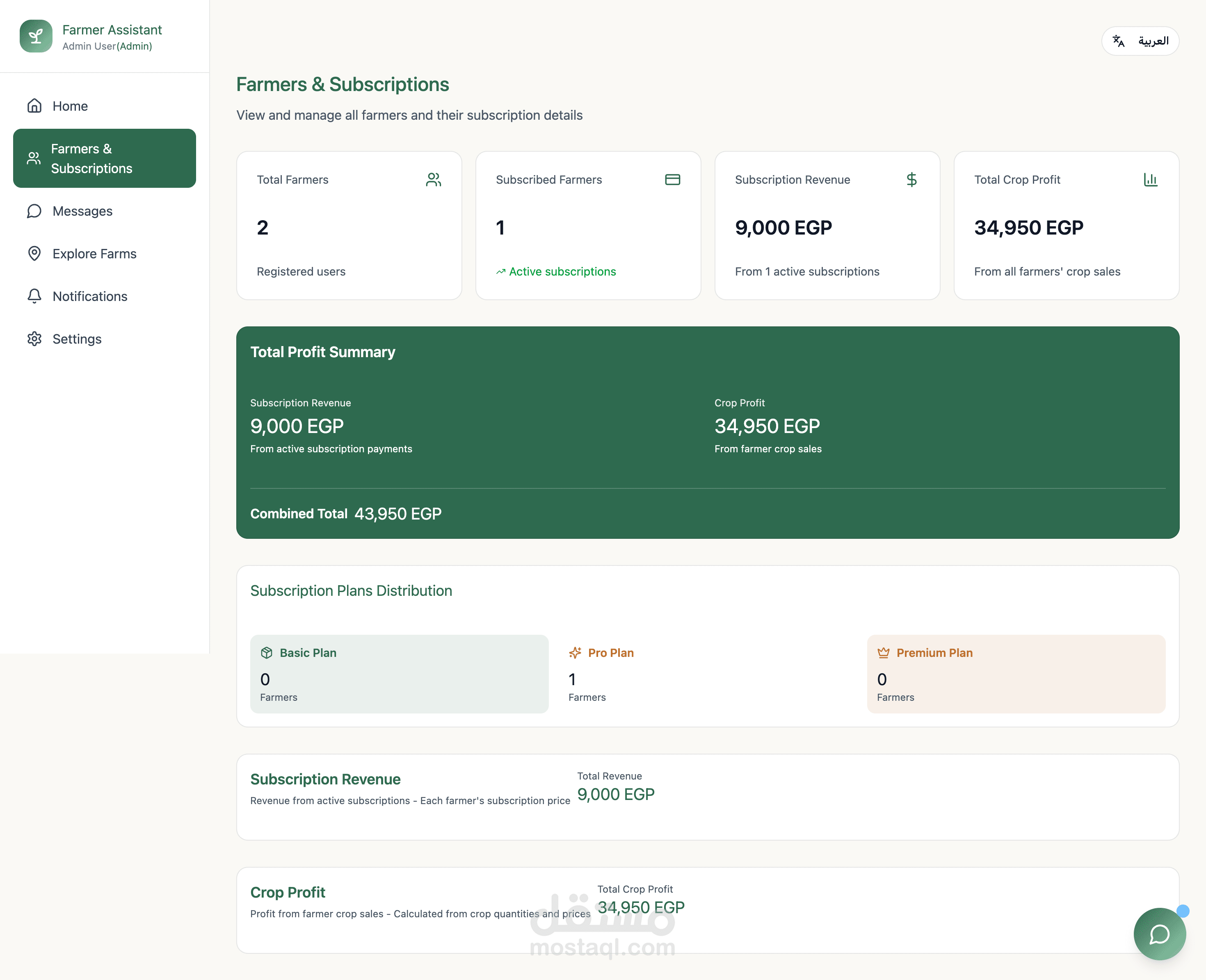 • لوحة تحكم تفاعلية تعرض مؤشرات الأداء، حالة المخزون، وأنشطة المزرعة بشكل لحظي