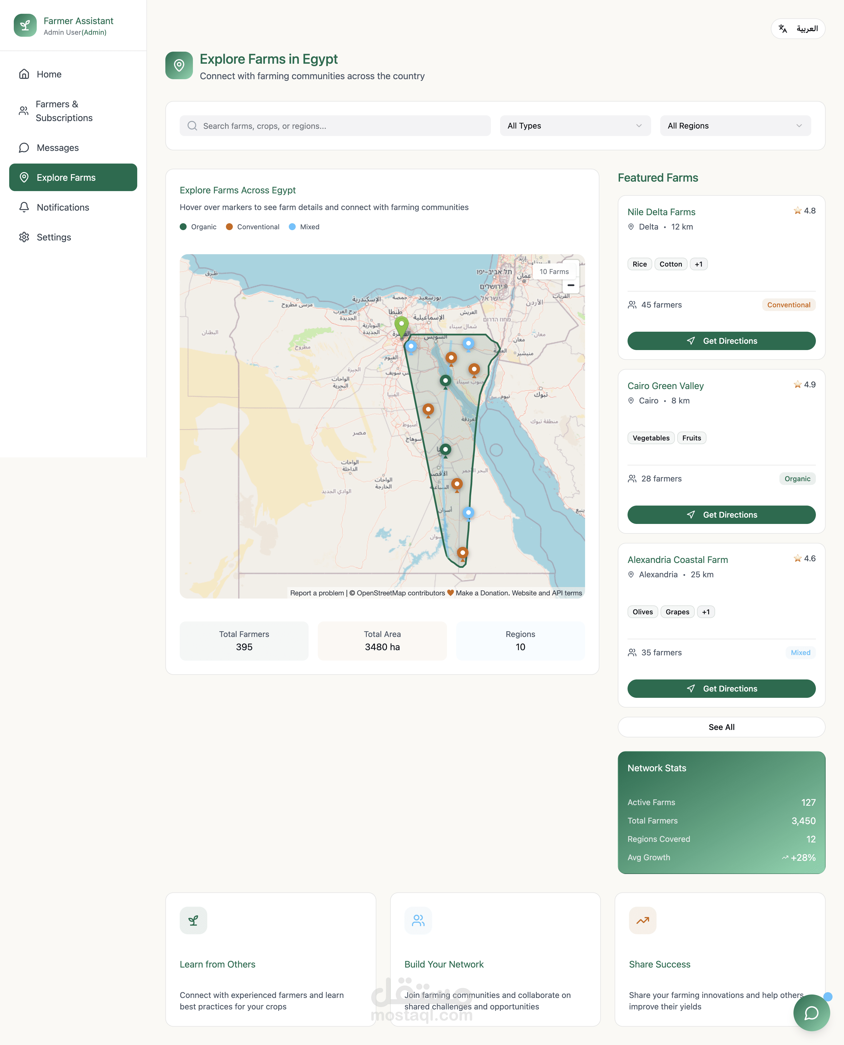 • خريطة تفاعلية لاستكشاف المزارع وربط المستخدمين بالأسواق المحلية داخل مصر