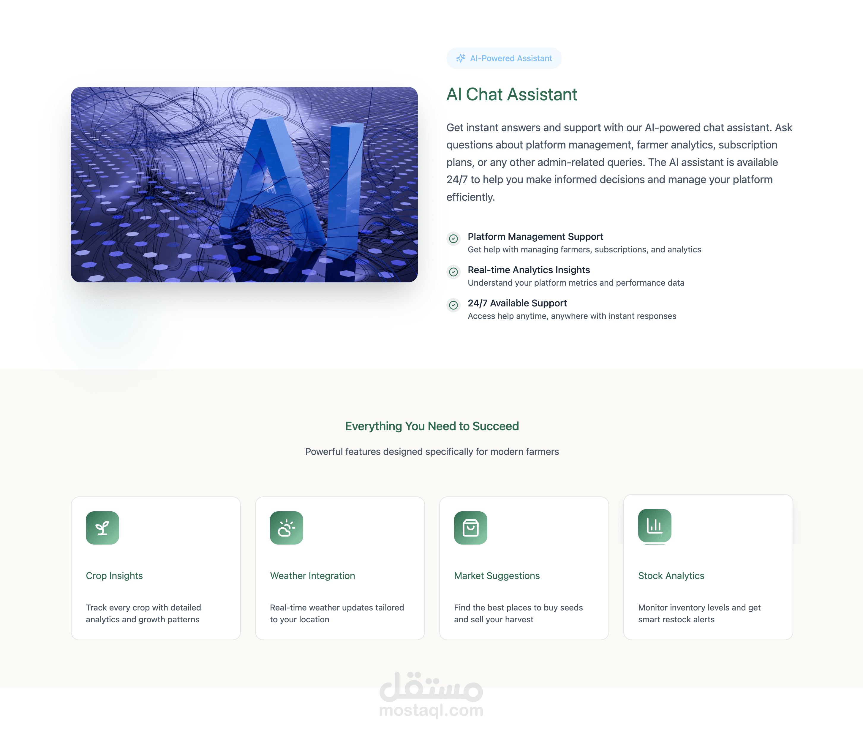 • مساعد ذكي يعمل 24/7 للإجابة على استفسارات المزارعين وتقديم توصيات ذكية