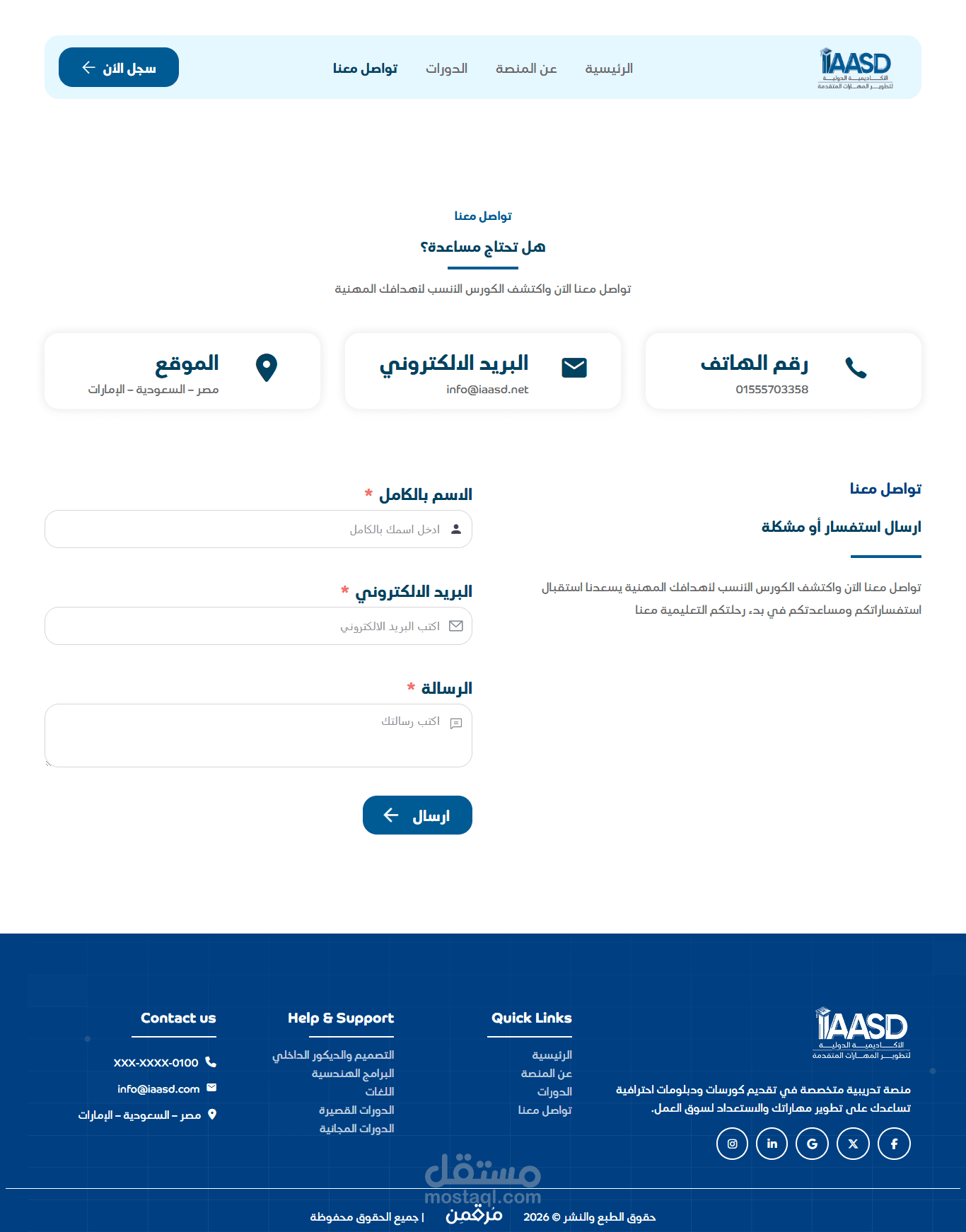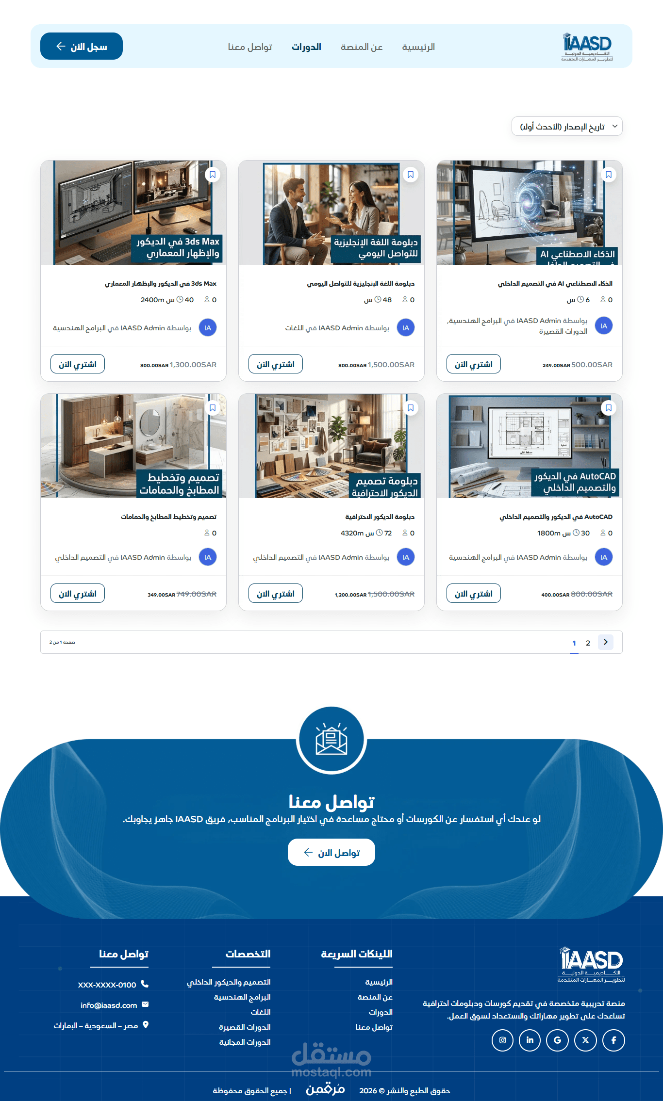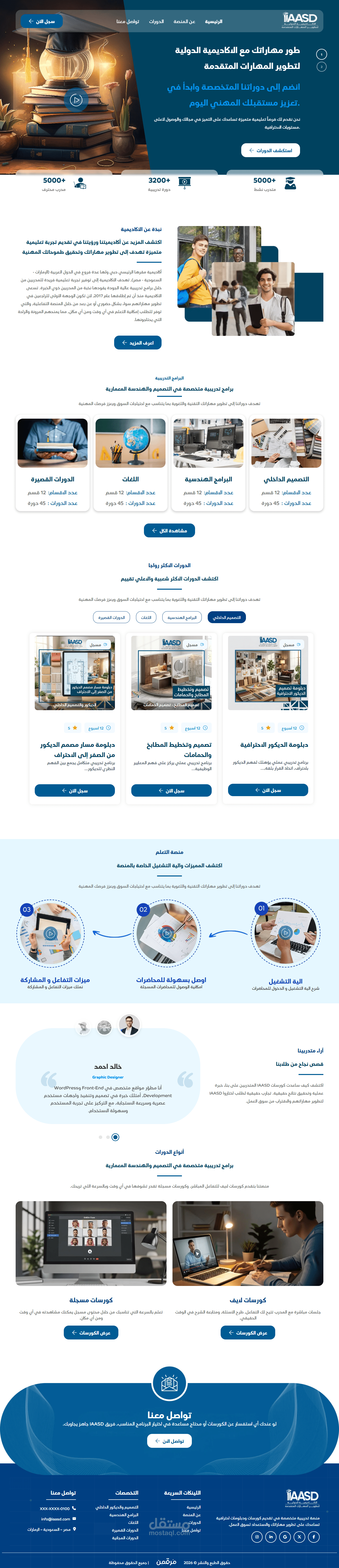 الموقع هو الأكاديمية الدولية لتطوير المهارات المتقدمة (IAASD)، منصة تعليمية عربية متخصصة في التدريب المهني والتصميم.