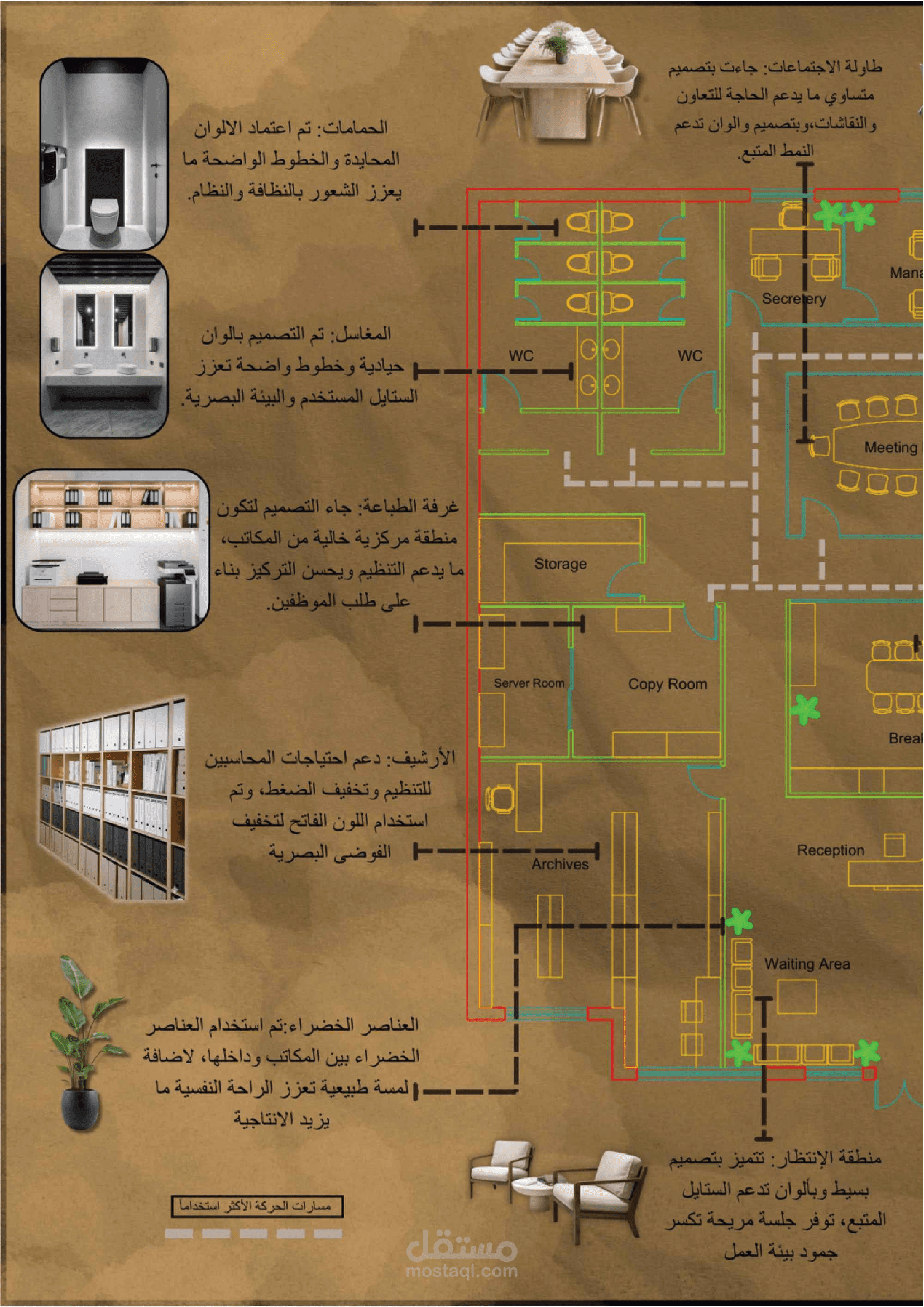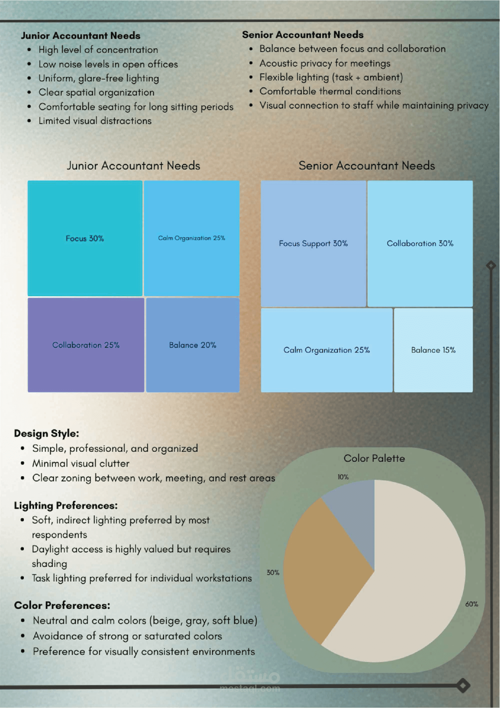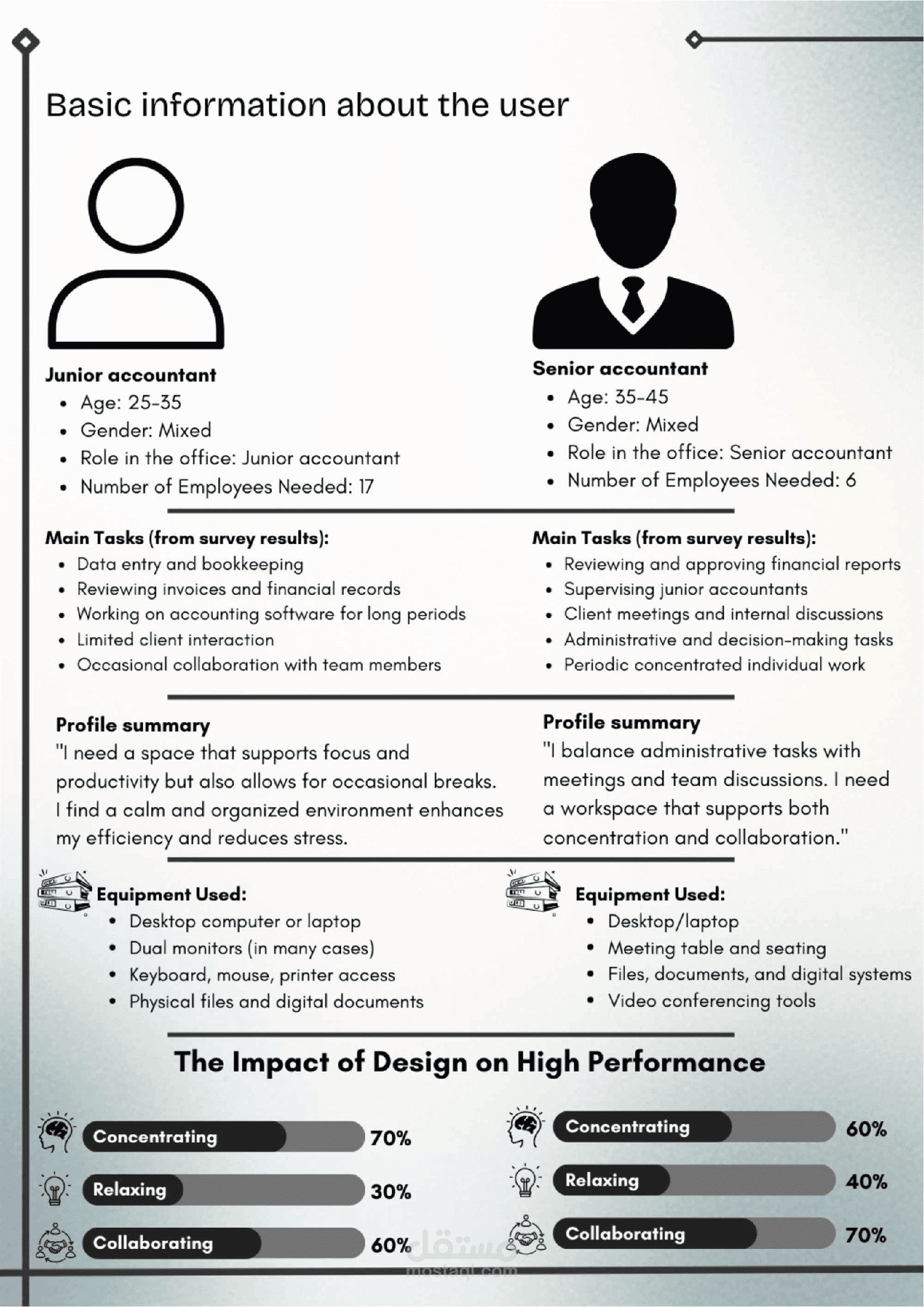 User profiles were developed using surveys and questionnaires, identifying key activities, environmental challenges, and workspace preferences. The analysis revealed that factors such as lighting quality, acoustic comfort, thermal conditions, and indoor air quality significantly impact users’ productivity, comfort, and overall well-being.