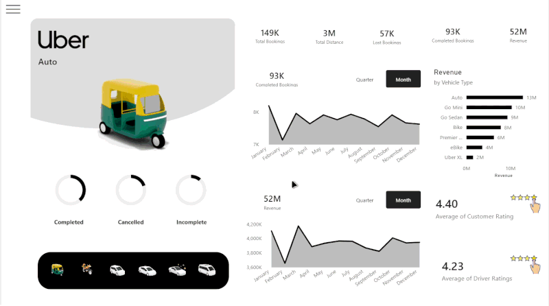 - KPI cards for high-level metrics (Bookings, Distance, Revenue).