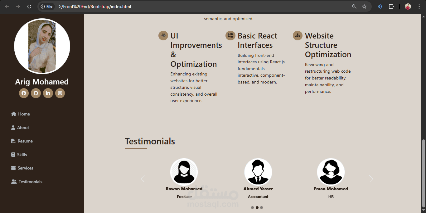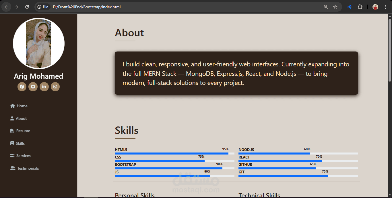 واجهة مستخدم (UI): تصميم يتضمن أقساماً واضحة (عني، المهارات، معرض الأعمال، تواصل معي) مع توزيع لوني مريح للعين.
