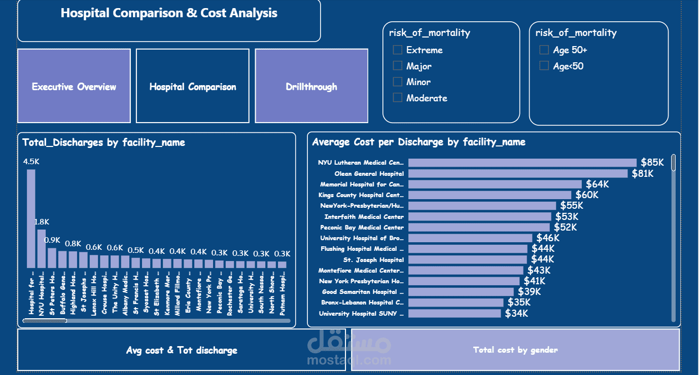 This is a set of three interactive Business Intelligence (BI) Dashboard screens designed for Healthcare Financial Analysis. The tool is built to help hospital administrators and health service analysts track costs, patient volume, and operational efficiency across New York State facilities.