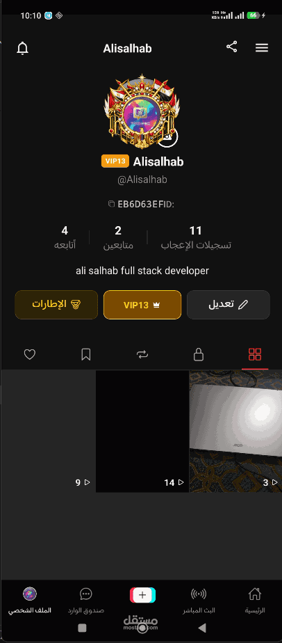 - رفع الفيديوهات وإدارتها، الإعجاب، التعليقات، المتابعة، والصفحة الرئيسية.