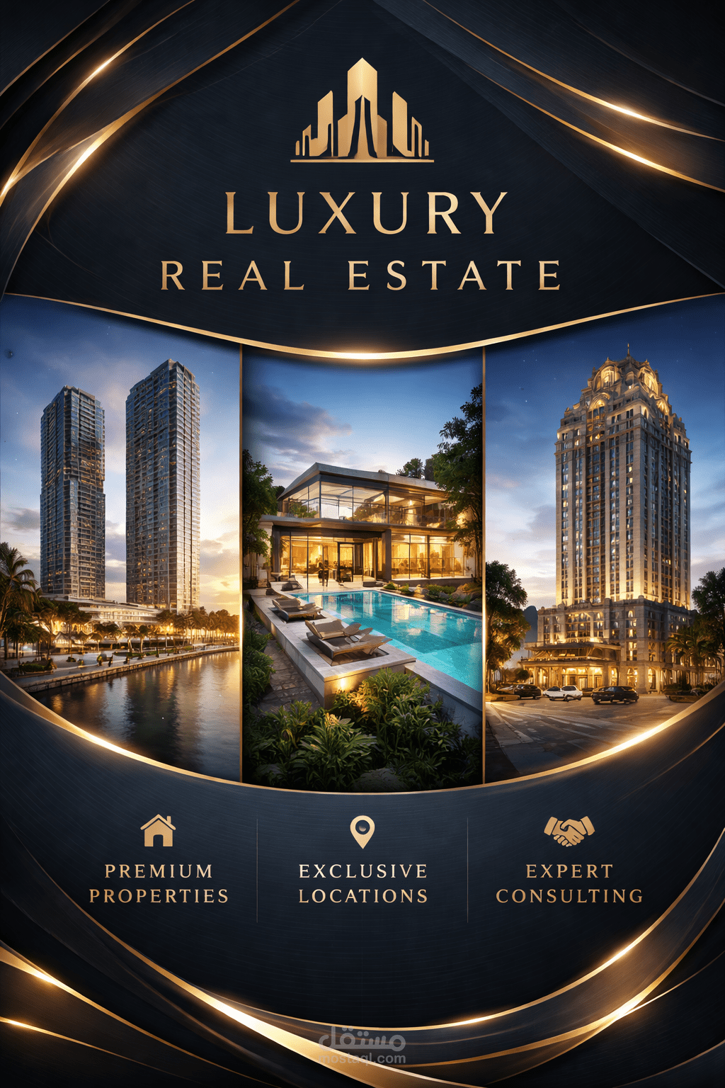 الهوية البصرية: استخدام مزيج الألوان الملكية (الأسود الفخم والذهبي) لتعزيز شعور الفخامة والمصداقية لدى المستثمر.
