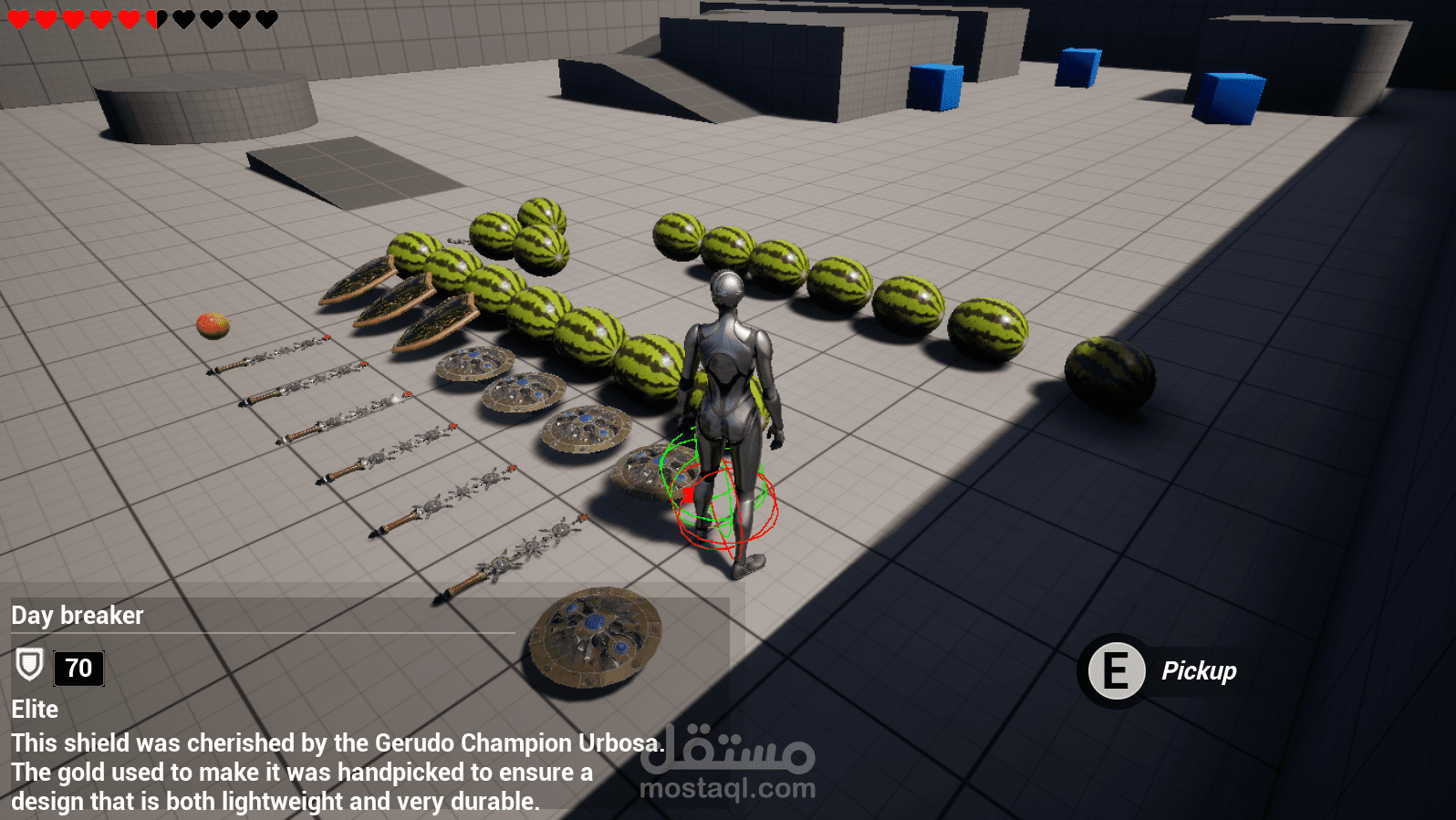 عندما يضع اللاعب السيف او الدرع يضعه على الشخصية لامكانية الحركة به وعند القاء العنصر وهو موضوع على الشخصية ستلقي الشخصية العنصر