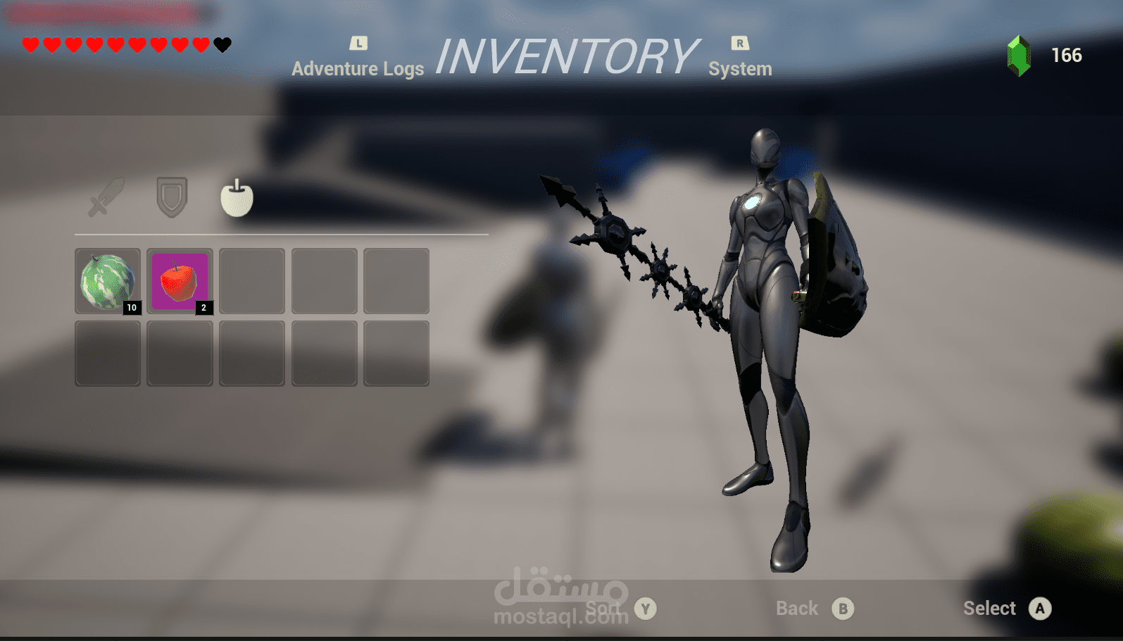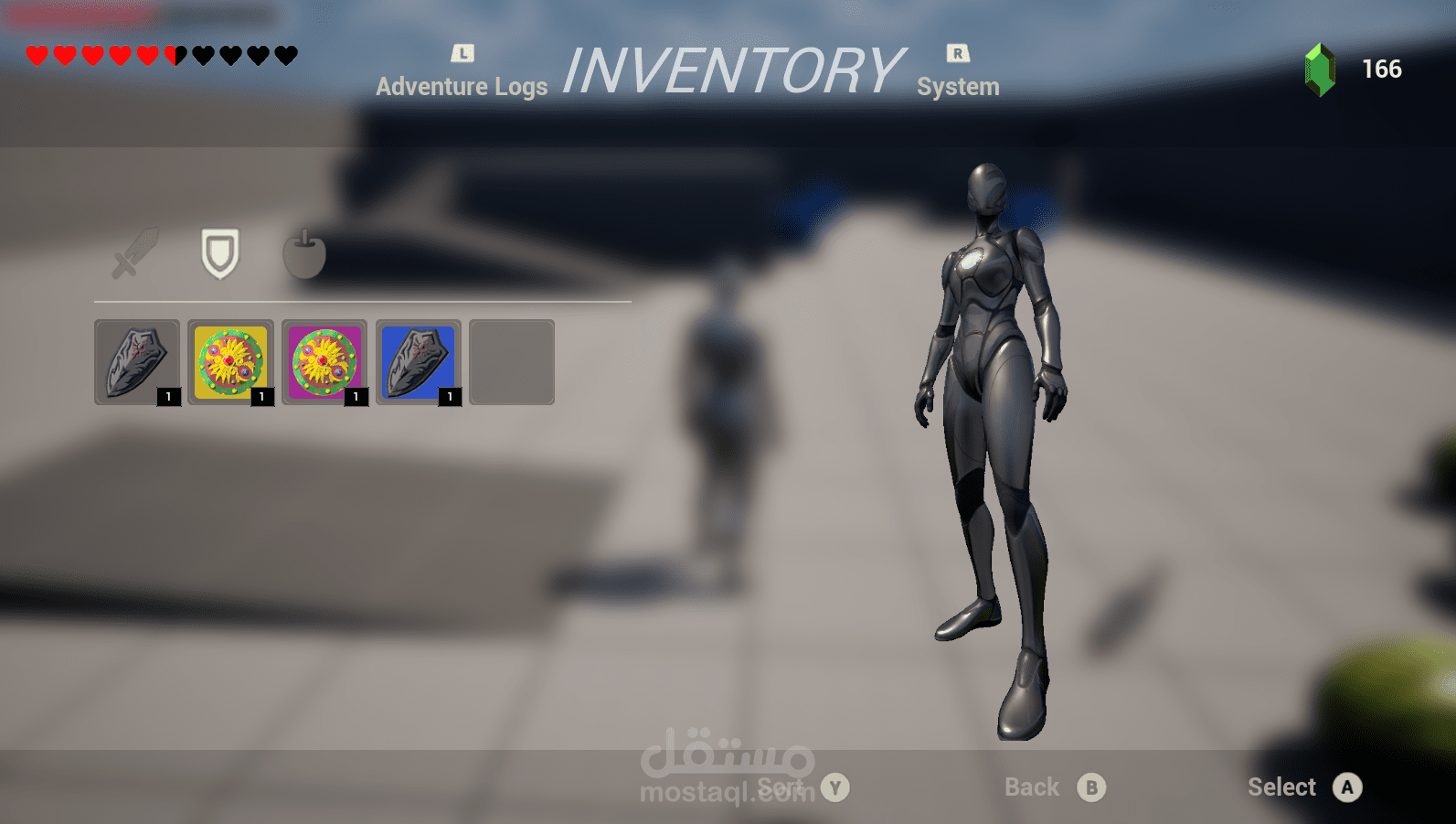 تحتوي فقط على ال inventory system هي عبارة عن واجهة مستخدم (UI) بها ايقونات او slots لوضع العناصر بها ولكل مكان له اعدادات خاصة به حسب العنصر الموضوع به اذا كان اسلحة سيوضع في صفحة الاسلحة في الاماكن المخصصة لها وتتغير الاعدادات الخاصة بالمكان (equip , drop , cancel) نفسه للدروع ولكن الاشياء القابلة للاكل تكون كالتالي (eat , drop , cancel) يمكن الغاء الاعدادات بعد الضغط على cancel او ابتعاد الماوس عن العنصر.