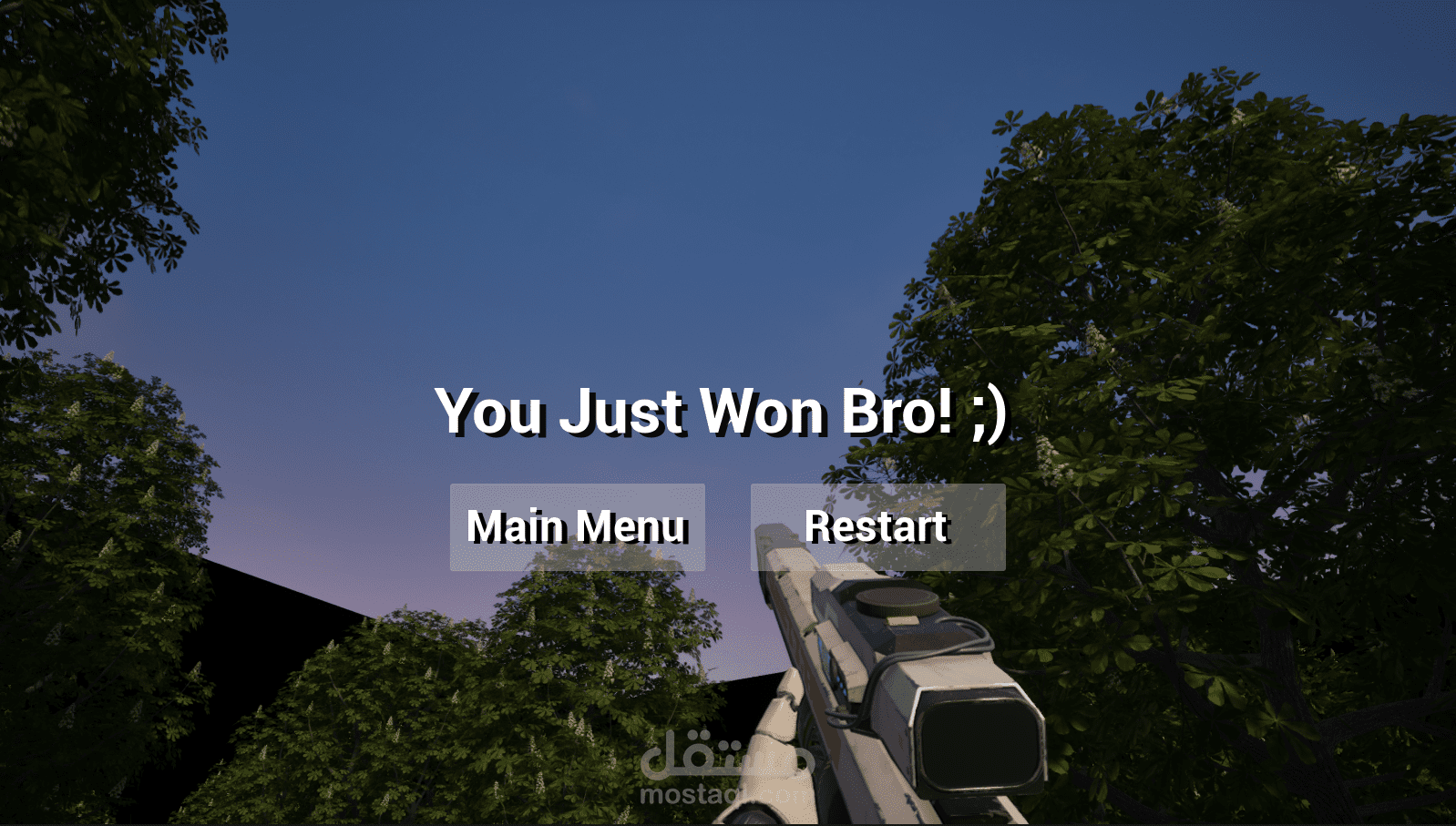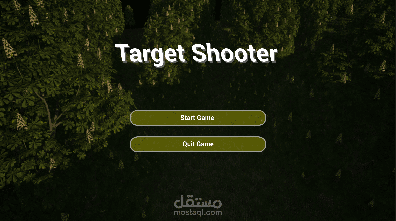 بيئة بسيطة مسطحة واشجار مع اضائة بسيطة وصوت للطبيعة في الخلفية لتحسين الاجواء في اللعبة