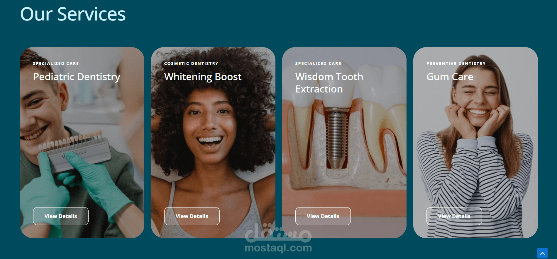 The website is a modern, service-oriented healthcare website designed to present a dental clinic and its offerings in a clean and professional manner.