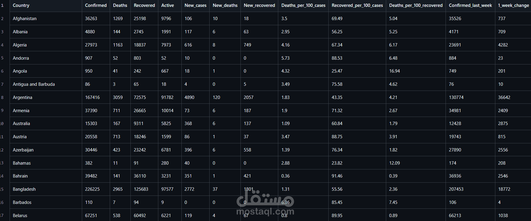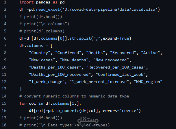 قمت ببناء خط أنابيب بيانات متكامل يقوم بجمع ومعالجة وتحليل بيانات كوفيد-19 لتوفير رؤى دقيقة وقابلة للاستخدام.
