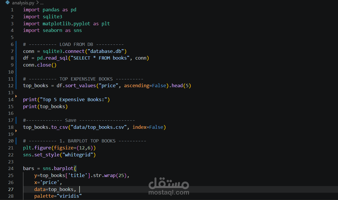 مشروع متكامل لتحليل البيانات باستخدام Python، حيث يتم تحميل البيانات من قاعدة بيانات SQLite ثم تنفيذ تحليل متقدم واستخراج insights مهمة مع عرض النتائج بشكل بصري (Visualizations).