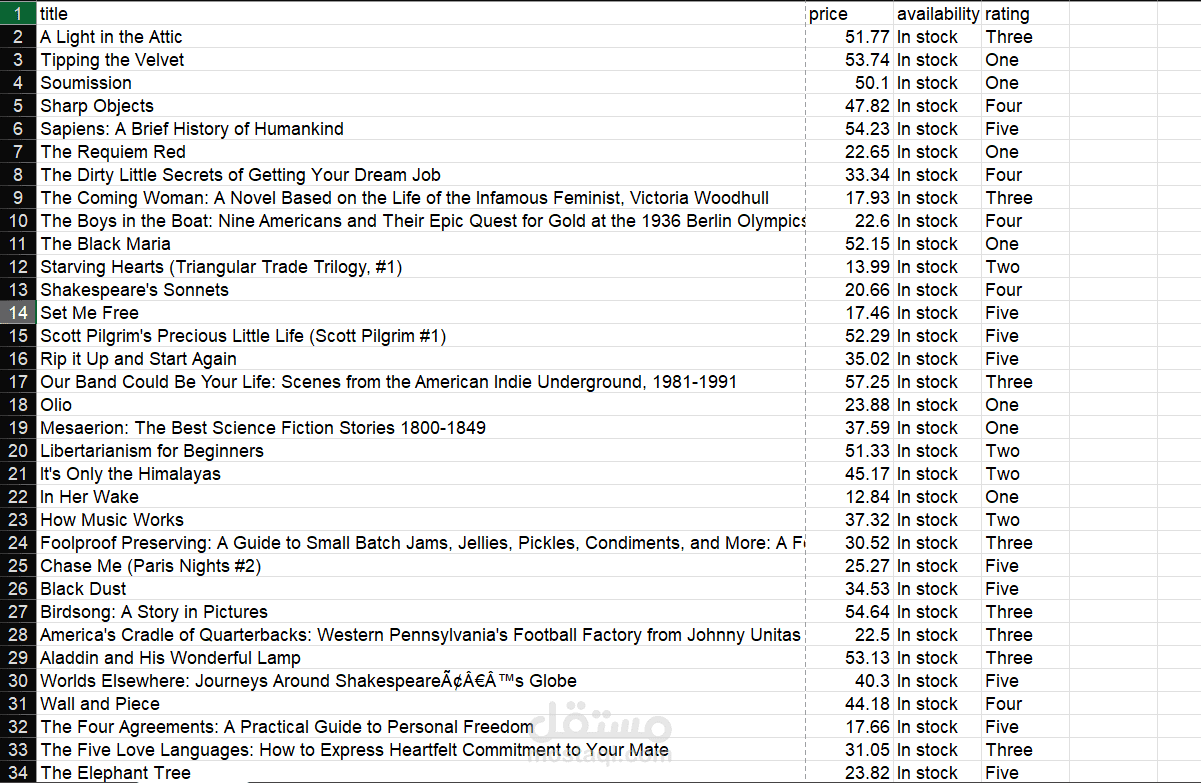 مشروع لاستخراج البيانات (Web Scraping) باستخدام Python، حيث يتم جمع بيانات الكتب من موقع إلكتروني بشكل آلي ومنظم.