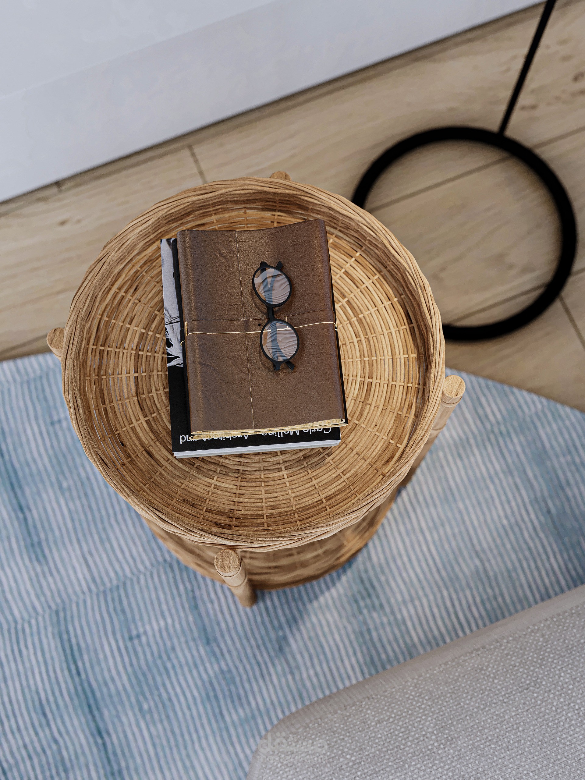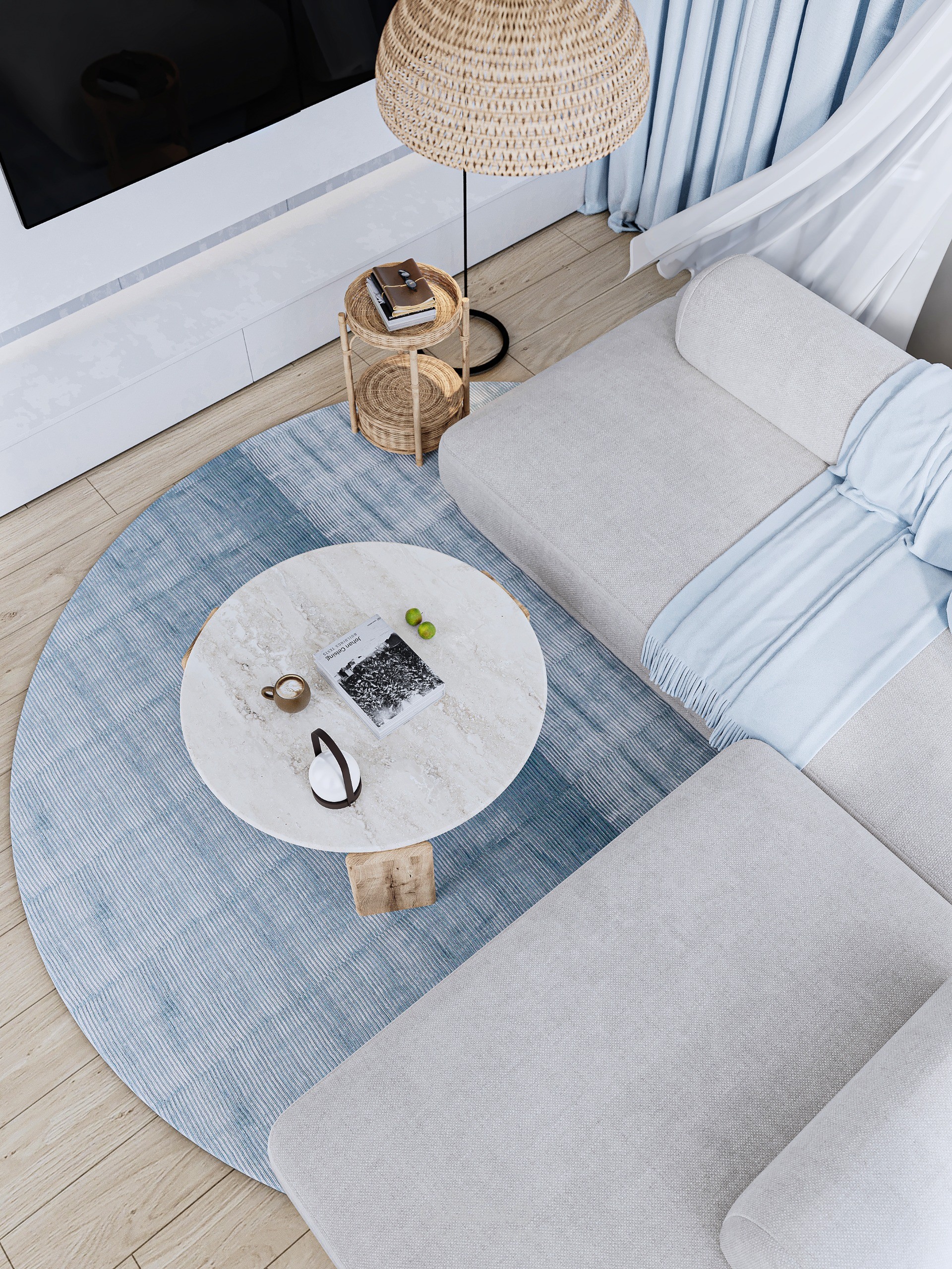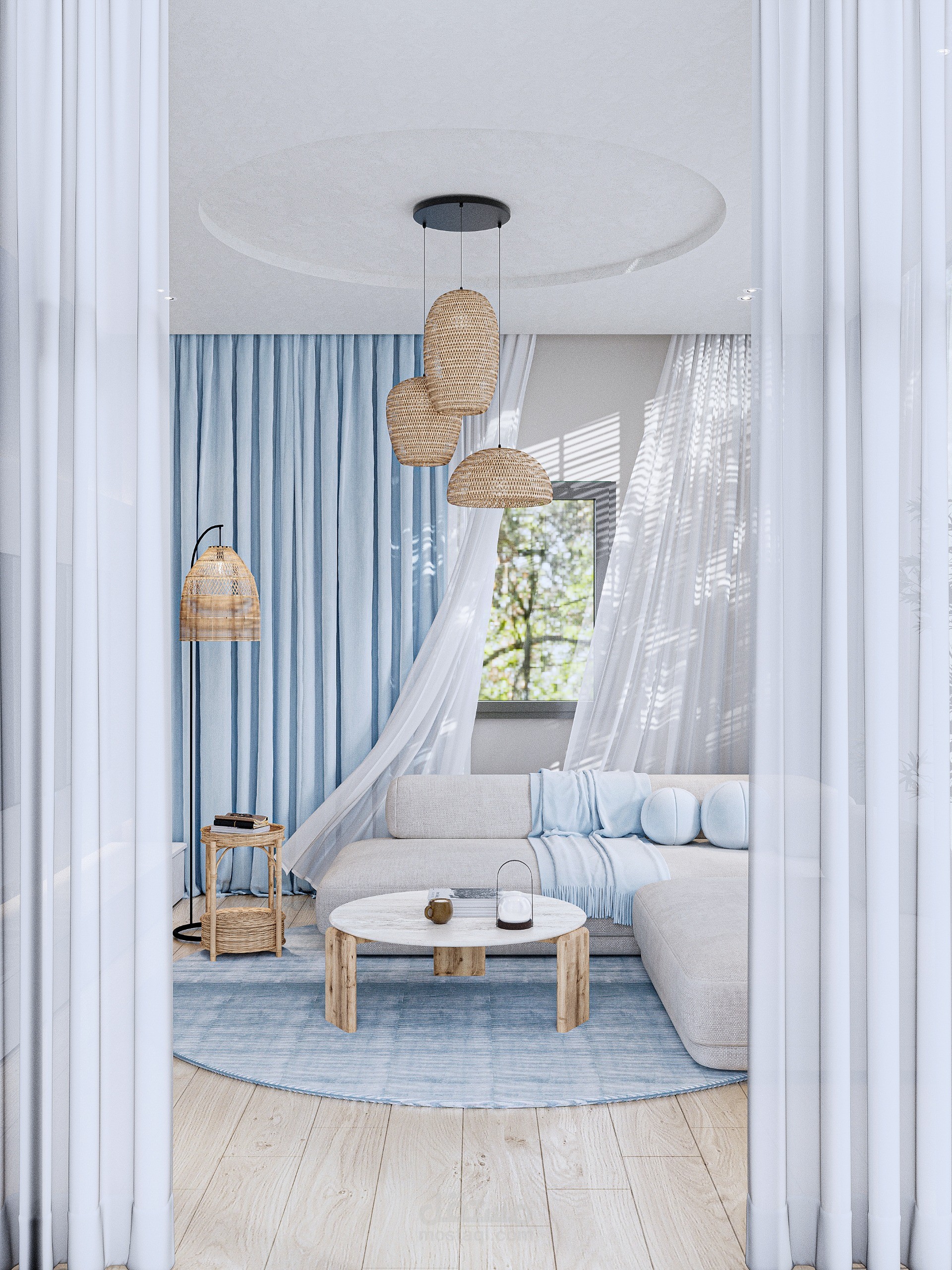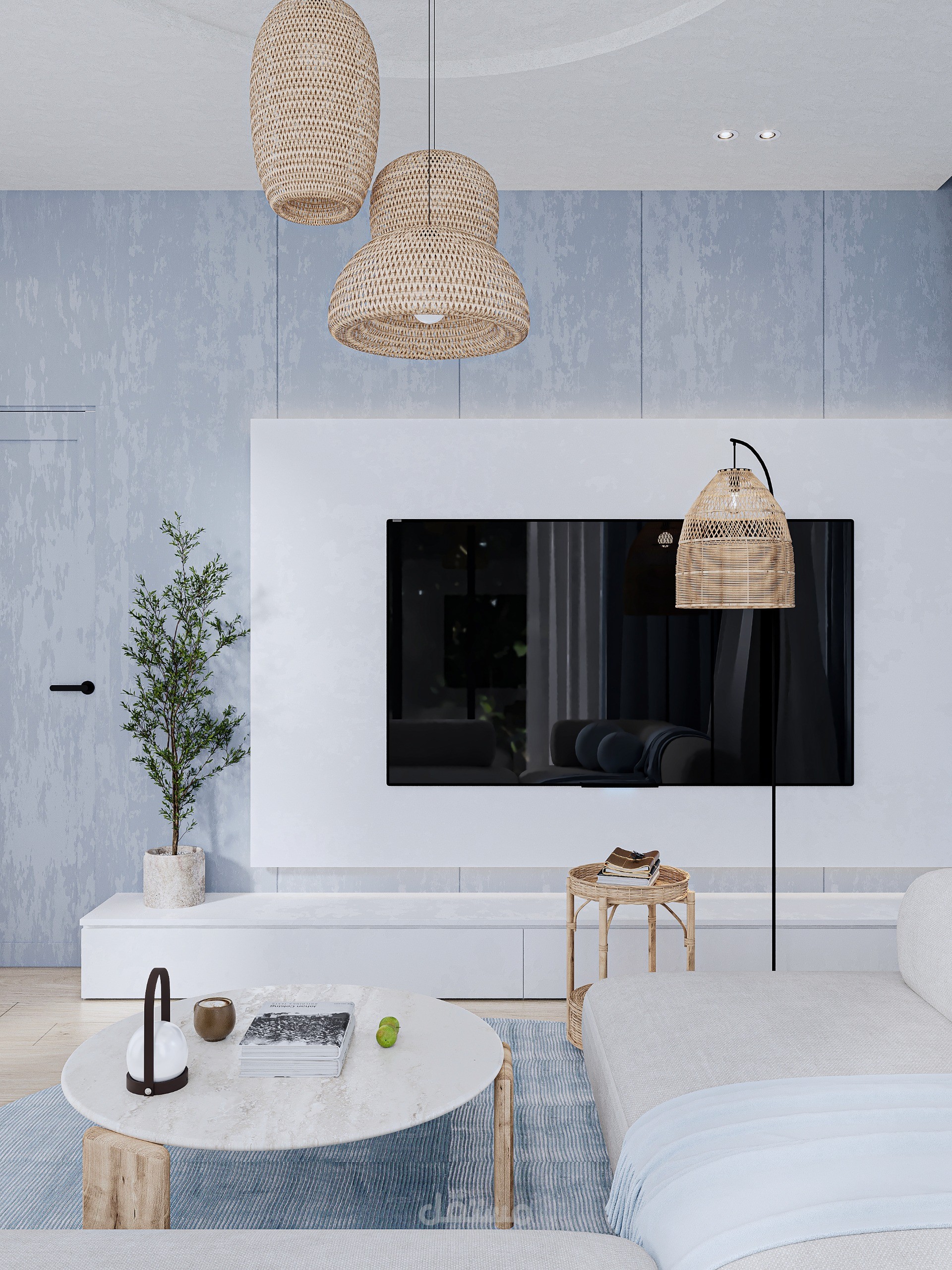 Modern coastal living room designed for a residential project in Egypt, reflecting a calm and refined contemporary aesthetic. The concept focuses on soft neutral tones combined with colorful textures to create a balanced and cozy atmosphere. Vertical wall detailing and integrated lighting enhance the sense of height and sophistication, while the custom bed and minimalist furniture emphasize comfort, functionality, and visual harmony