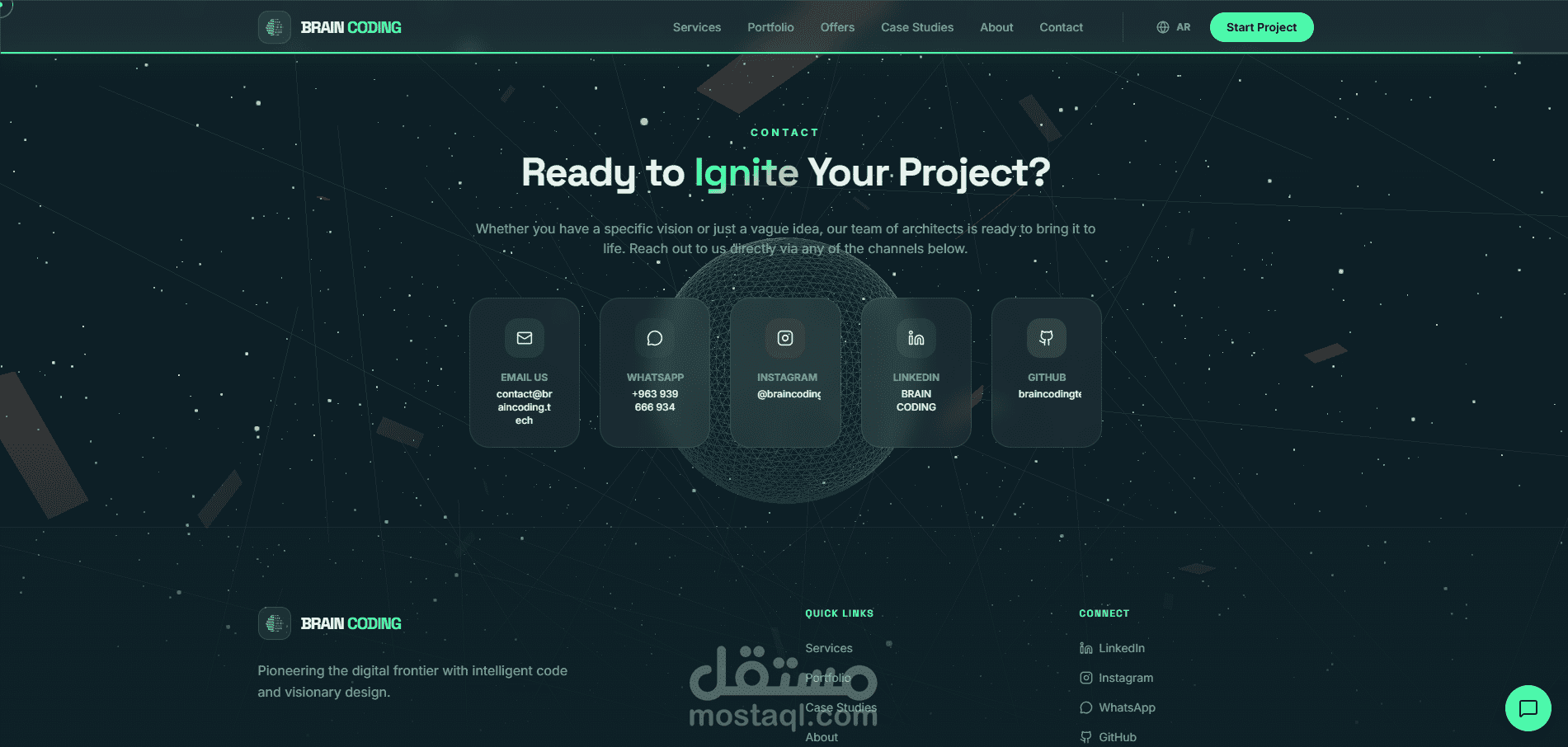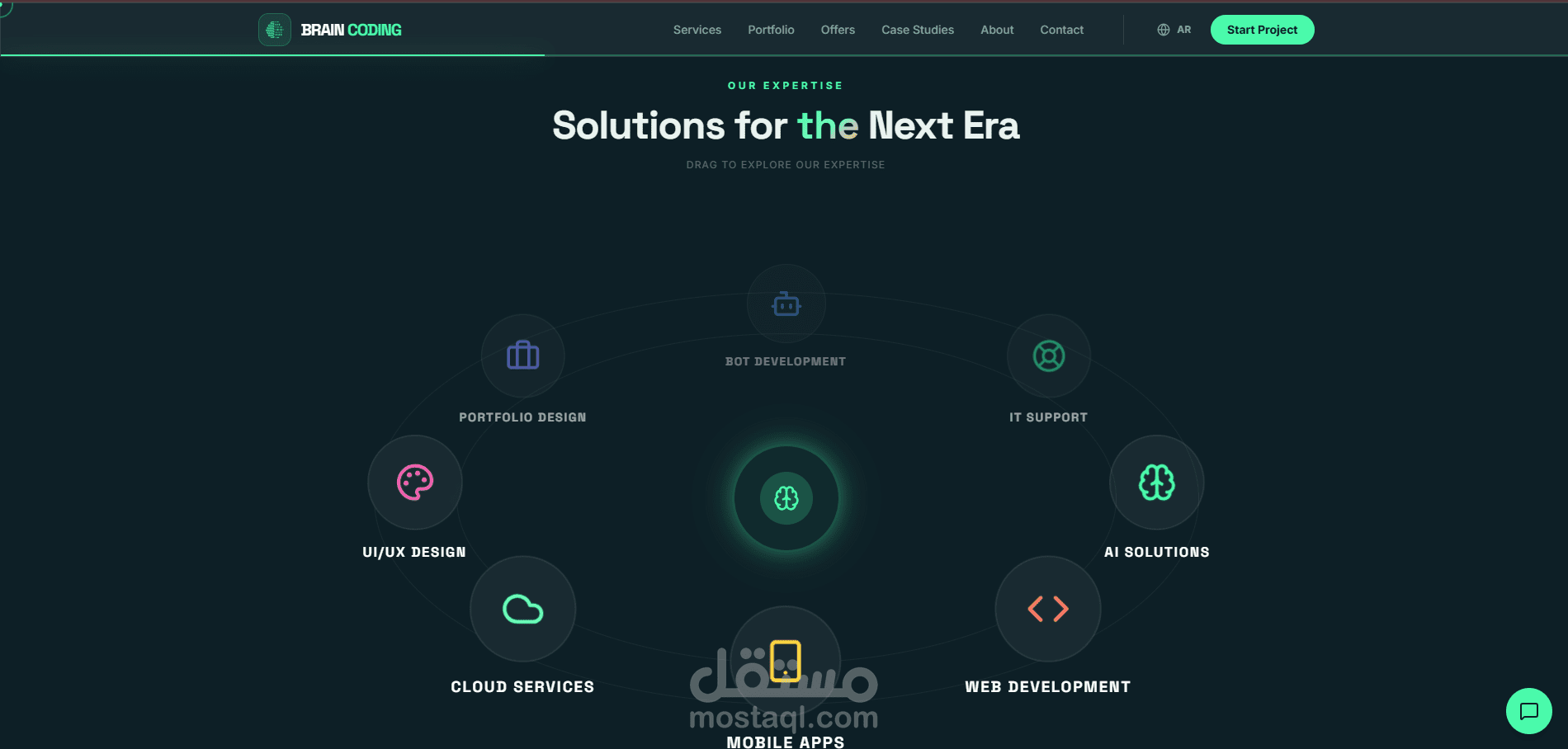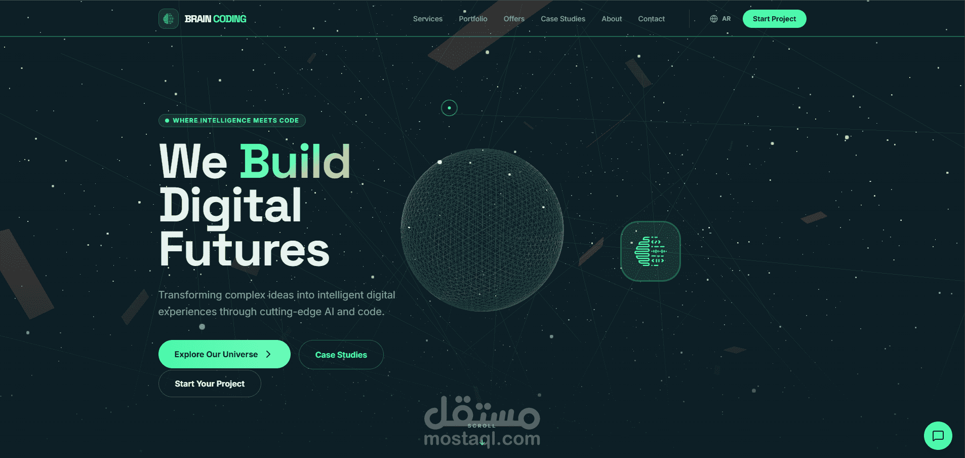 موقع الكتروني لشركة برمجية مصمم بطريقة احترافية تعكس هوية الشركة وجودتها وتعرض الاعمال بطريقة احترافية وواضحة مدعوم ب شات بوت لتعامل مع العملاء ومصمم بخلفية متحركة