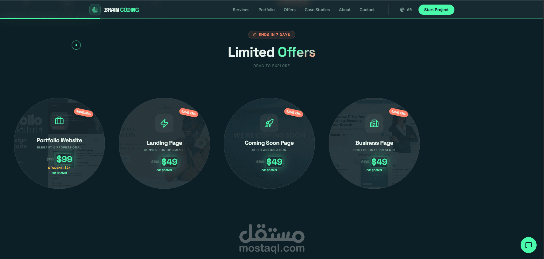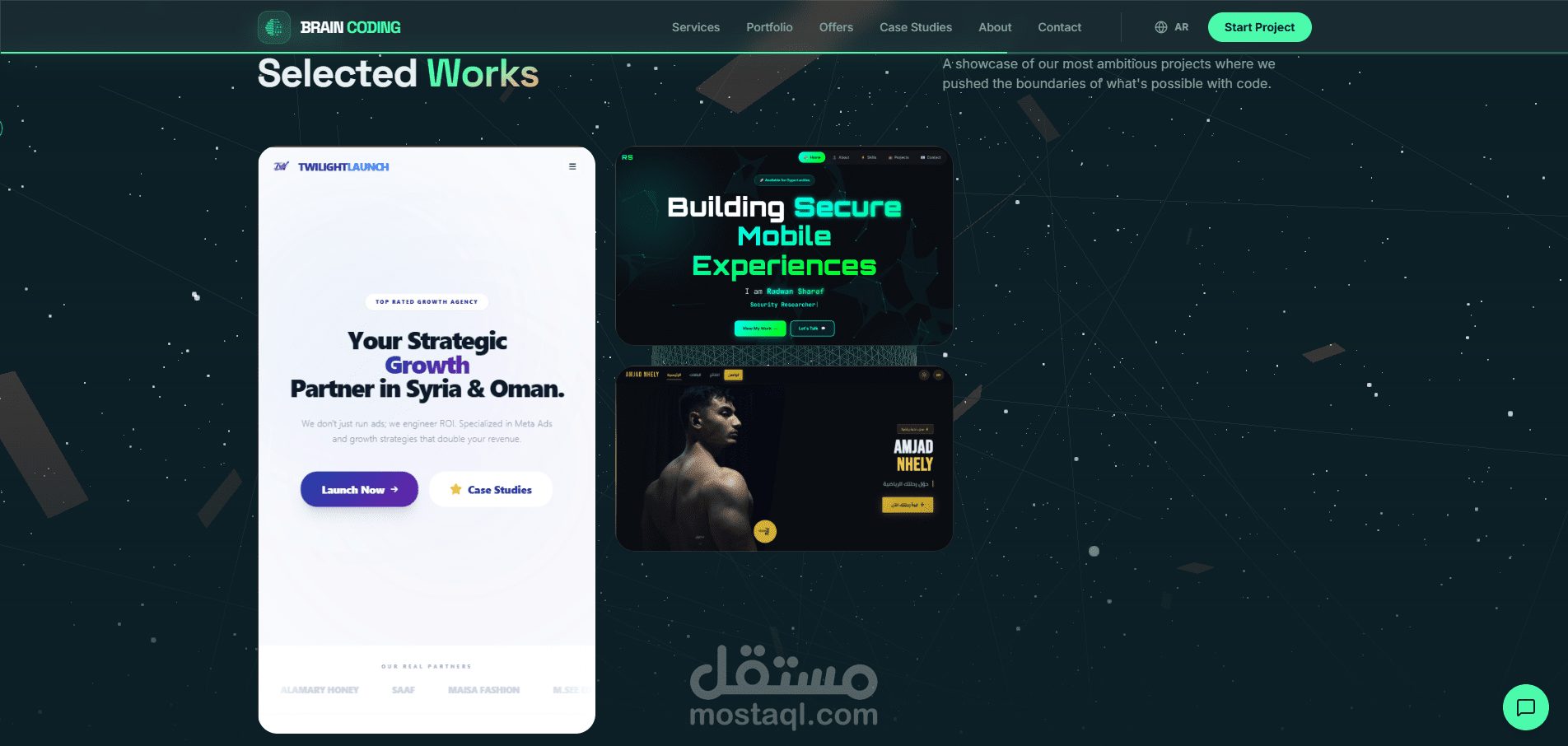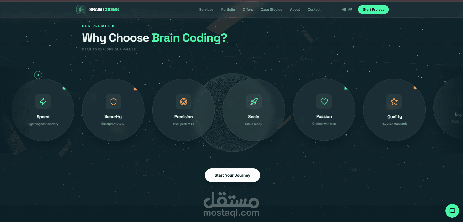 موقع الكتروني لشركة برمجية مصمم بطريقة احترافية تعكس هوية الشركة وجودتها وتعرض الاعمال بطريقة احترافية وواضحة مدعوم ب شات بوت لتعامل مع العملاء ومصمم بخلفية متحركة