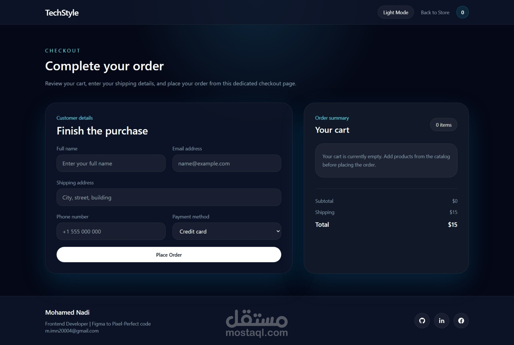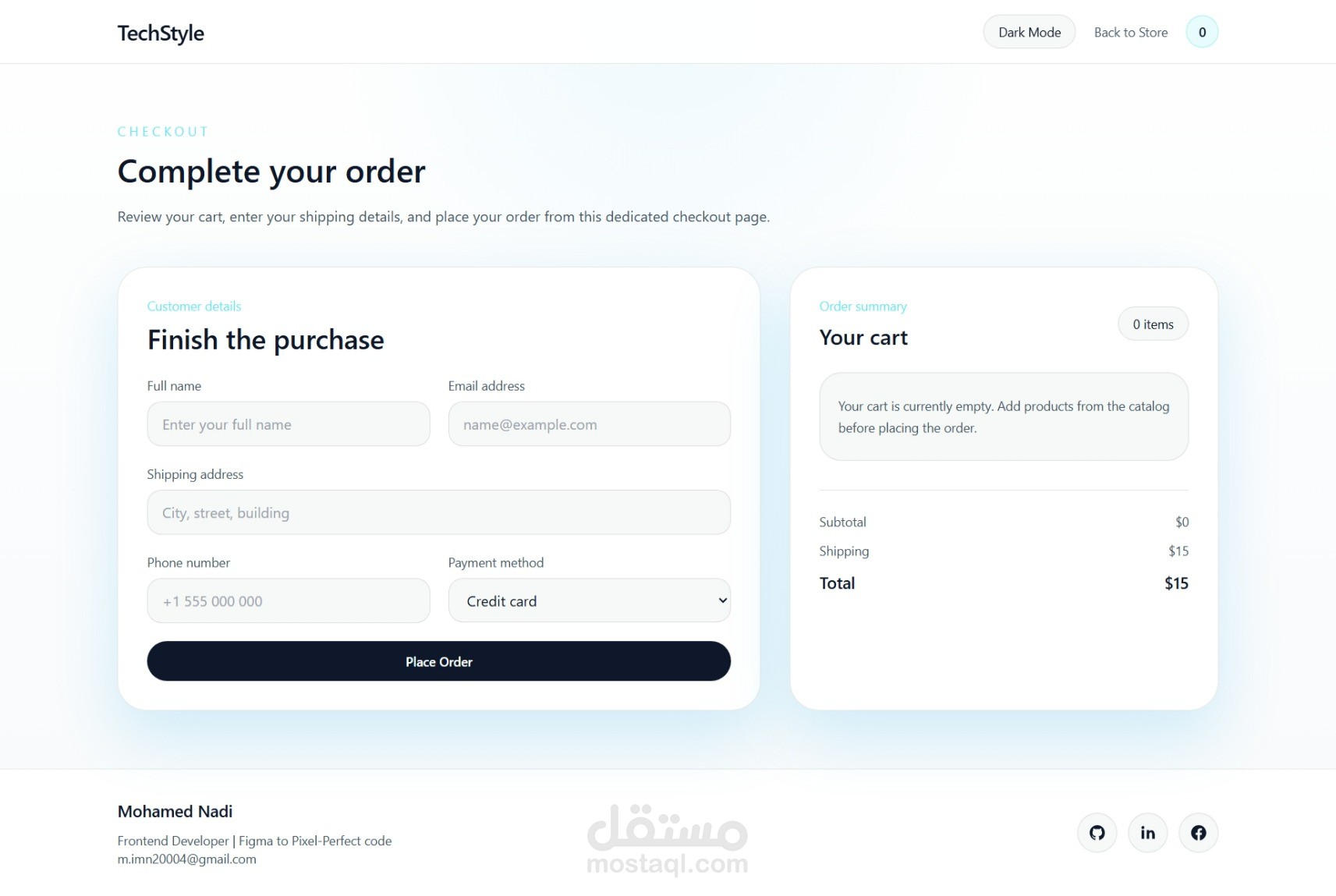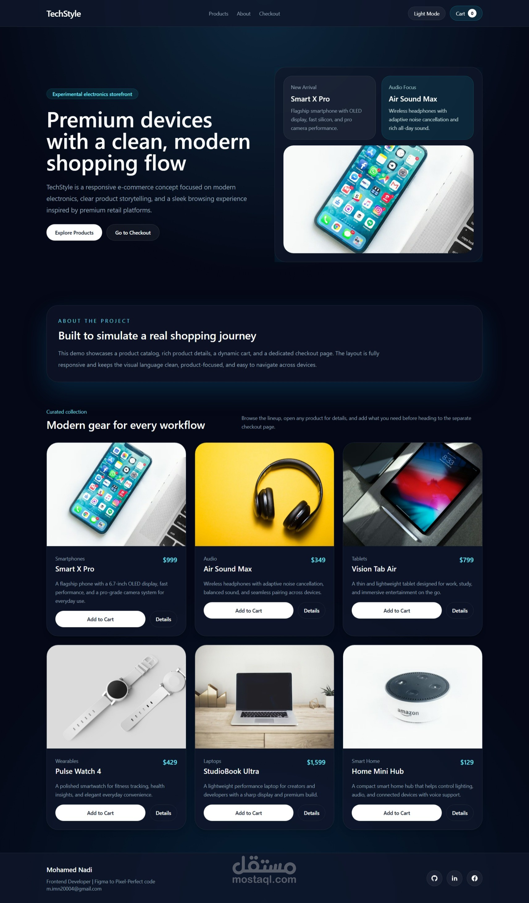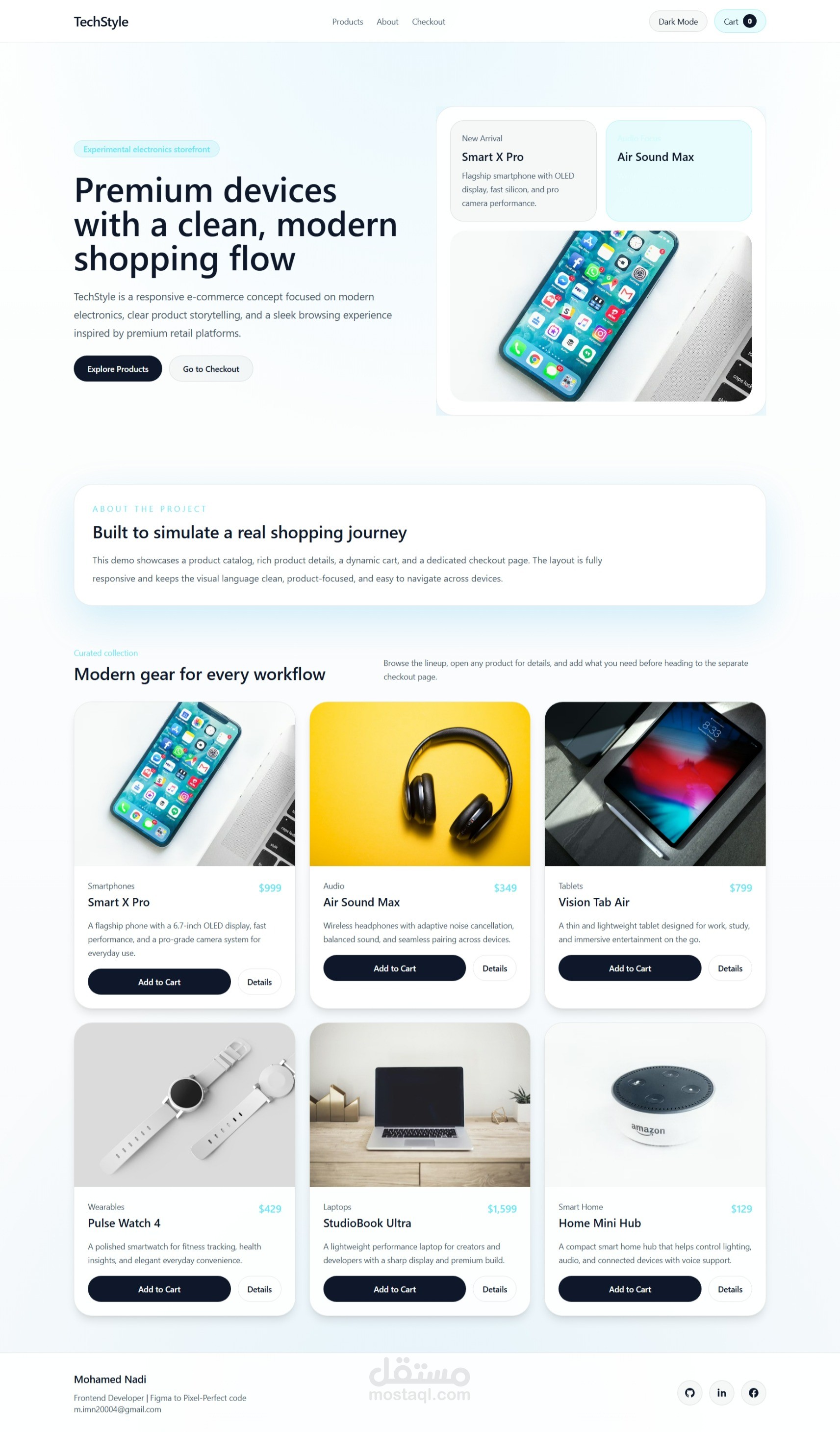 TechStyle is a responsive e-commerce demo focused on modern electronics. The project was designed to simulate a premium shopping experience inspired by clean Apple-like product presentation, smooth navigation, and clear visual hierarchy.