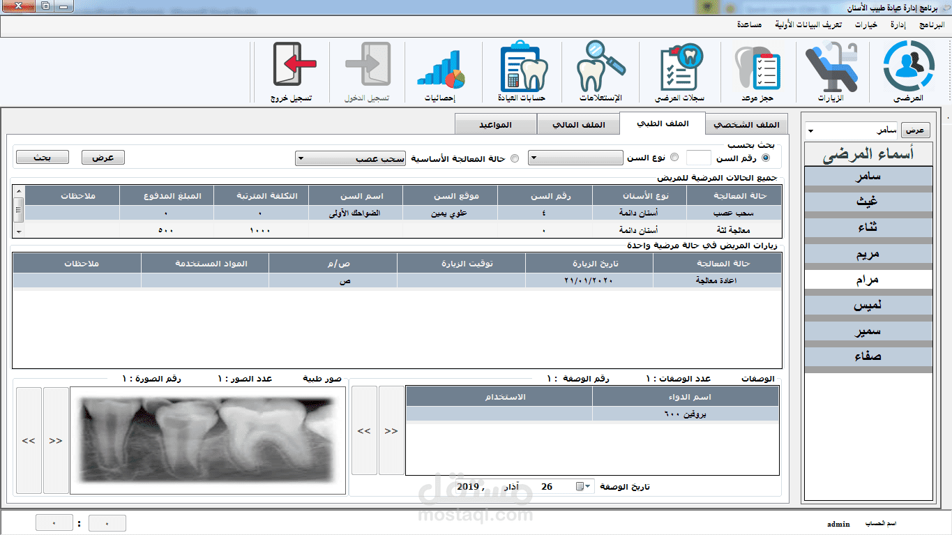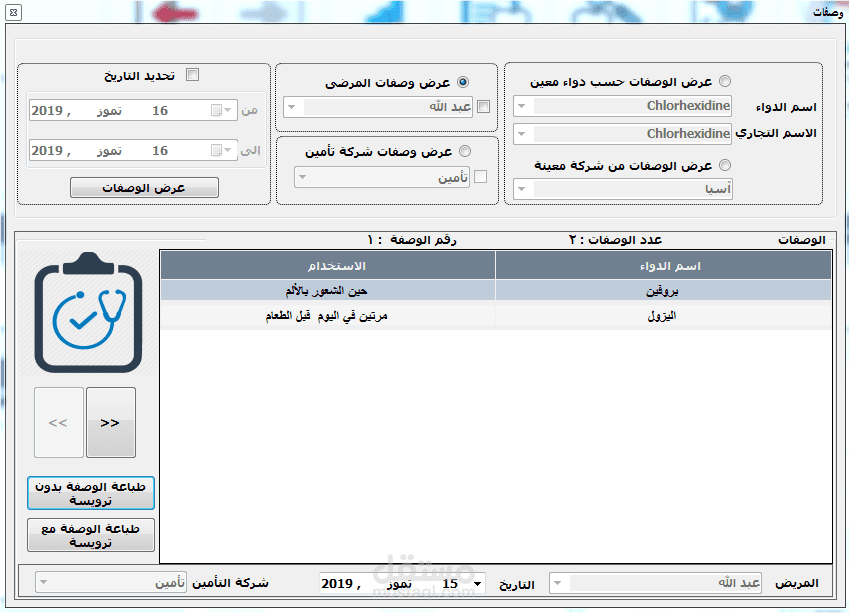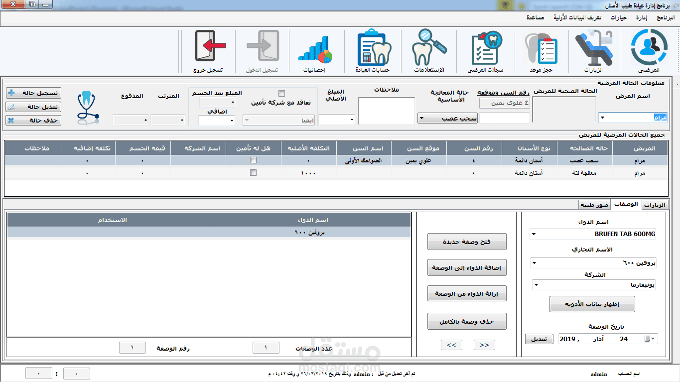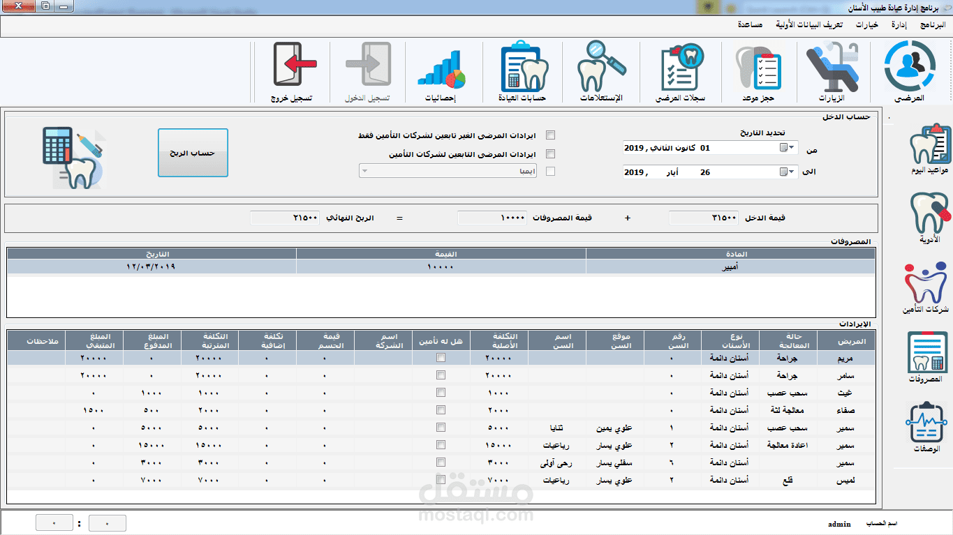 3- تنظيم وإدارة جميع وصفات المرضى وتقديم كافة الاستعلامات والاحصائيات المرتبطة بهم ( كمعرفة وصفات المرضى التابعين لشركة تأمين ما أو معرفة جميع وصفات شركة أدوية معينة وغيرها الكثير ) 4- إدارة وتنظيم جميع الأمور المالية والحسابات المرتبطة بالعيادة و تقديم كافة - الاستعلامات والاحصائيات المطلوبة لها ( كمعرفة الإيرادات الشهرية أو اليومية أو معرفة إيرادات المرضى بحسب مريض ما أو شركة تأمين ما بتاريخ محدد )
