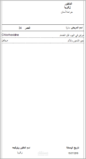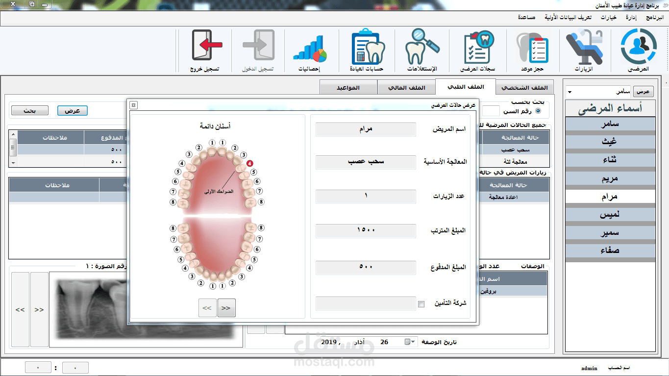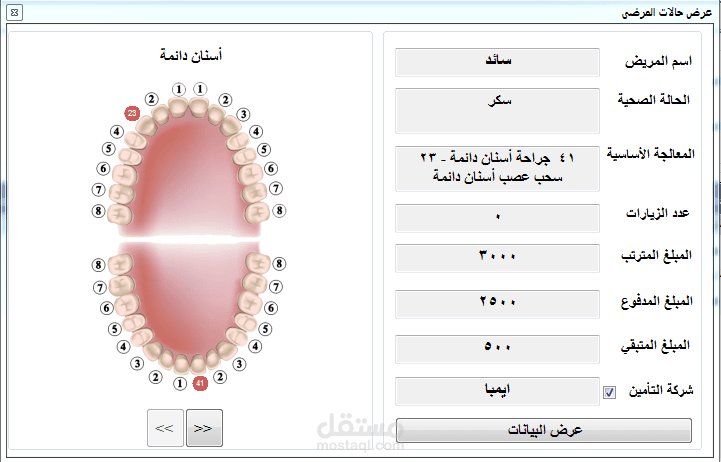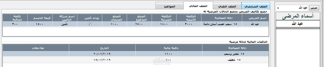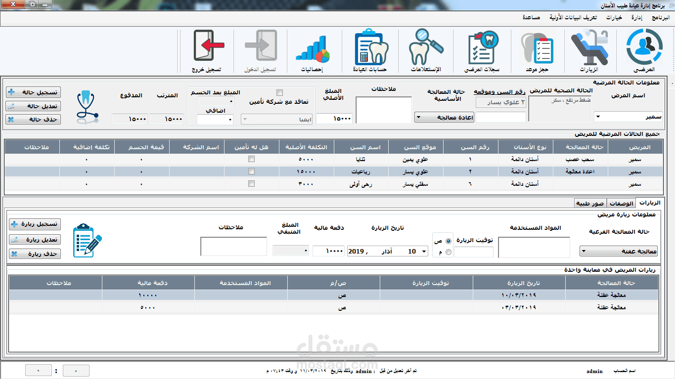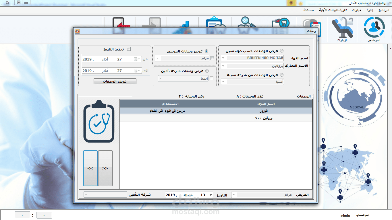 3- تنظيم وإدارة جميع وصفات المرضى وتقديم كافة الاستعلامات والاحصائيات المرتبطة بهم ( كمعرفة وصفات المرضى التابعين لشركة تأمين ما أو معرفة جميع وصفات شركة أدوية معينة وغيرها الكثير ) 4- إدارة وتنظيم جميع الأمور المالية والحسابات المرتبطة بالعيادة و تقديم كافة - الاستعلامات والاحصائيات المطلوبة لها ( كمعرفة الإيرادات الشهرية أو اليومية أو معرفة إيرادات المرضى بحسب مريض ما أو شركة تأمين ما بتاريخ محدد )