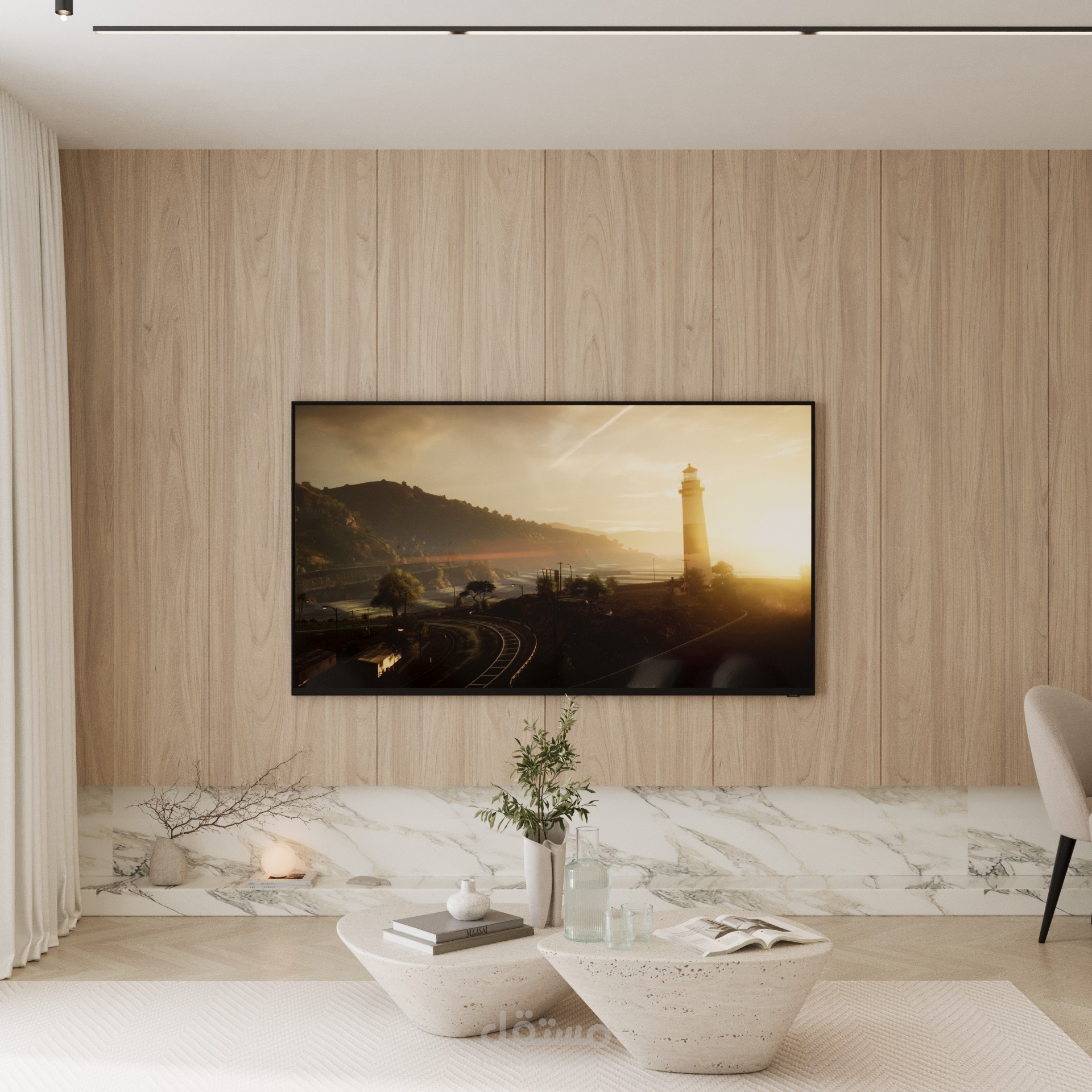 A refined minimalist style is paired with warm, natural materials such as light wood finishes and marble accents, creating a serene and welcoming atmosphere. The soft color palette enhances the feeling of openness and light, while the seamless transitions between zones offer a practical yet stylish solution for modern studio living.