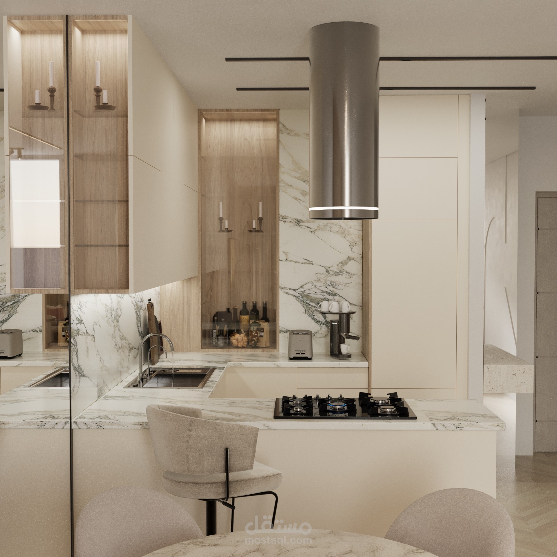 This is an alternate design proposal for the main living space of a studio apartment in Dubai Hills. The concept integrates the living area, dining space, and kitchen into a cohesive and elegant layout that maximizes functionality within a compact footprint.