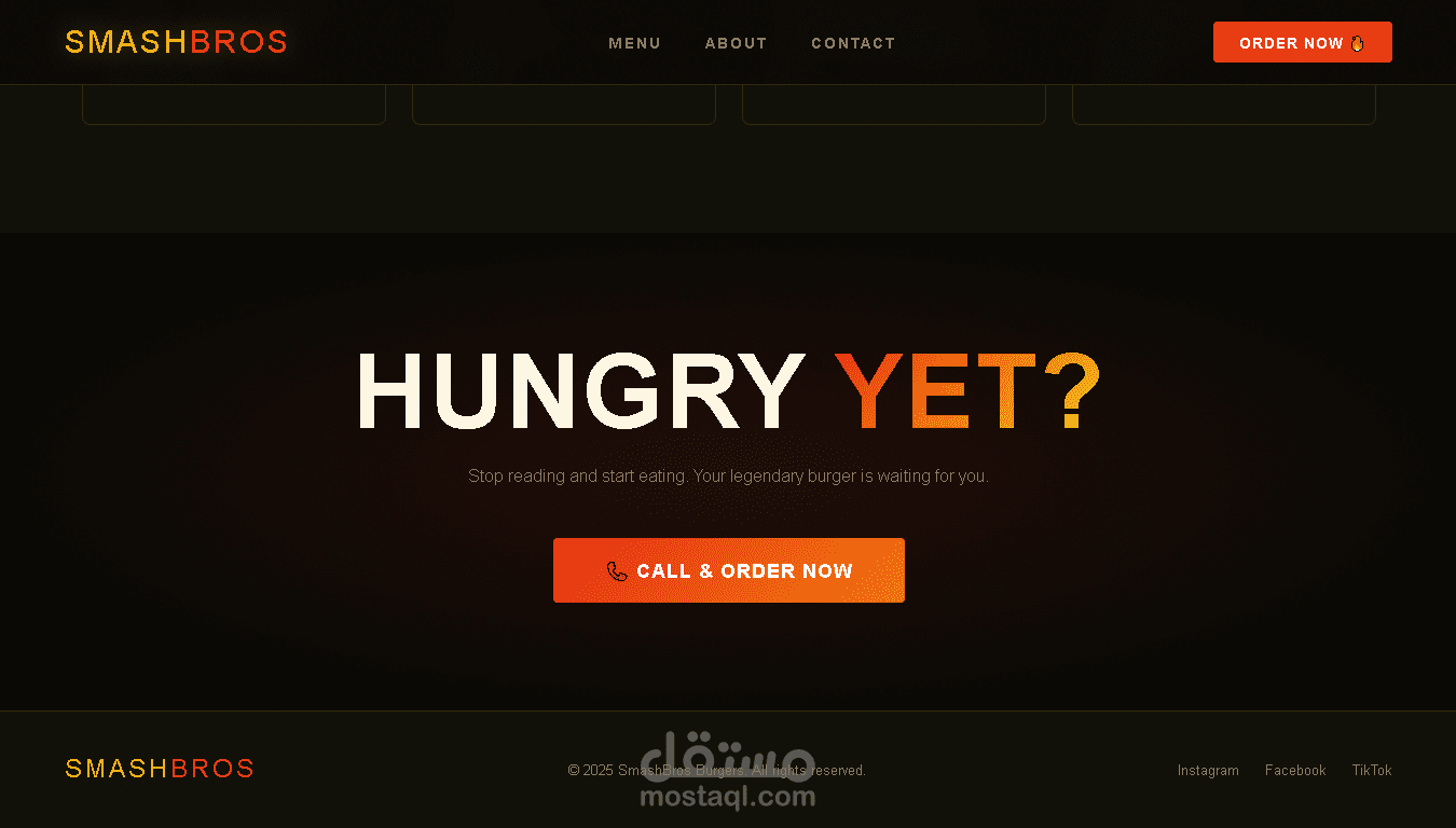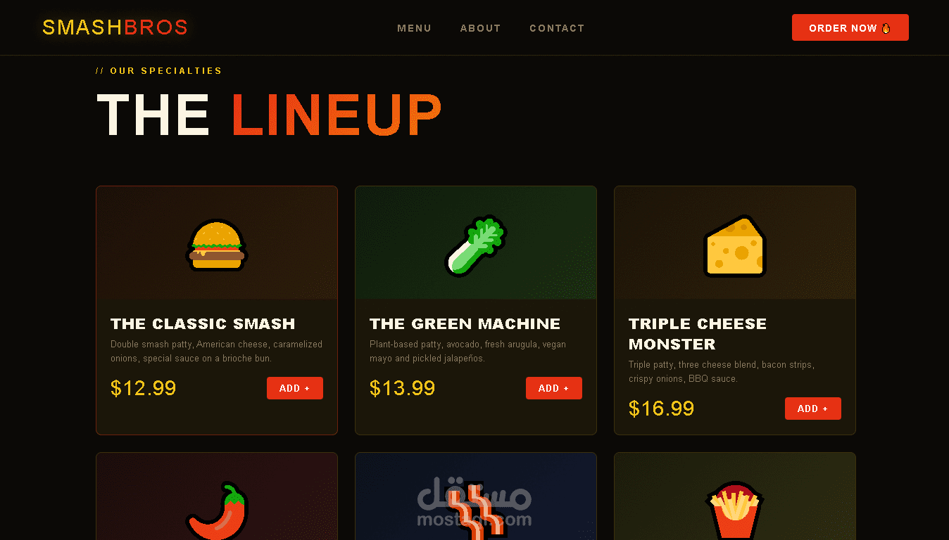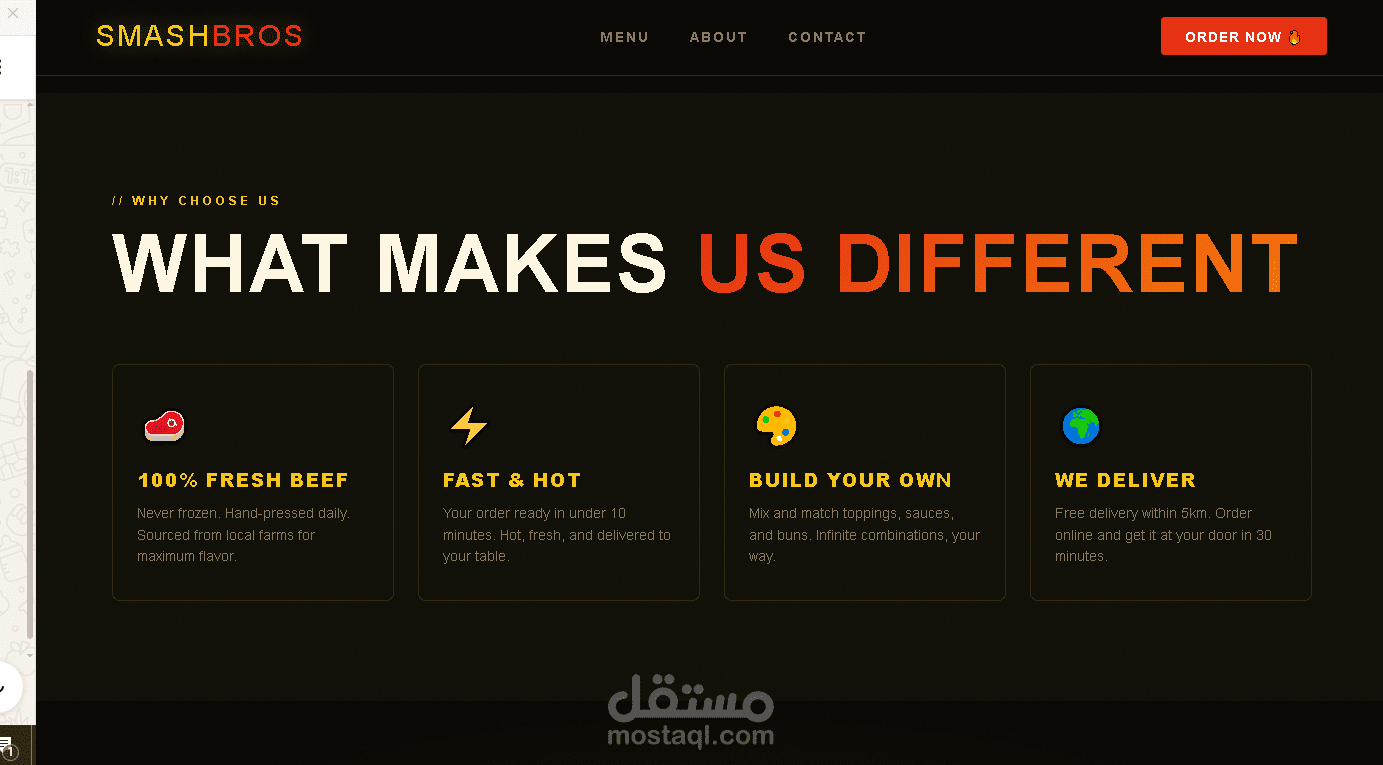 موقع Landing Page احترافي لمطعم برغر أمريكي. مبني بـ HTML وCSS وJavaScript مع تصميم عصري وجذاب ومتجاوب مع جميع الأجهزة. يتضمن قسم القائمة والعروض وتفاصيل المطعم.