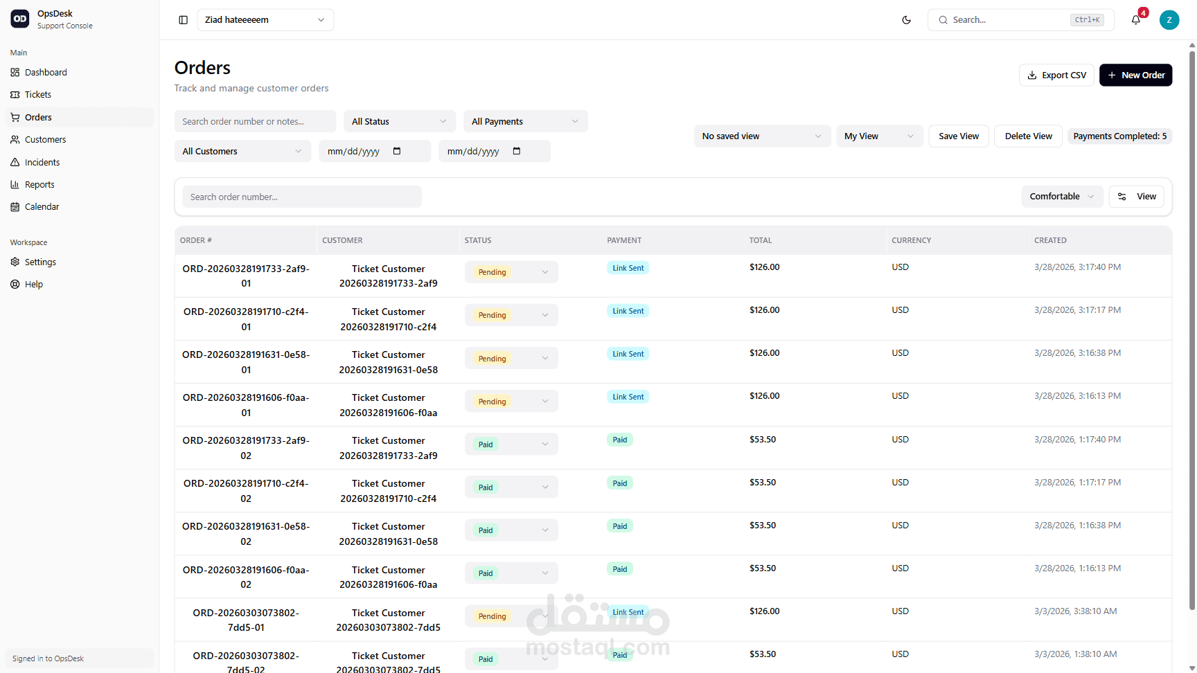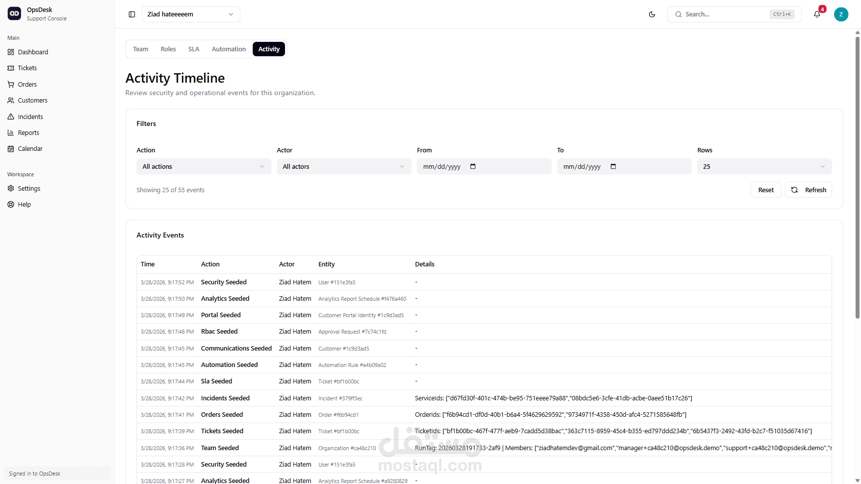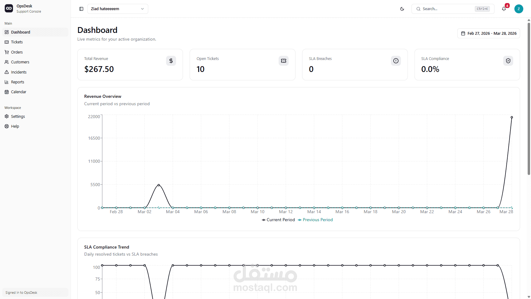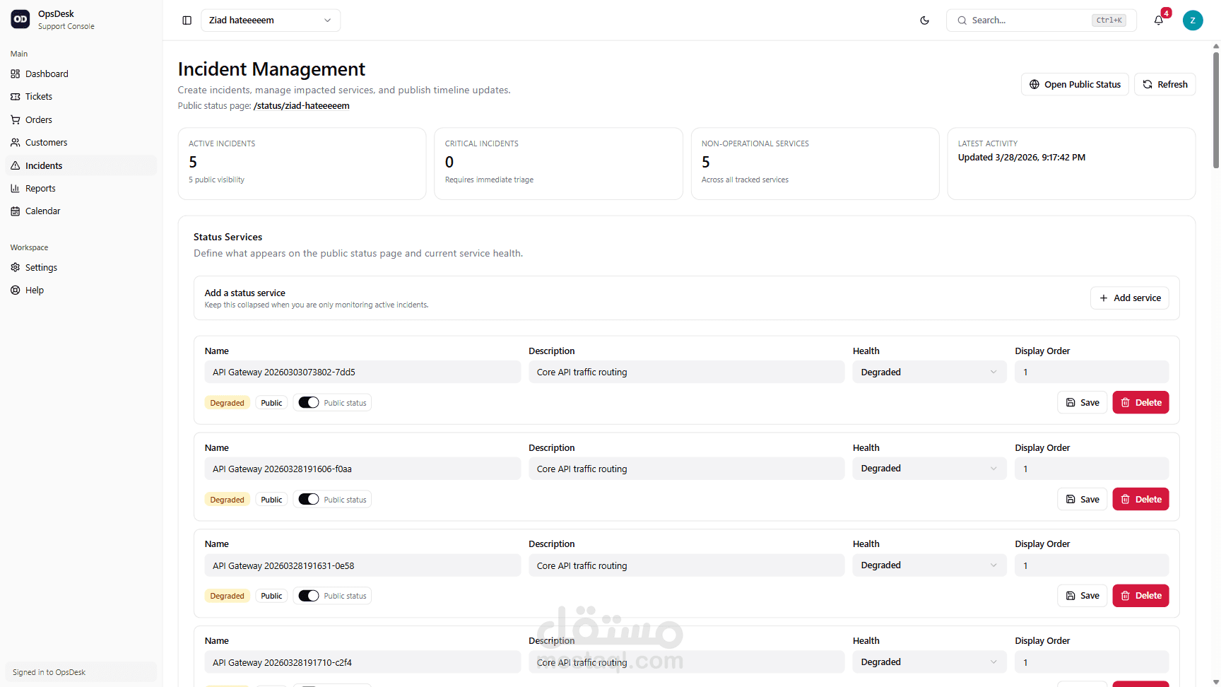 The platform supports multiple companies within one system with full data isolation, role-based access control, support ticket management, customer and order tracking, Stripe payment integration, realtime updates, incident management with a public status page, a customer portal, reporting dashboards, and audit logs for sensitive actions.