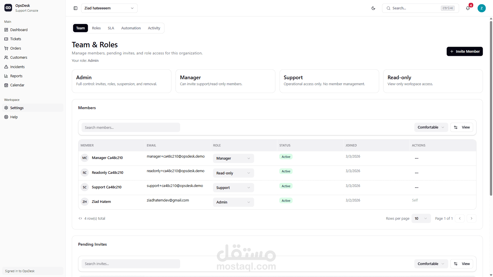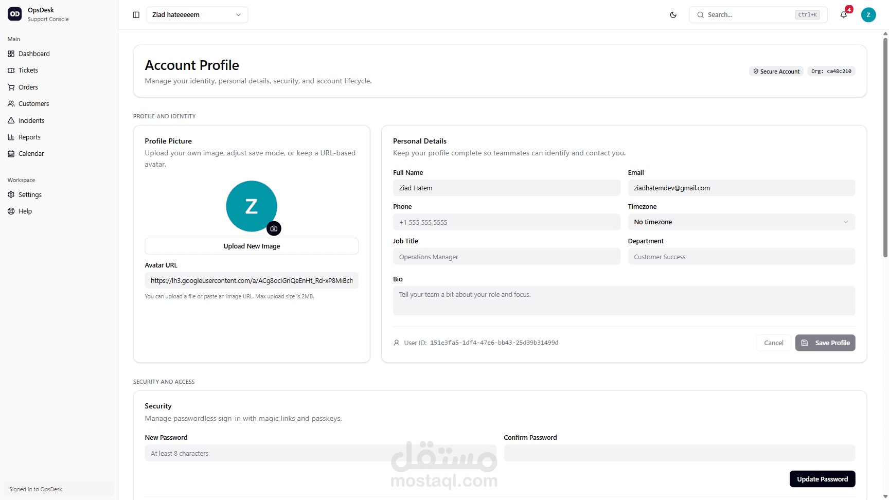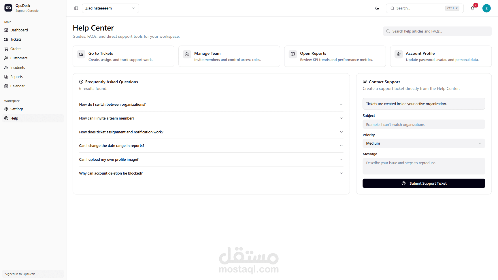 تدعم المنصة إدارة عدة شركات داخل نفس النظام مع عزل كامل للبيانات، بالإضافة إلى نظام صلاحيات يحدد وصول كل مستخدم، وإدارة تذاكر الدعم، ومتابعة العملاء والطلبات، والتكامل مع Stripe، والتحديثات اللحظية، وإدارة الحوادث مع صفحة حالة عامة، وبوابة خاصة للعملاء، ولوحات تقارير، وسجل تدقيق لمتابعة العمليات الحساسة.