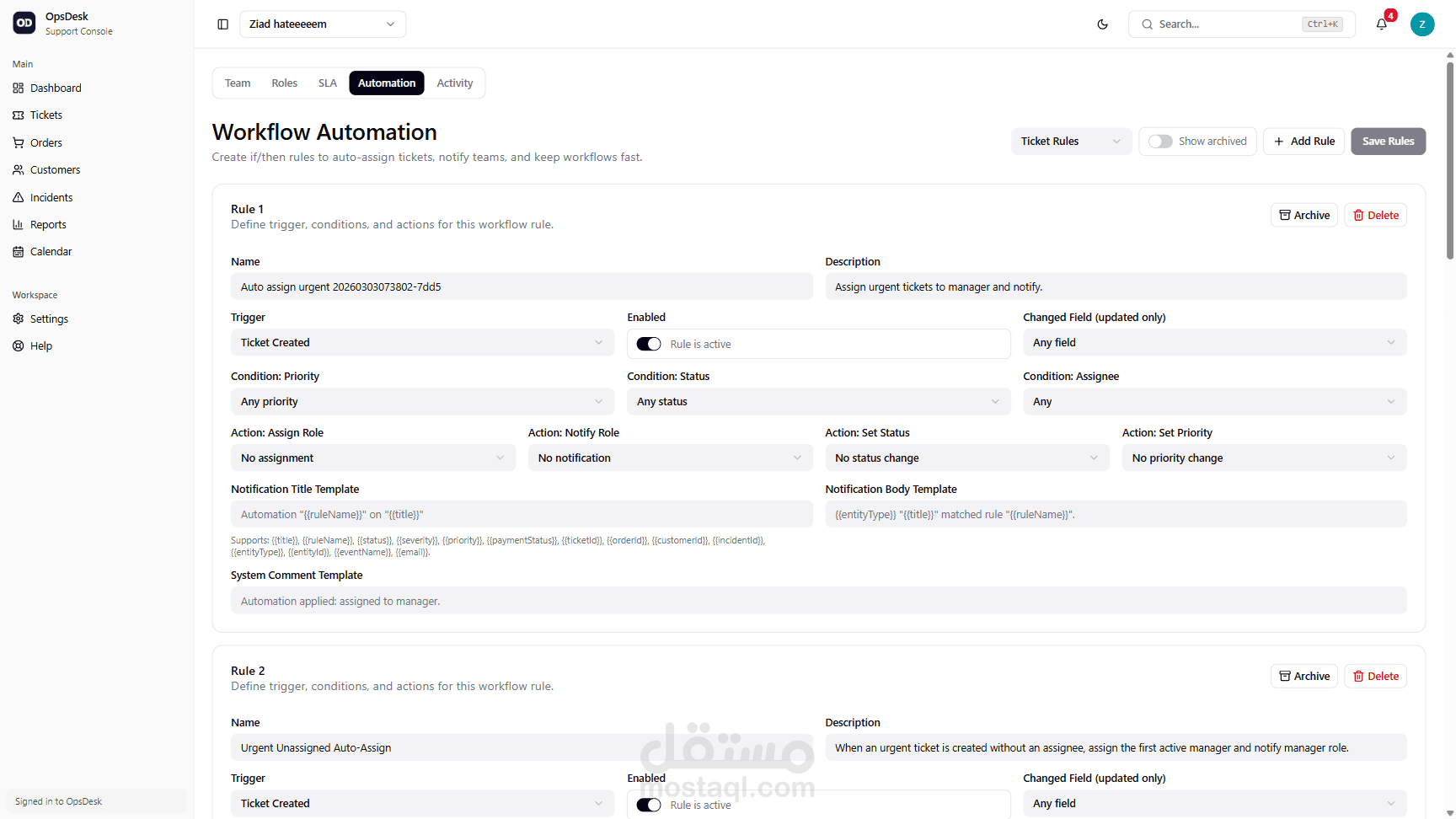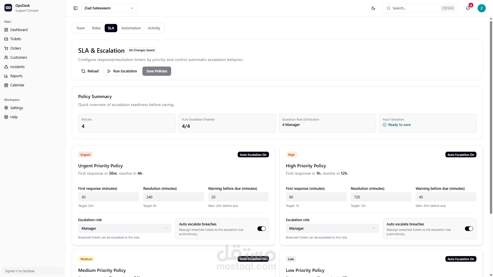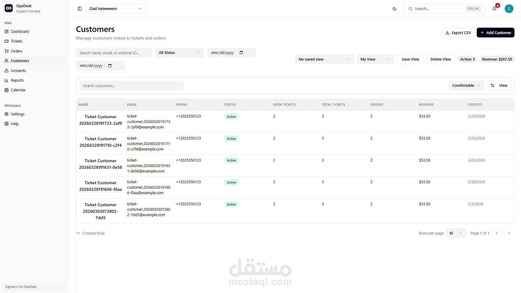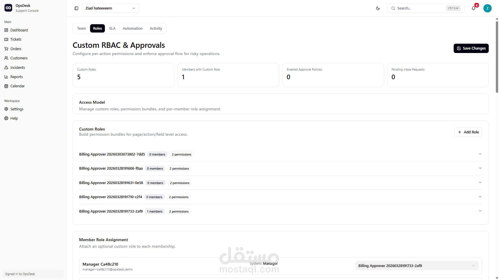 تدعم المنصة إدارة عدة شركات داخل نفس النظام مع عزل كامل للبيانات، بالإضافة إلى نظام صلاحيات يحدد وصول كل مستخدم، وإدارة تذاكر الدعم، ومتابعة العملاء والطلبات، والتكامل مع Stripe، والتحديثات اللحظية، وإدارة الحوادث مع صفحة حالة عامة، وبوابة خاصة للعملاء، ولوحات تقارير، وسجل تدقيق لمتابعة العمليات الحساسة.