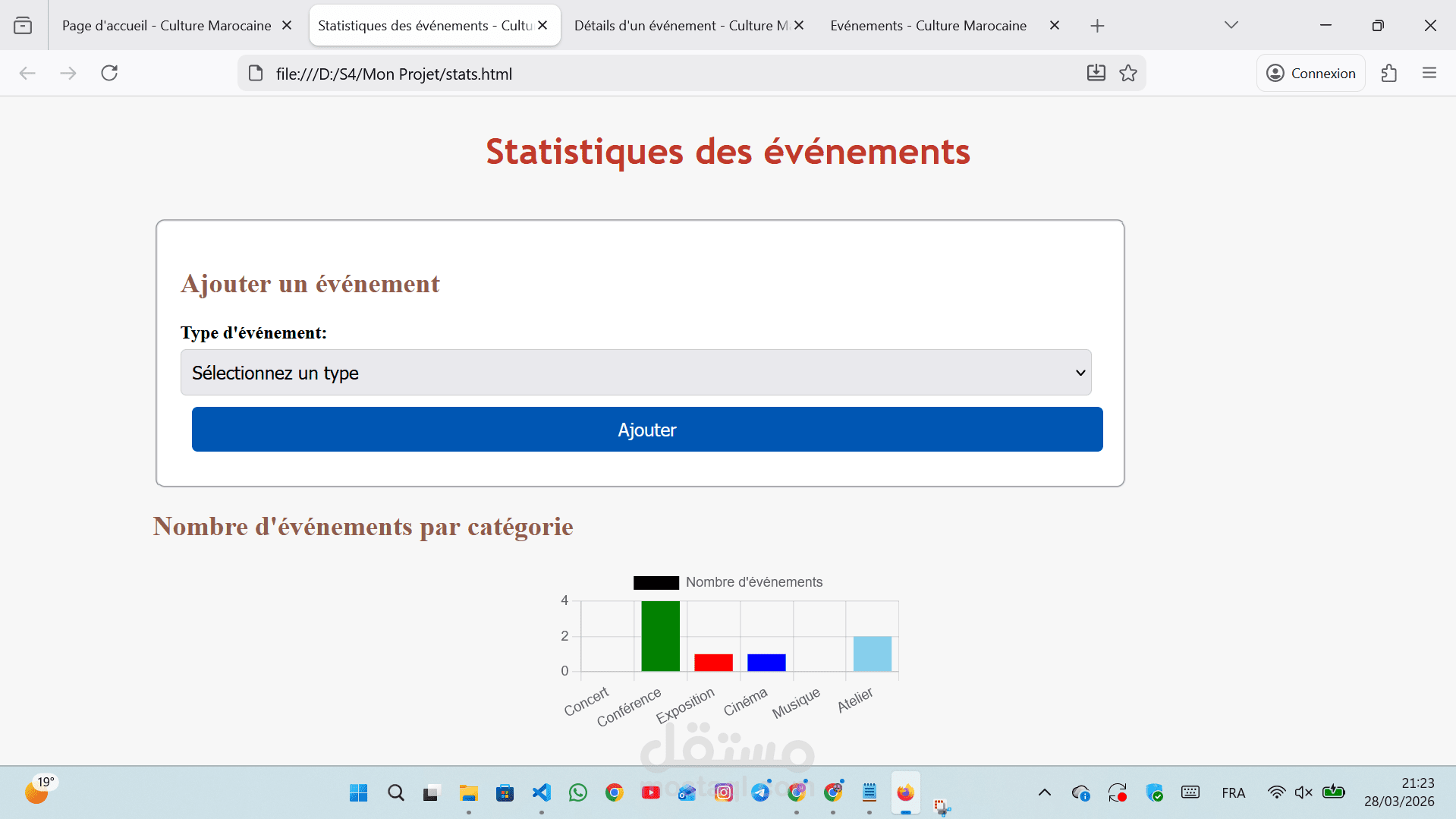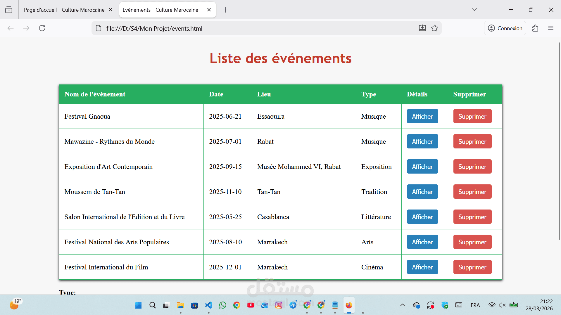 هذا المشروع عبارة عن موقع ويب لتسيير وعرض الفعاليات الثقافية والفنية بالمغرب، تم تطويره كجزء من متطلبات دراستي الجامعية. يهدف الموقع إلى تسهيل متابعة وتنظيم الأحداث، وتمكين المستخدمين من الوصول إلى معلومات دقيقة حول الفعاليات المختلفة بسهولة وسرعة.
