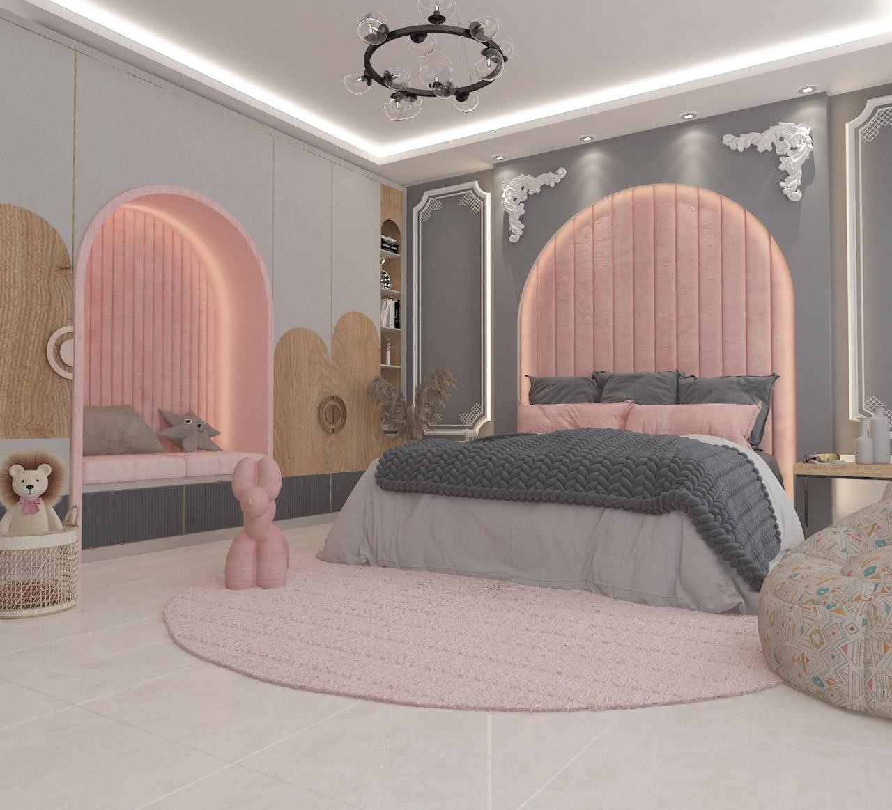 This project showcases a sophisticated kid’s bedroom design that balances luxury with playfulness. The color palette revolves around charcoal grey and soft blush pink, creating a serene yet imaginative atmosphere. The design highlights the seamless integration of classic wall moldings with modern indirect lighting, providing a sense of depth and architectural elegance.