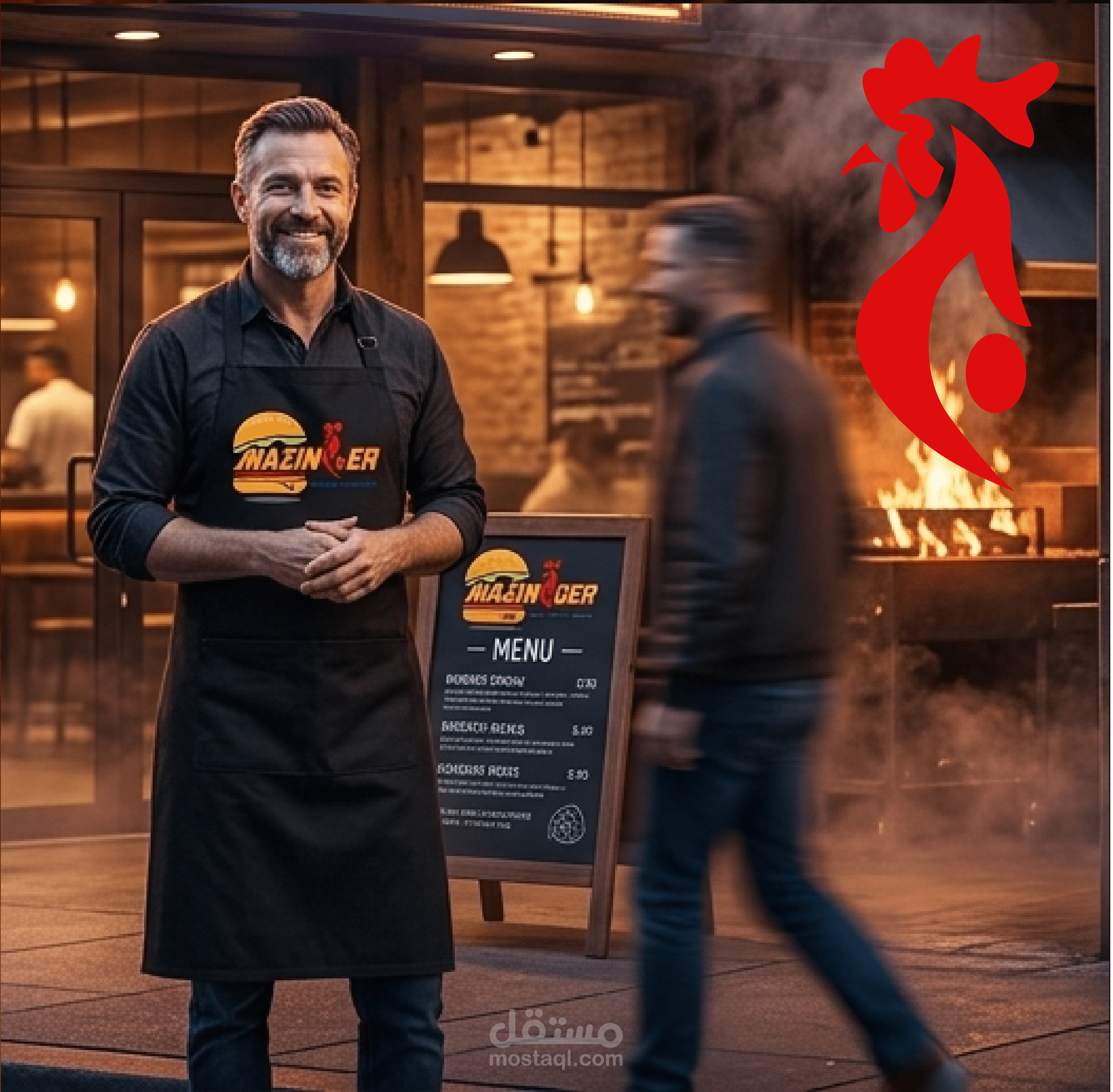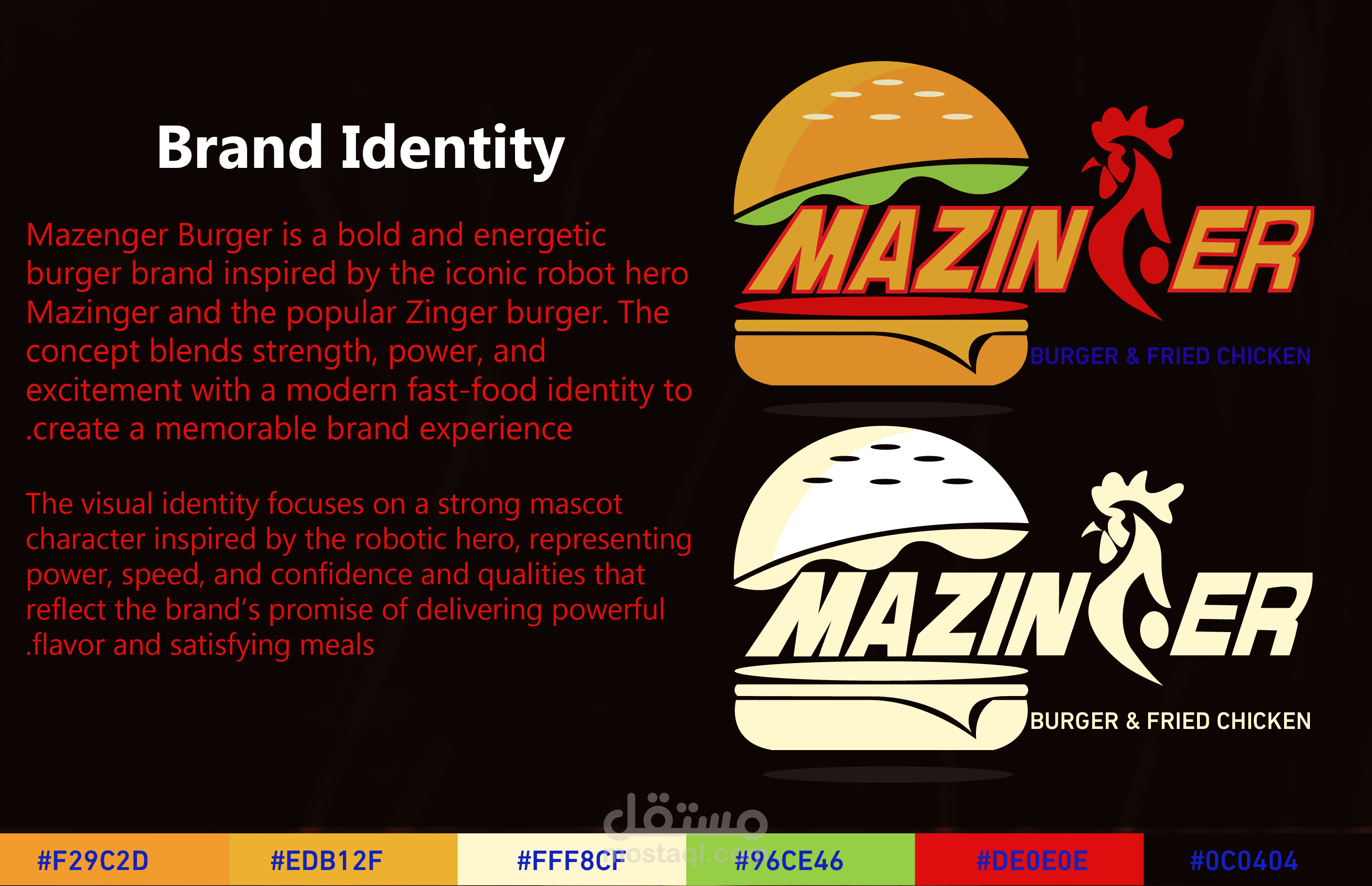 Zinger burger. The concept blends strength, power, and excitement with a modern fast-food identity to create a memorable brand experience. The visual identity focuses on a strong mascot character inspired by the robotic hero, representing power, speed, and confidence and qualities that reflect the brand’s promise of delivering powerful flavor and satisfying meals