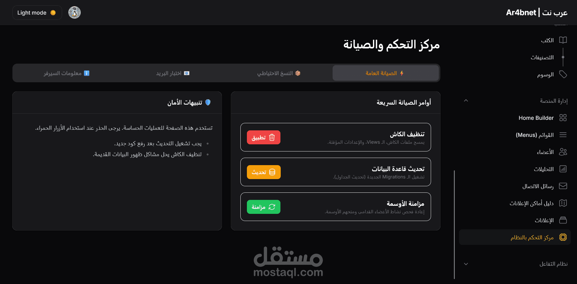 الإدارة والبنية: إدارة إعلانات بمواضع متعددة، SEO ومشاركة Open Graph، نسخ احتياطي وطوابير وRedis حسب توثيق السيرفر، وSystem Hub لأدوات الصيانة والبريد.