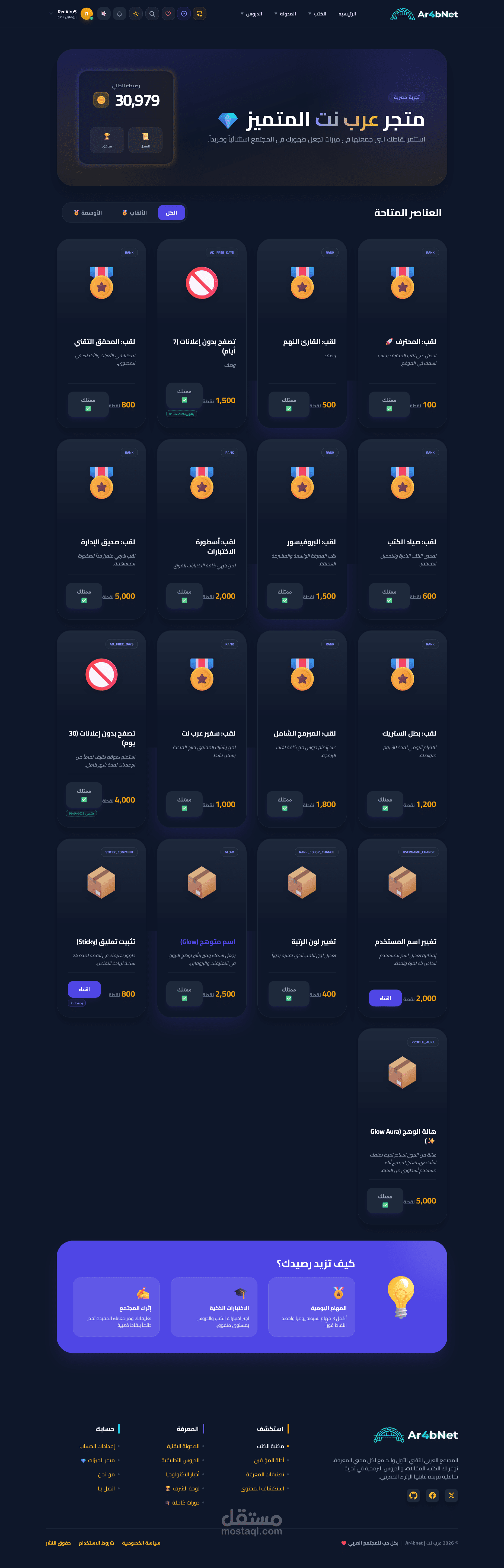 المجتمع واللعب: مهام يومية، لوحة متصدرين، أوسمة، متجر نقاط لألقاب ومظاهر وتثبيت تعليقات وتصفح بلا إعلانات لفترات، وبطاقة إنجاز وQR وغيرها حسب الوثائق.