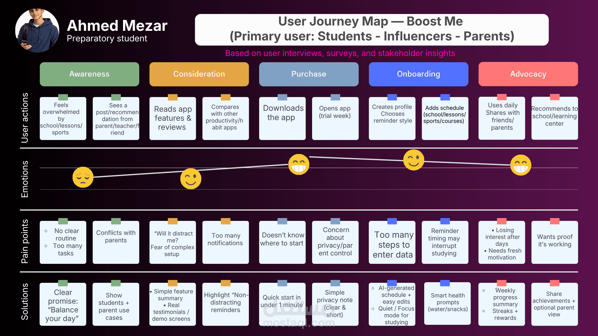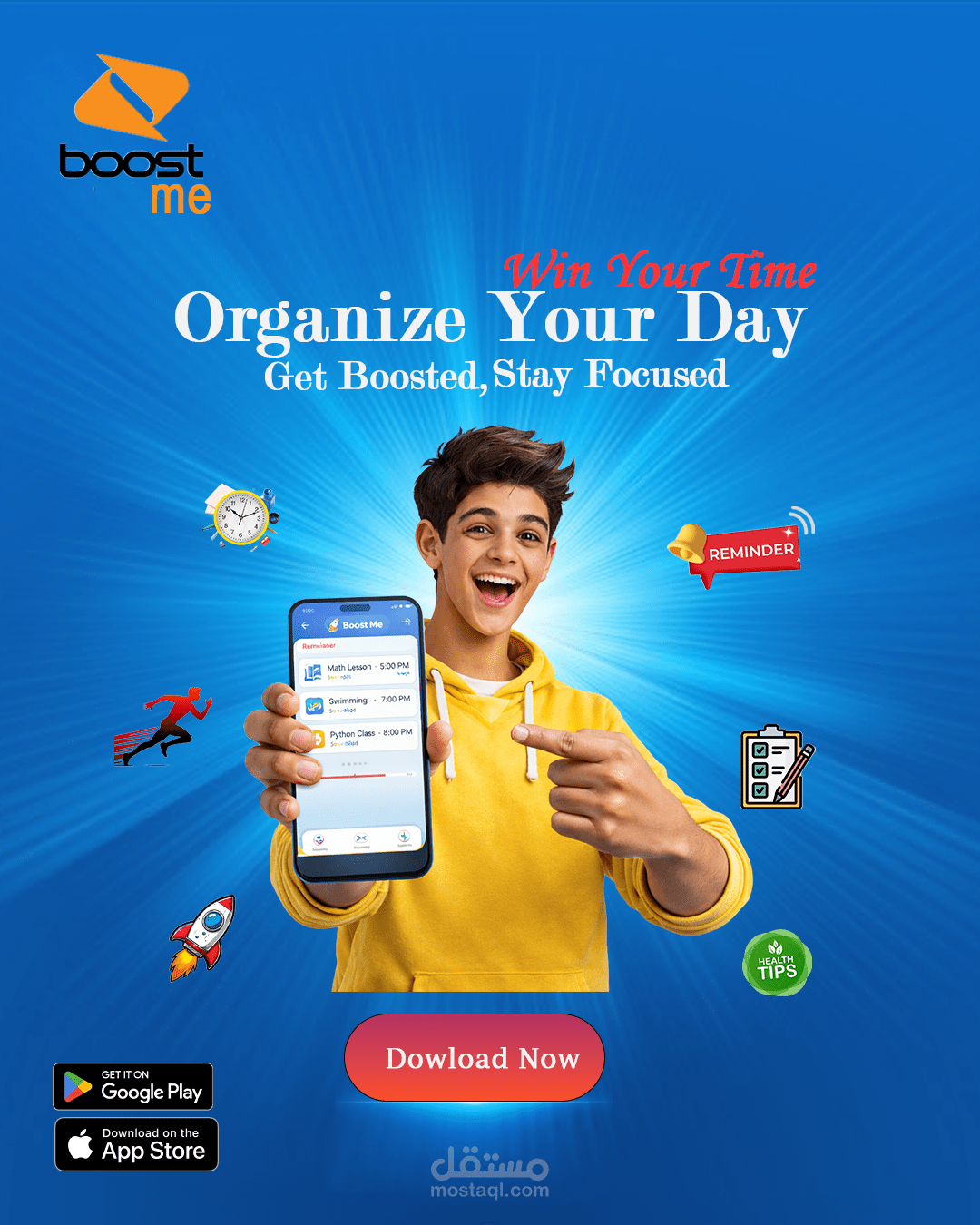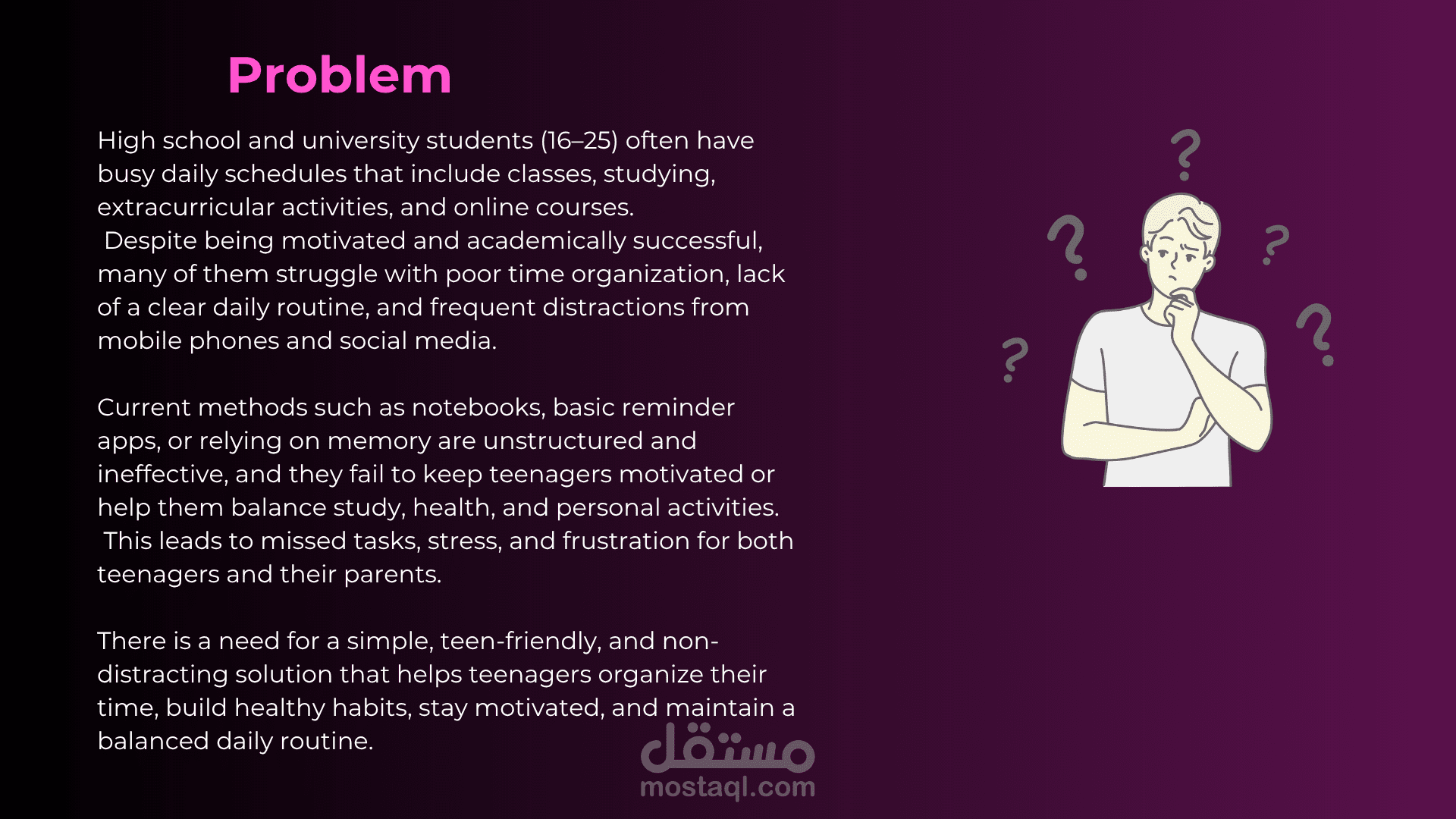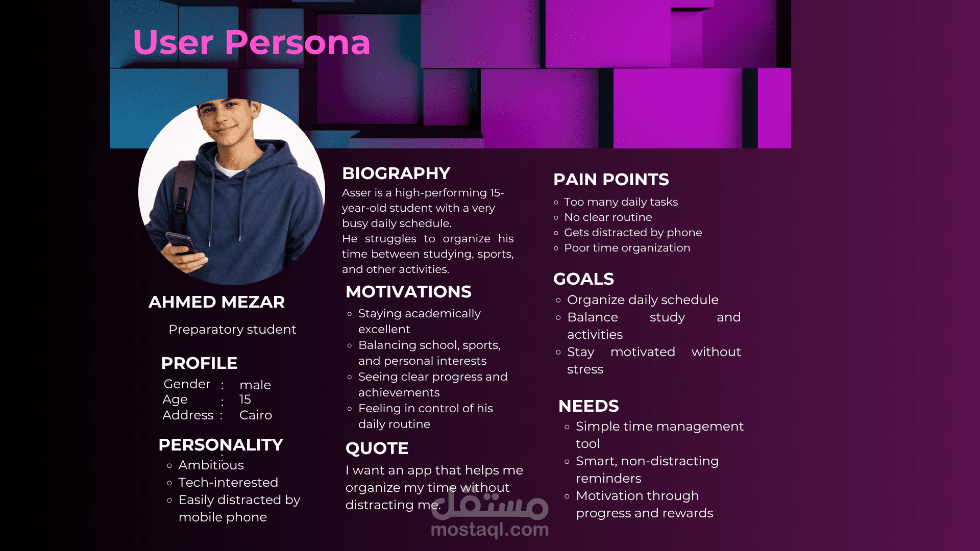 قمت بتصميم تجربة مستخدم وواجهة تطبيق موبايل يهدف إلى مساعدة المستخدمين، خاصة المراهقين، على تنظيم يومهم وبناء عادات صحية بطريقة بسيطة ومحفزة.