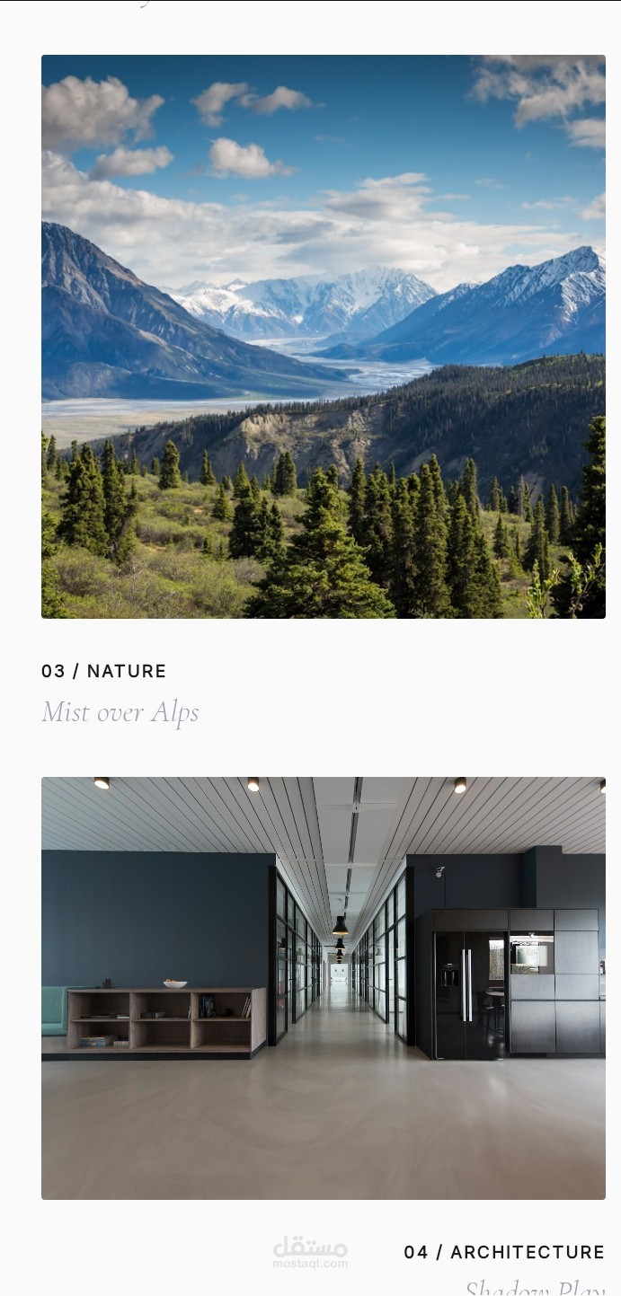 • تأثيرات حركية (Hover Effects): إضافة تأثير التكبير الناعم (Soft Zoom) وتغيير شفافية الصور عند التمرير لزيادة التفاعل.