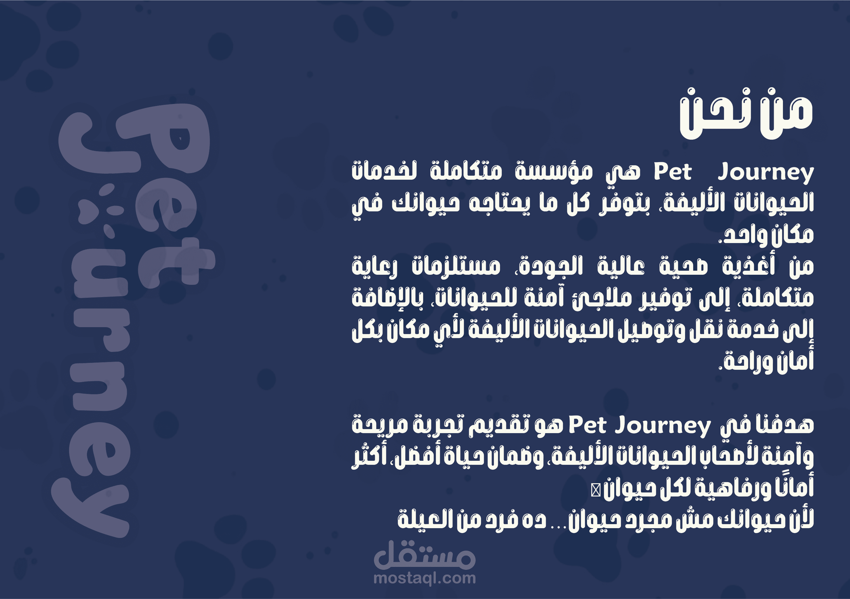 مشروع PET JOURNEY هو هوية بصرية متكاملة لبراند متخصص في مجال خدمات ومنتجات الحيوانات الأليفة، يهدف إلى تقديم تجربة مميزة تعكس العناية والاهتمام بالحيوان كرحلة مستمرة من الرعاية والحب.