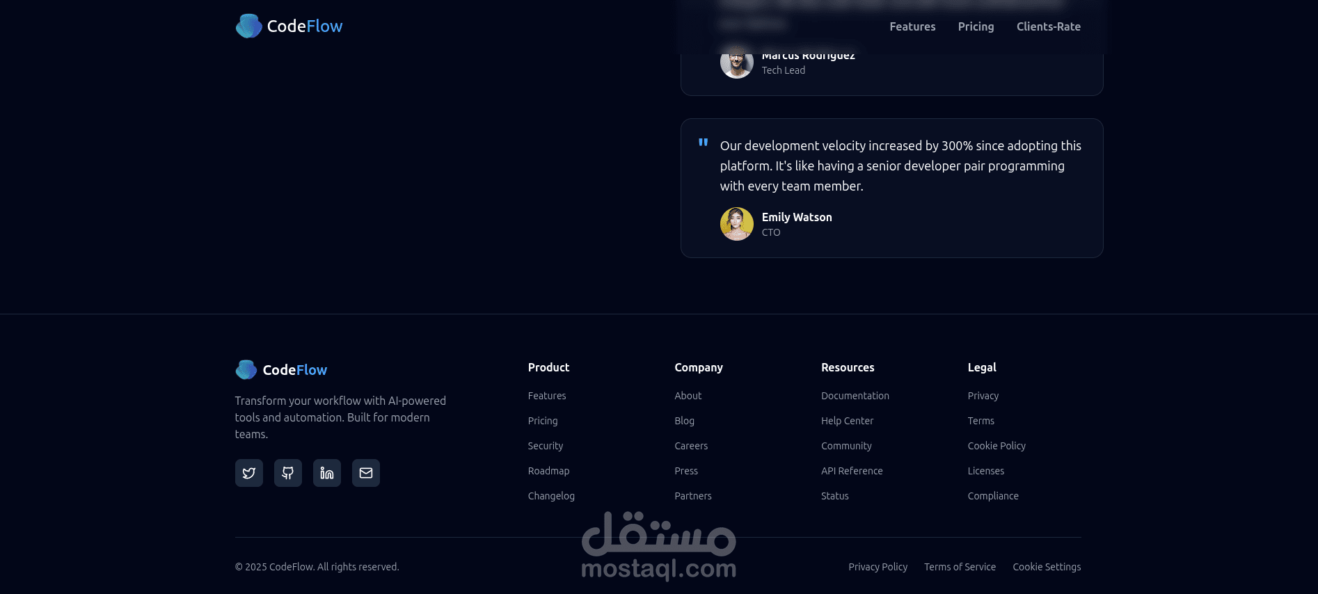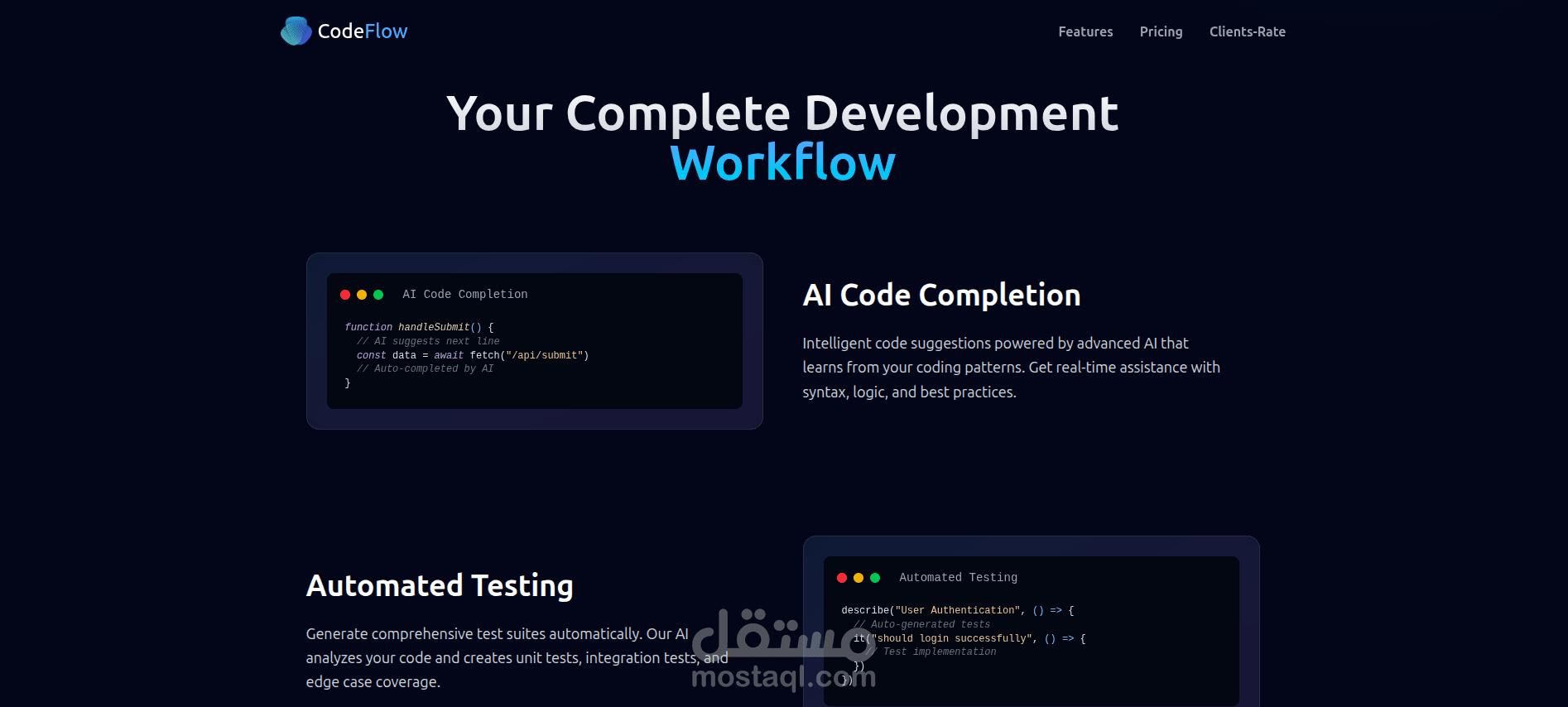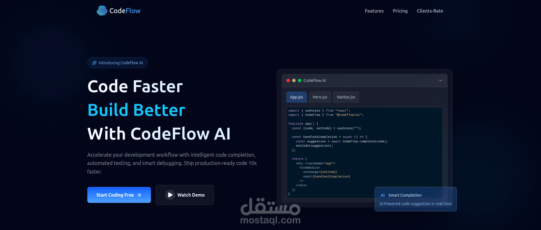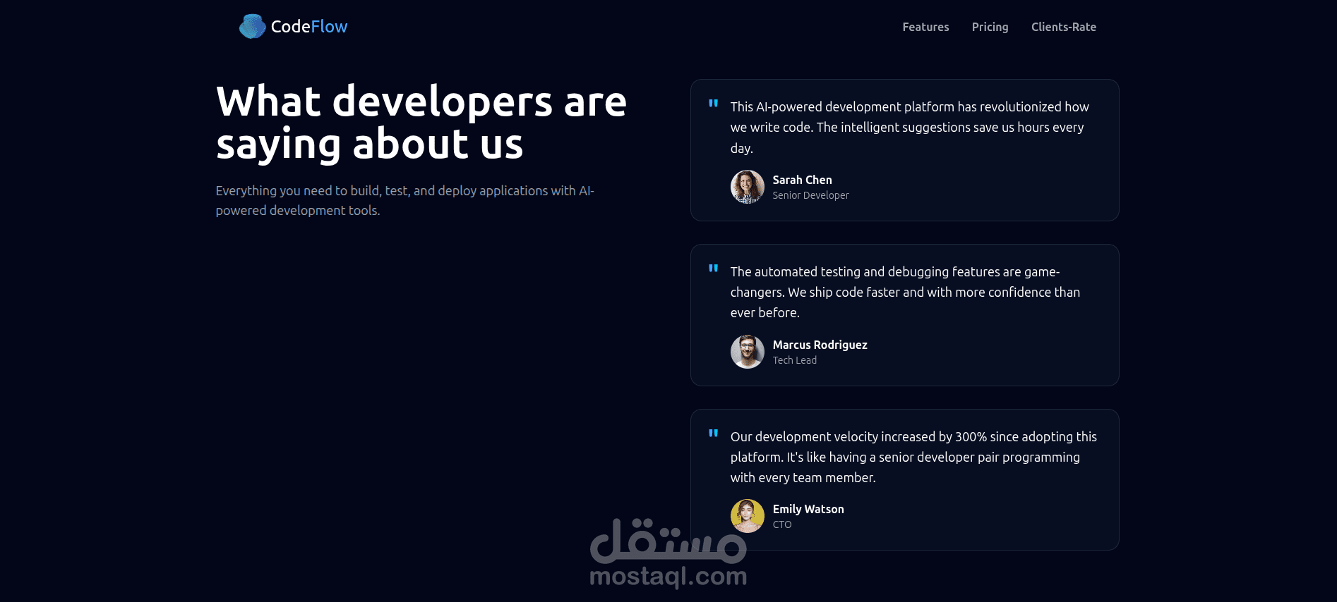 اشتغلت علي صفحه هبوط متكامله ومتجاوبه علي كل الاجهزه لعرض موقع ذكاء اصطناعي يساعد المبرمجين والمطورين علي انشاء مواقعهم وانجاز عملهم بسرعه اكبر