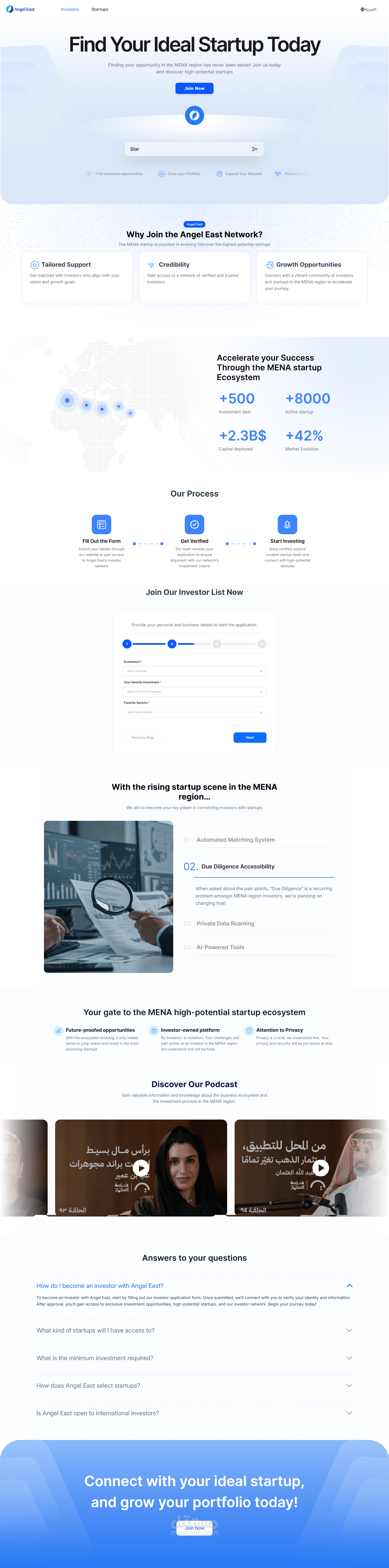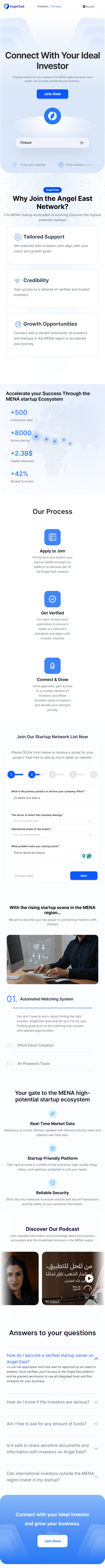 قمتُ ببناء منصة ويب متكاملة مصممة لربط الشركات الناشئة بالمستثمرين في منطقة الشرق الأوسط وشمال أفريقيا من خلال نظام مطابقة منظم وقابل للتطوير.