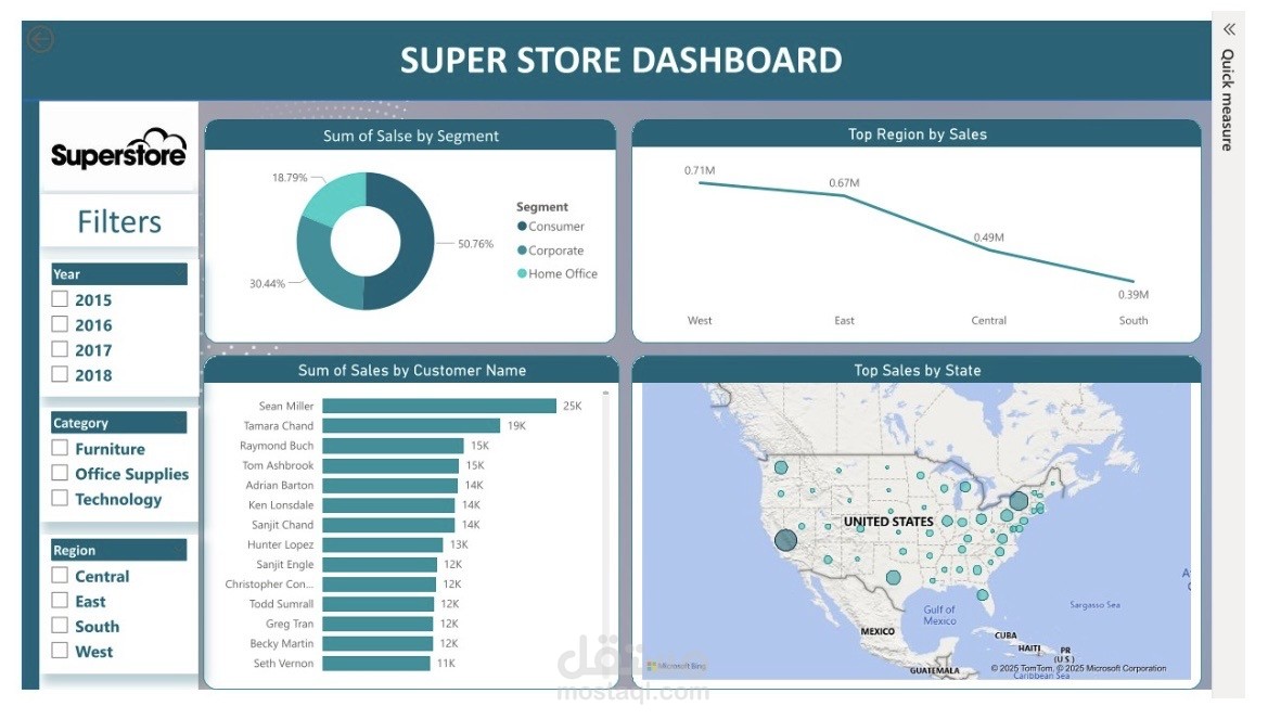قمت بتصميم وتطوير داشبورد تفاعلي احترافي لتحليل بيانات متجر (Super Store) باستخدام Power BI، بهدف تقديم رؤية واضحة وشاملة لأداء المبيعات واتخاذ قرارات مبنية على البيانات.